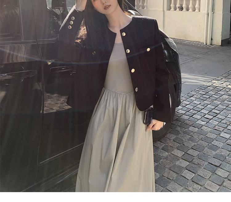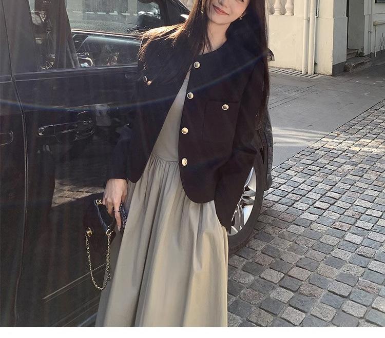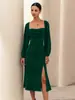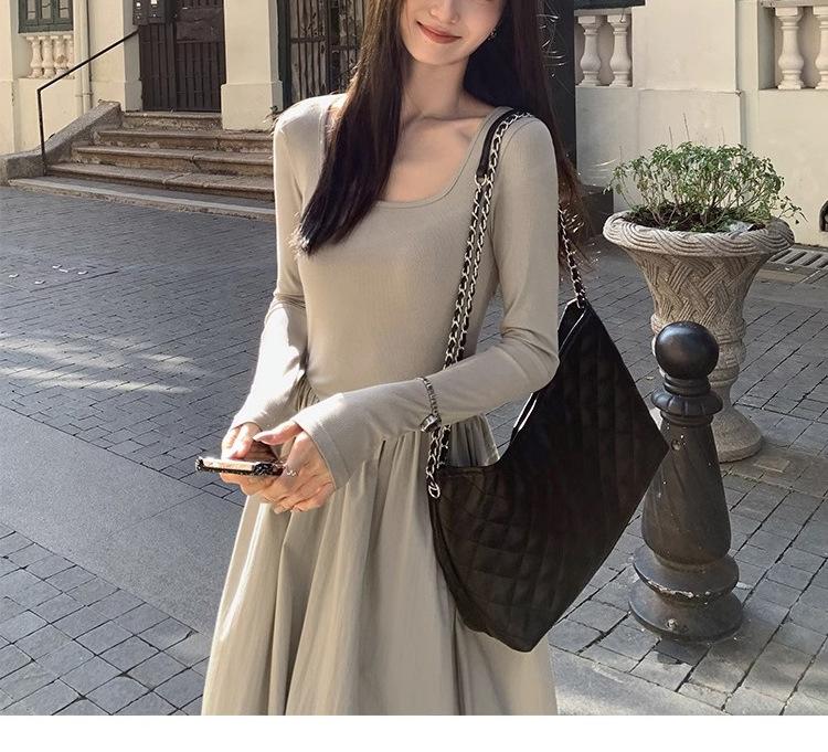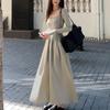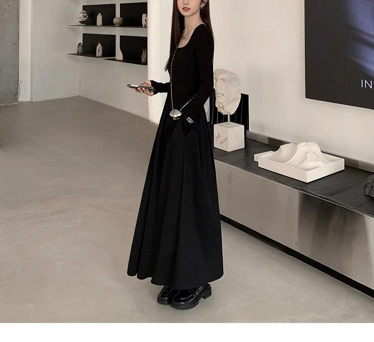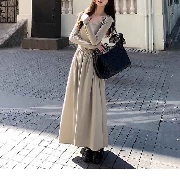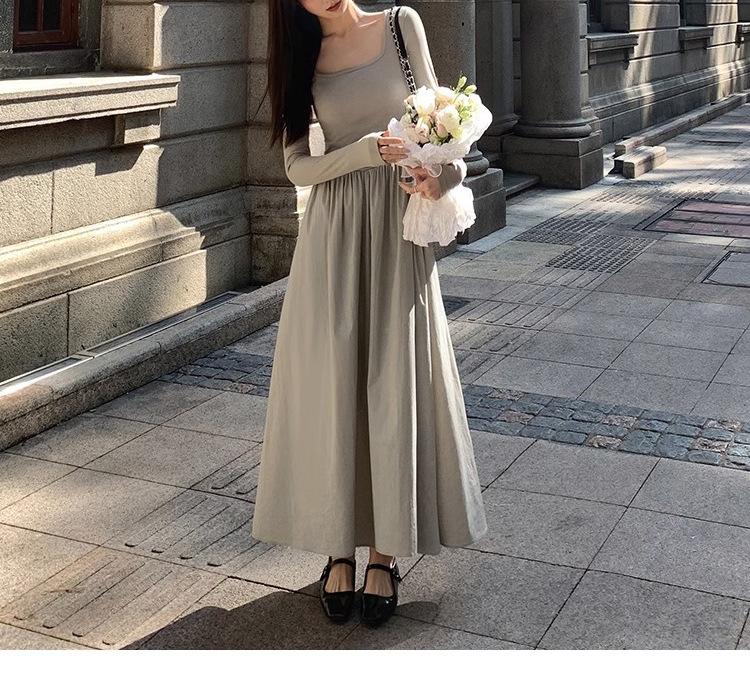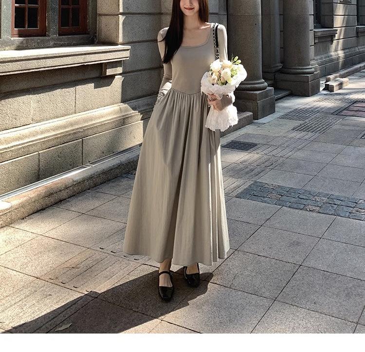 Vestido de cuello cuadrado estilo francés para mujer, primavera y otoño, nuevo, elegante, cintura ajustada, adelgazante, manga larga, negro, línea A, falda larga Ins