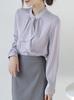 Camisa elegante francesa de diseño con lazo de cinta morado otoño de manga larga para mujer, temperamento de diseño para ir al trabajo