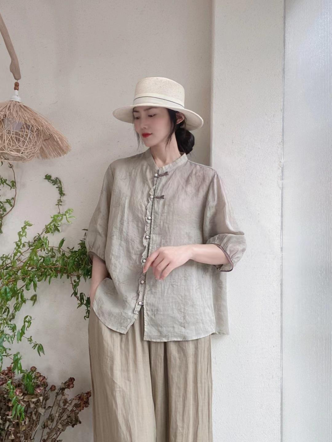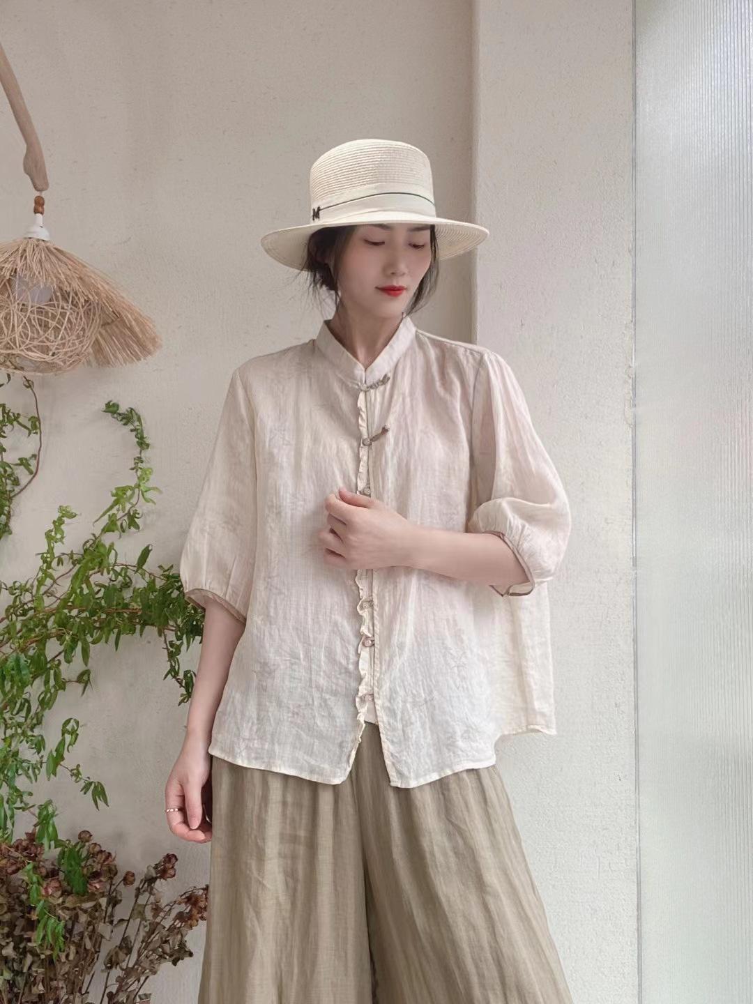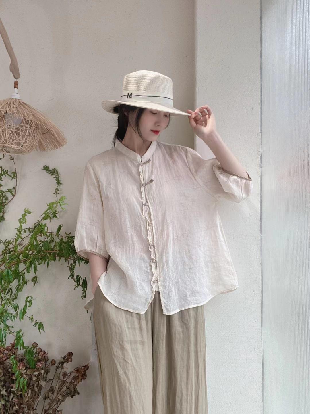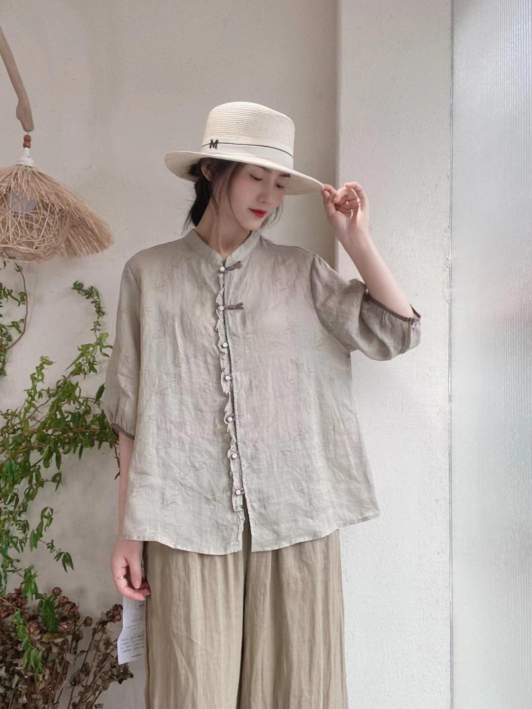 Camisa de ramio artística de verano, holgada, ligera y cómoda, de manga corta, 2024