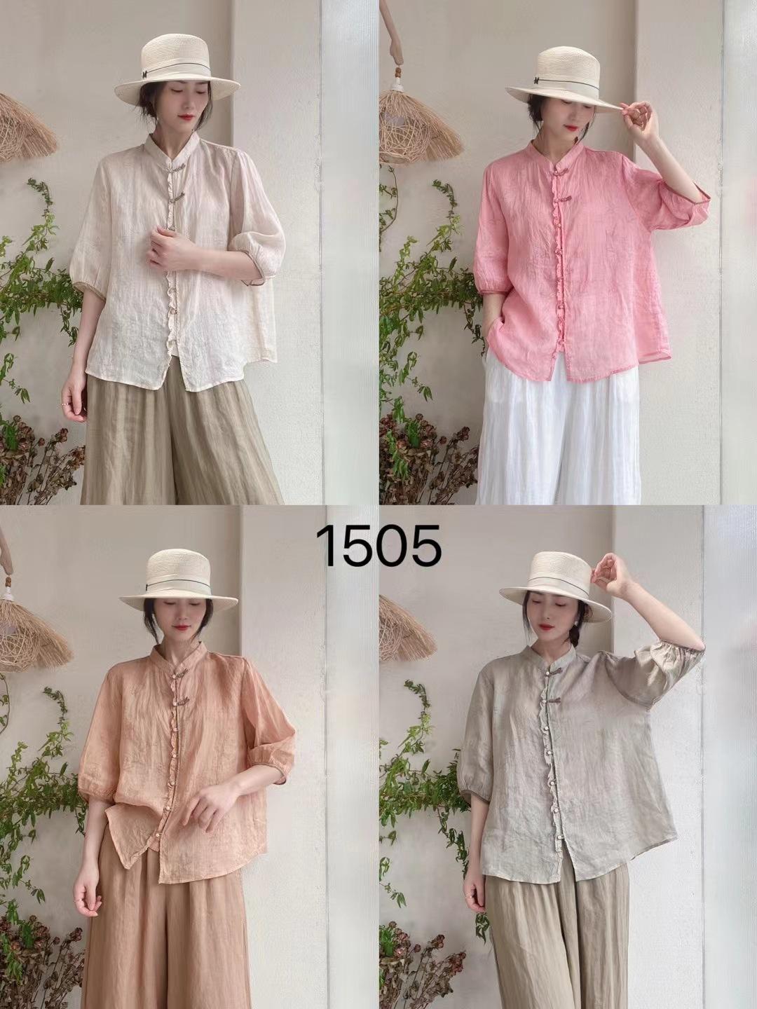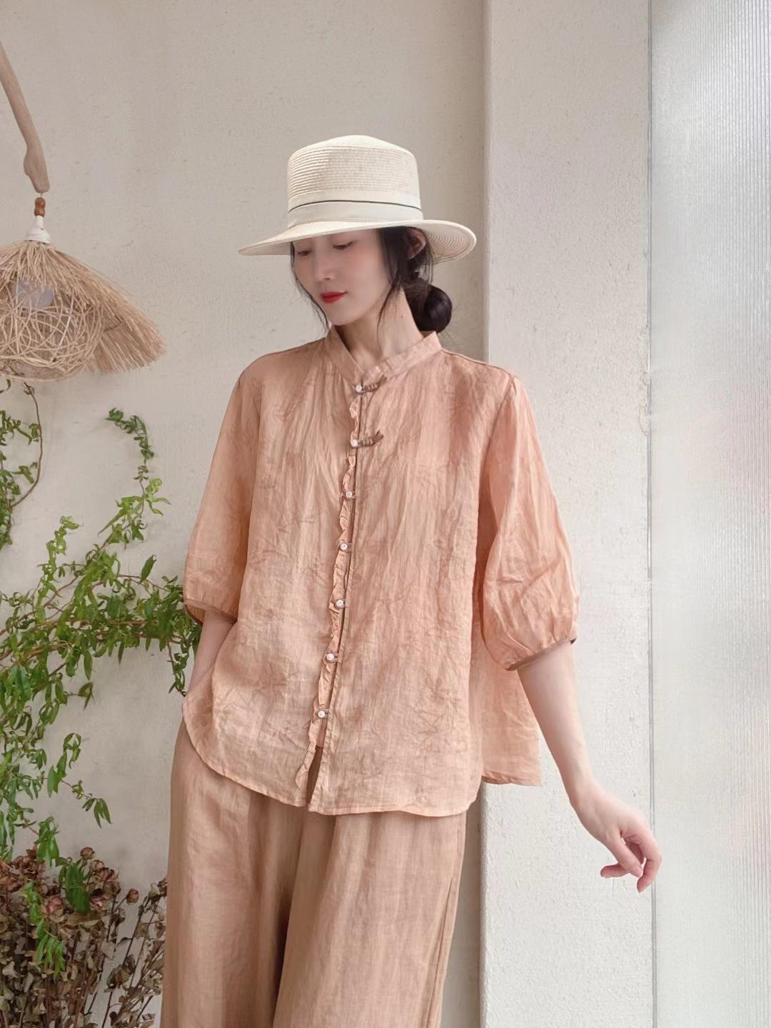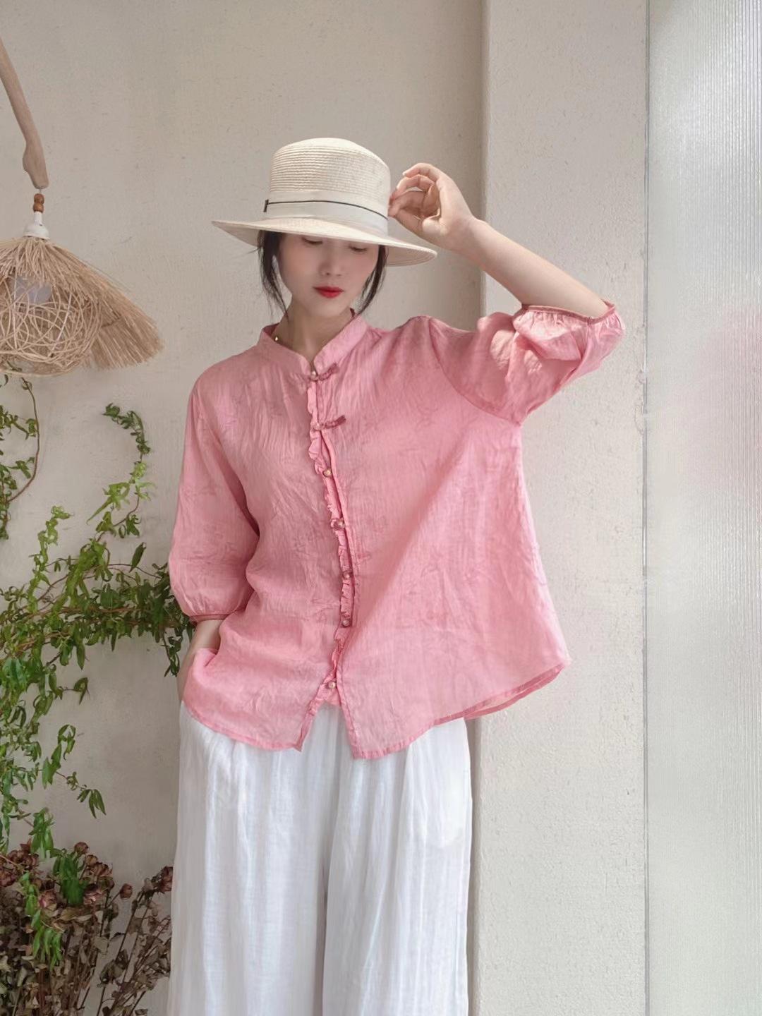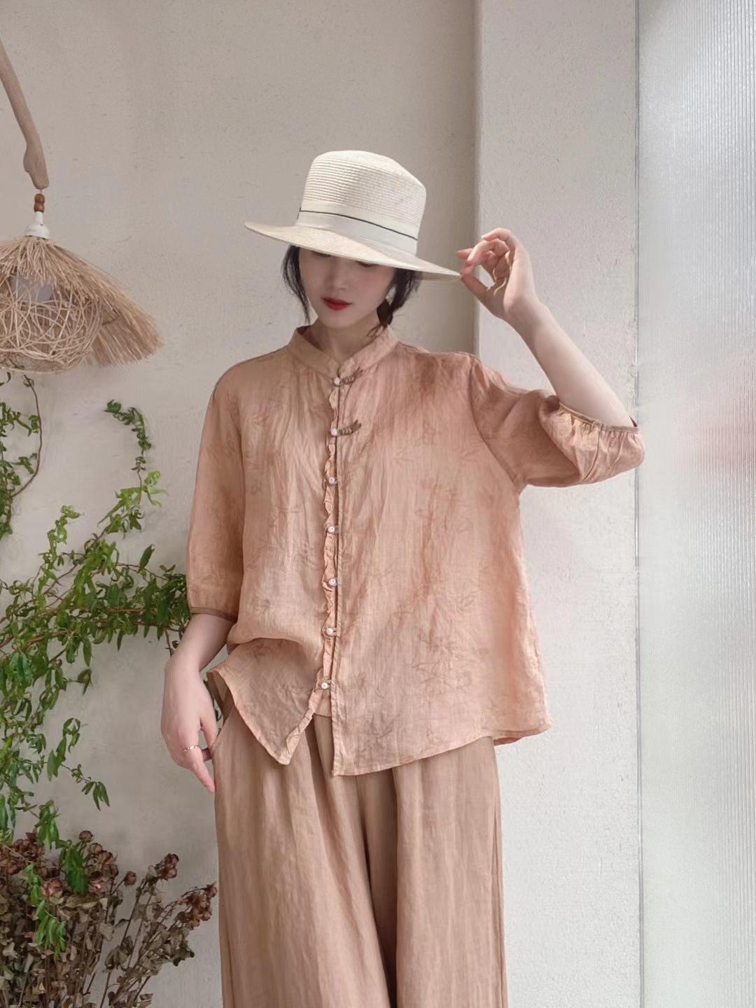 Camisa de ramio artística de verano, holgada, ligera y cómoda, de manga corta, 2024