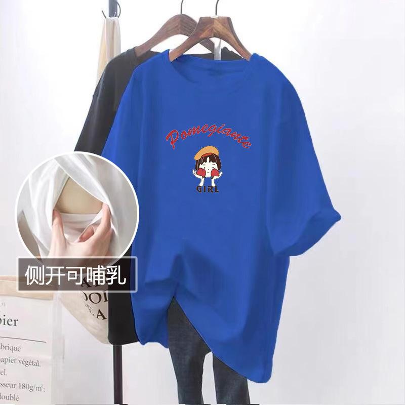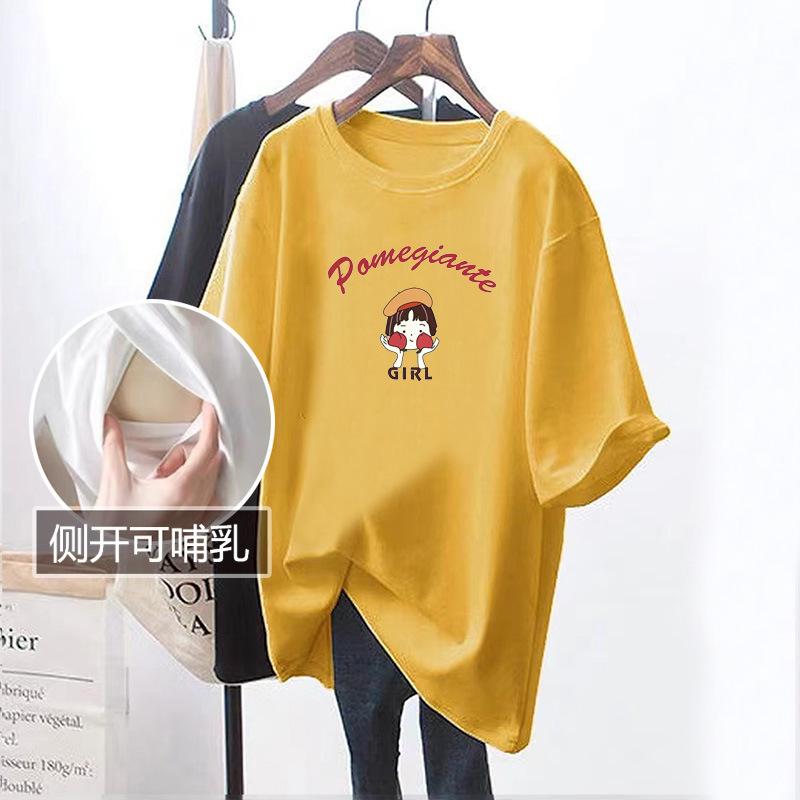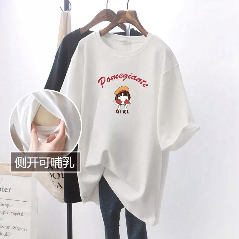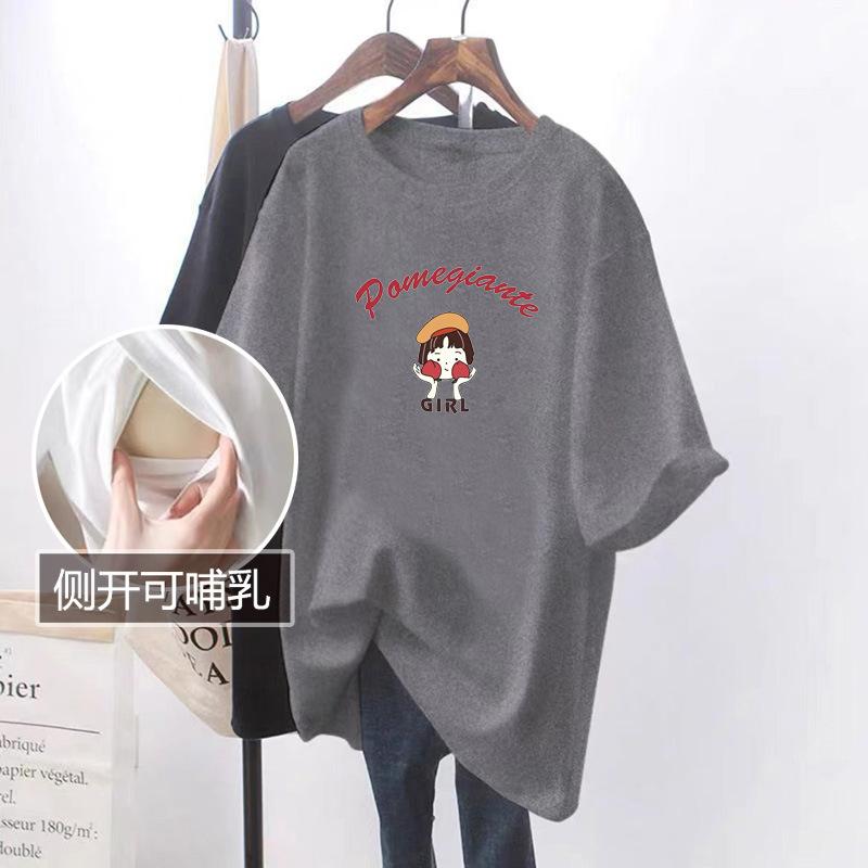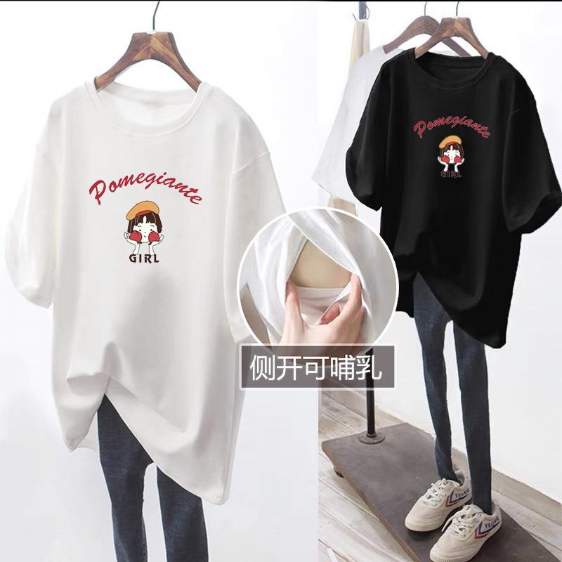 Camiseta de lactancia materna de verano para uso exterior con abertura lateral, manga corta, ropa de luna para salir, camiseta de lactancia materna, ropa de lactancia de longitud media, estilo sexy de mamá.