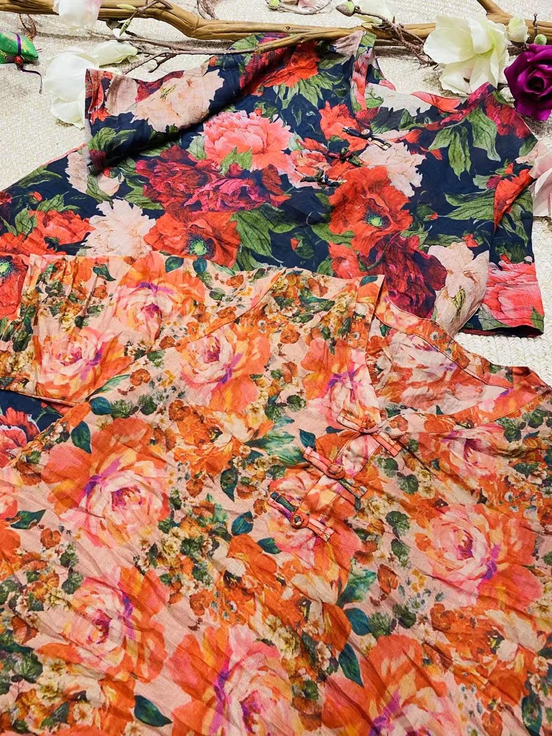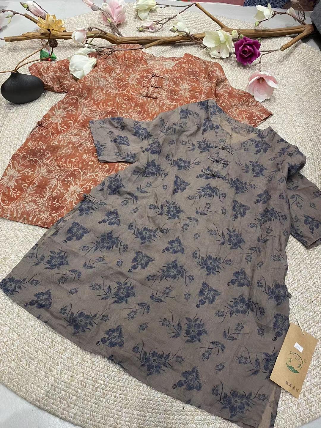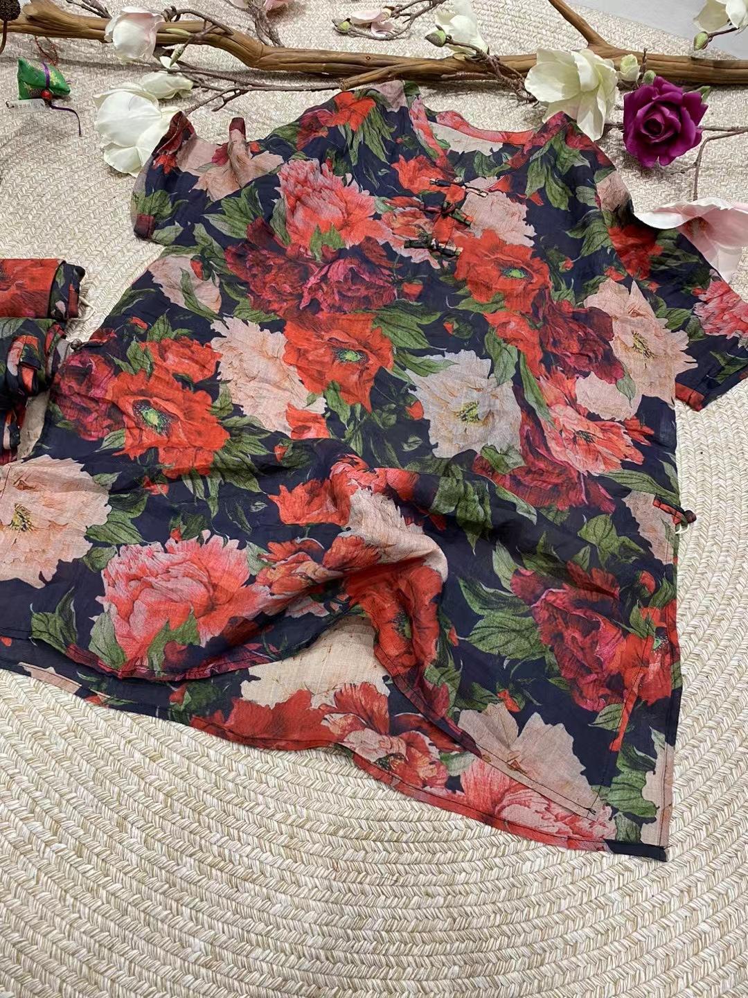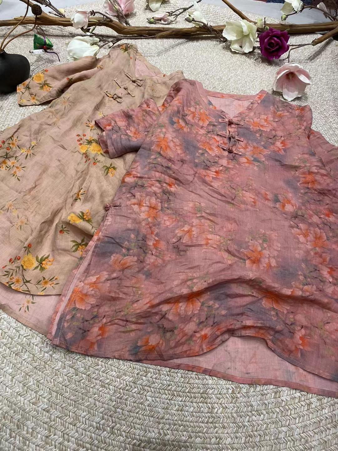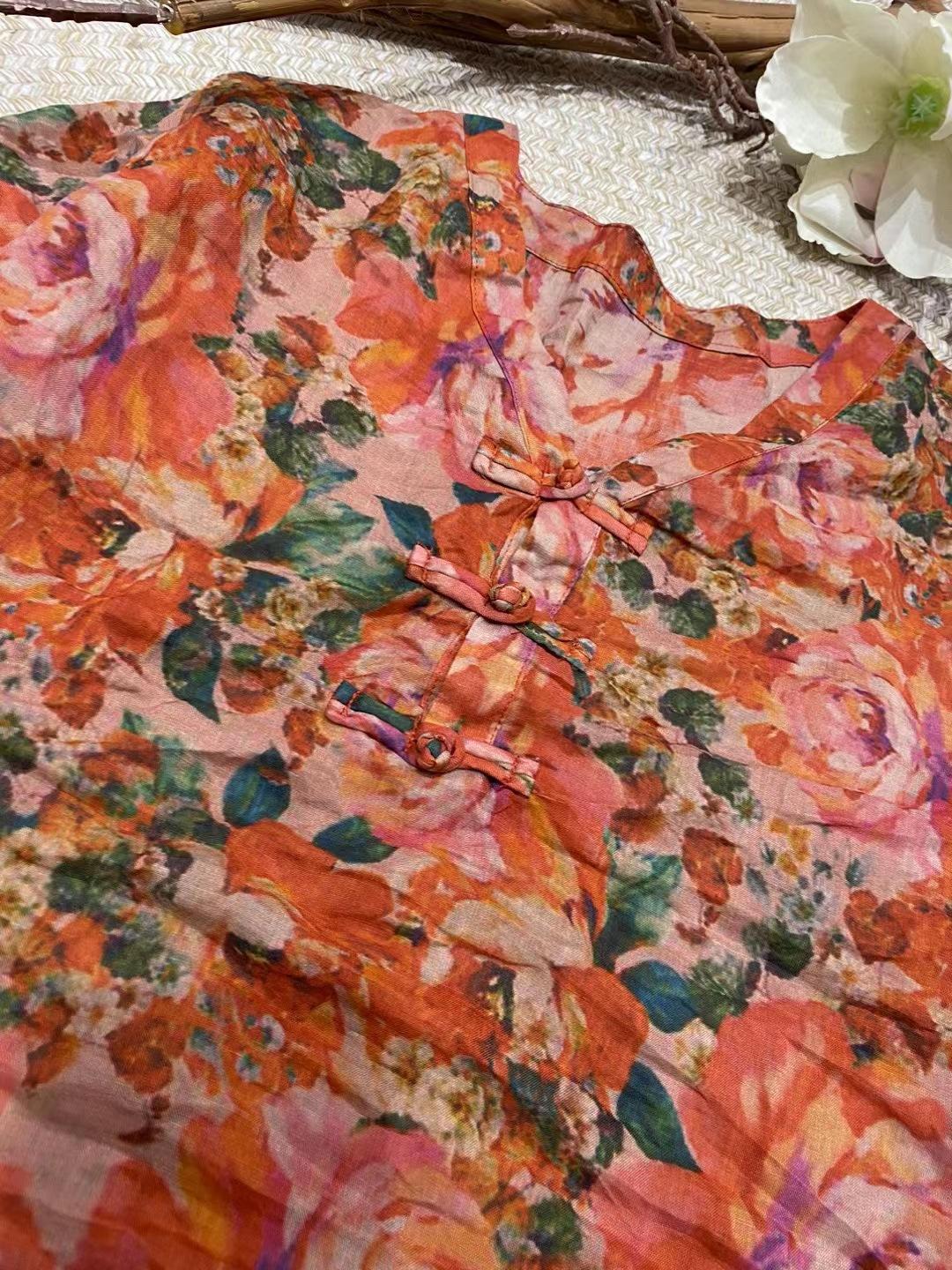 Verano 2024 Nuevo Camisa de Ramio de Diseño Holgado con Estampado y Cuello en V con Hebilla Camisa de Manga Corta de Largo Medio