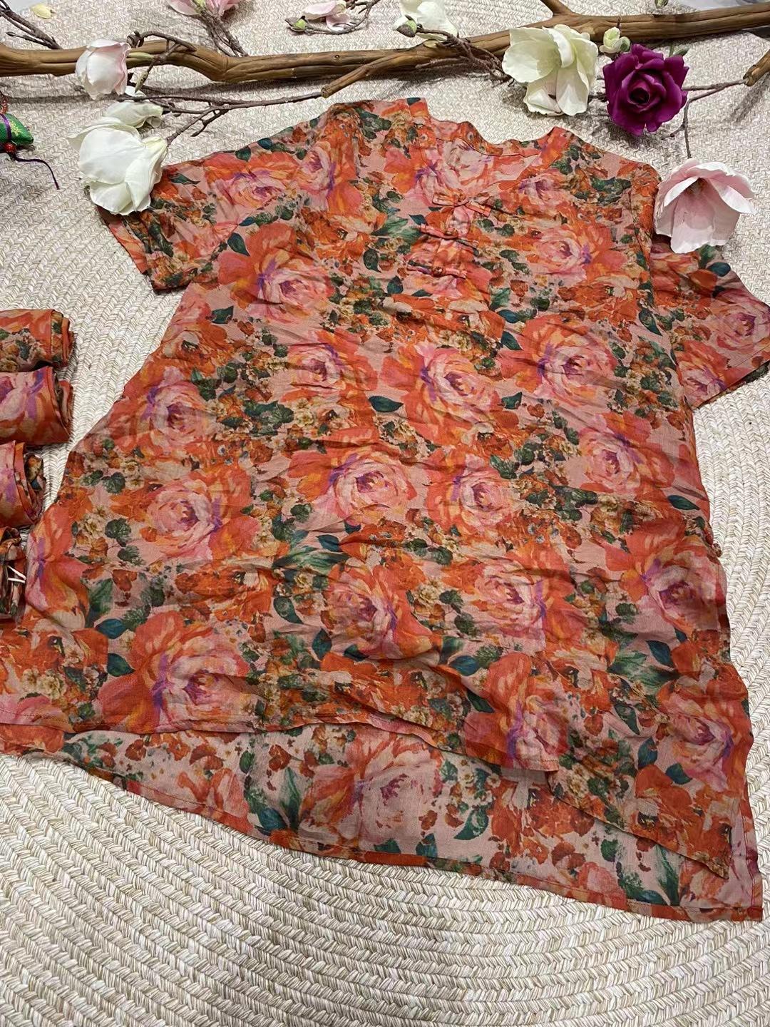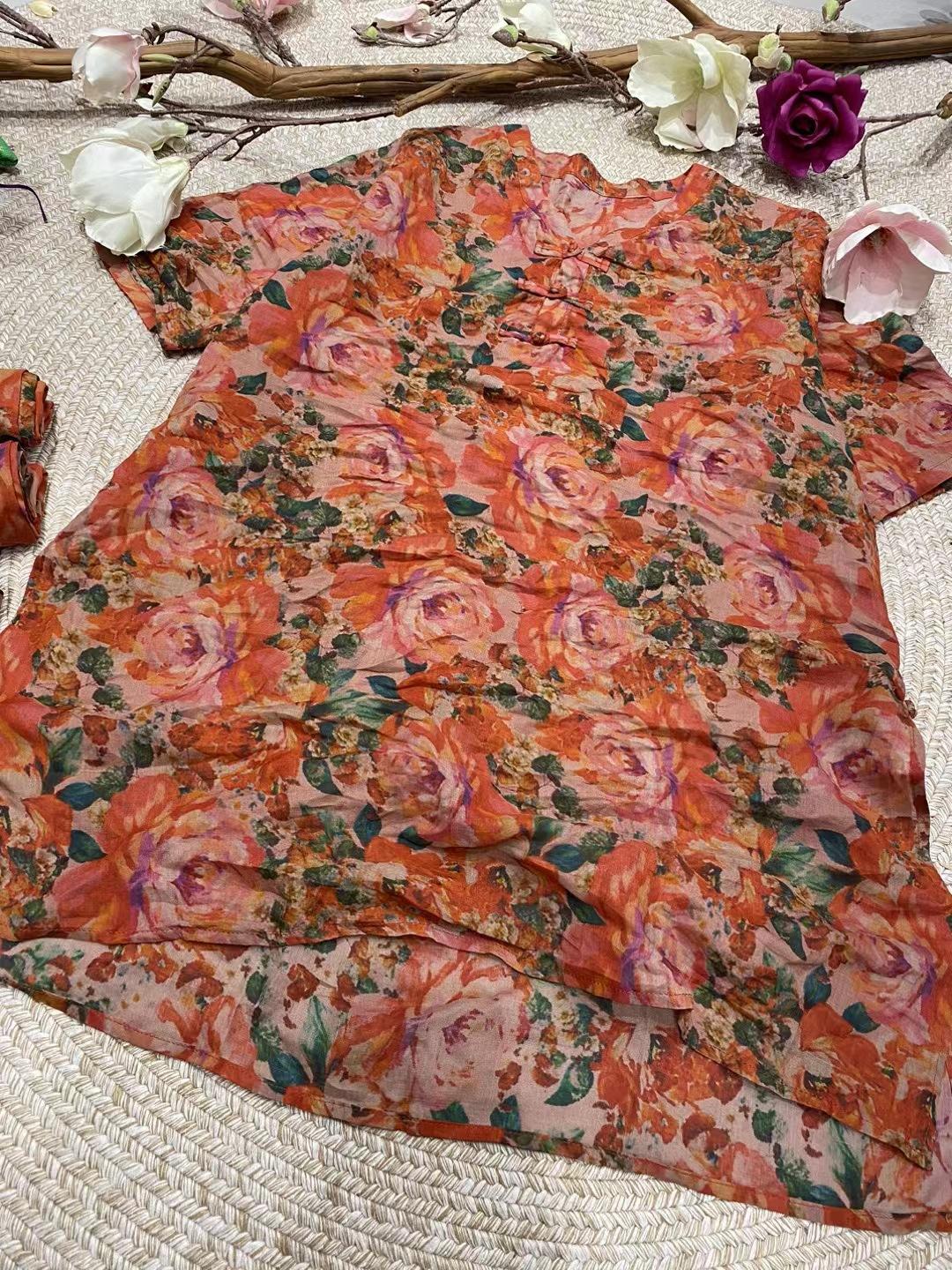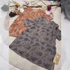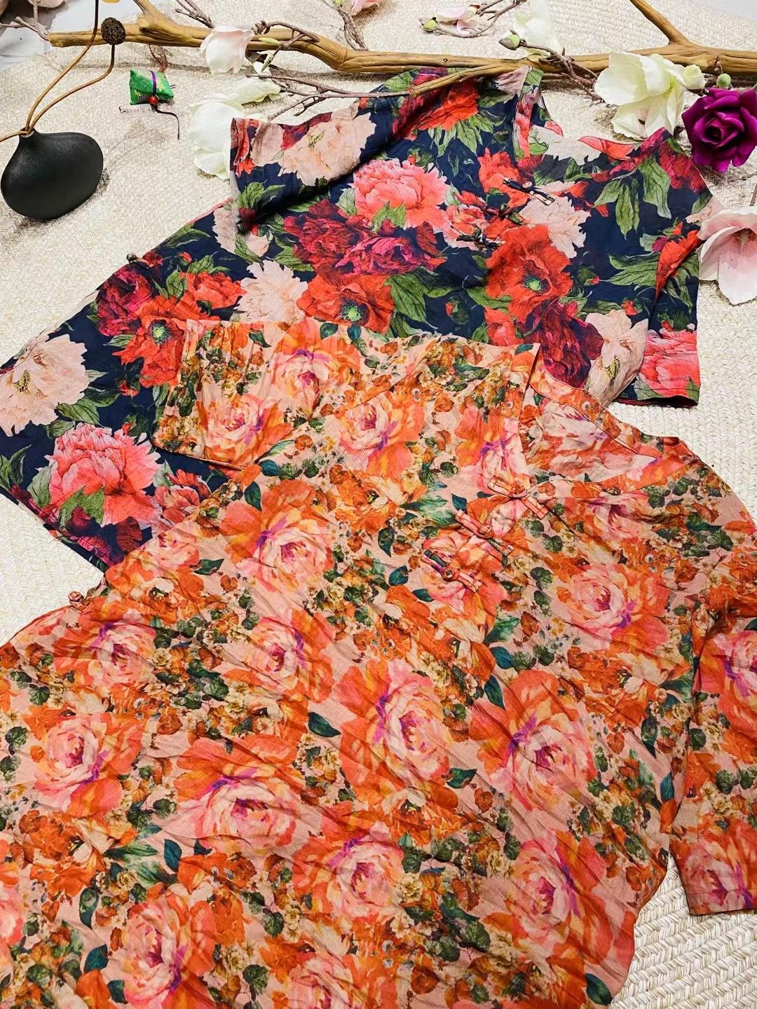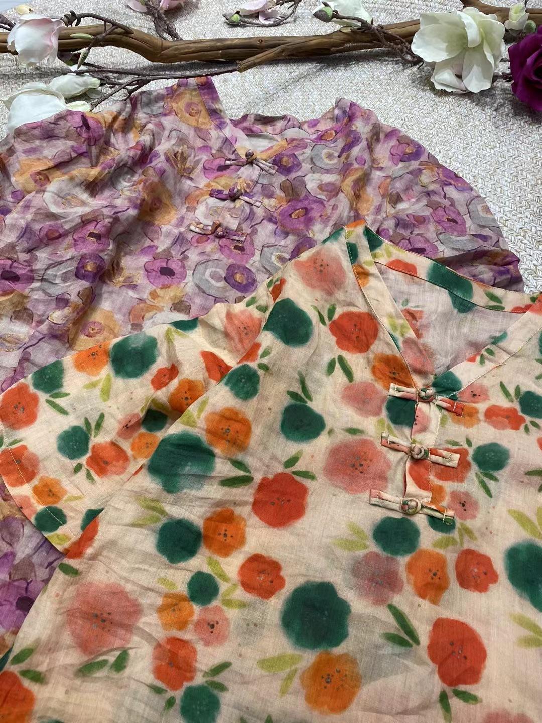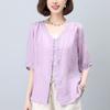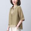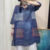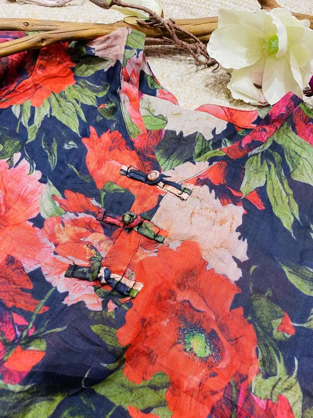 Verano 2024 Nuevo Camisa de Ramio de Diseño Holgado con Estampado y Cuello en V con Hebilla Camisa de Manga Corta de Largo Medio