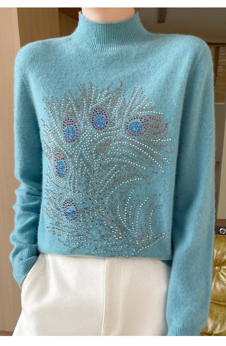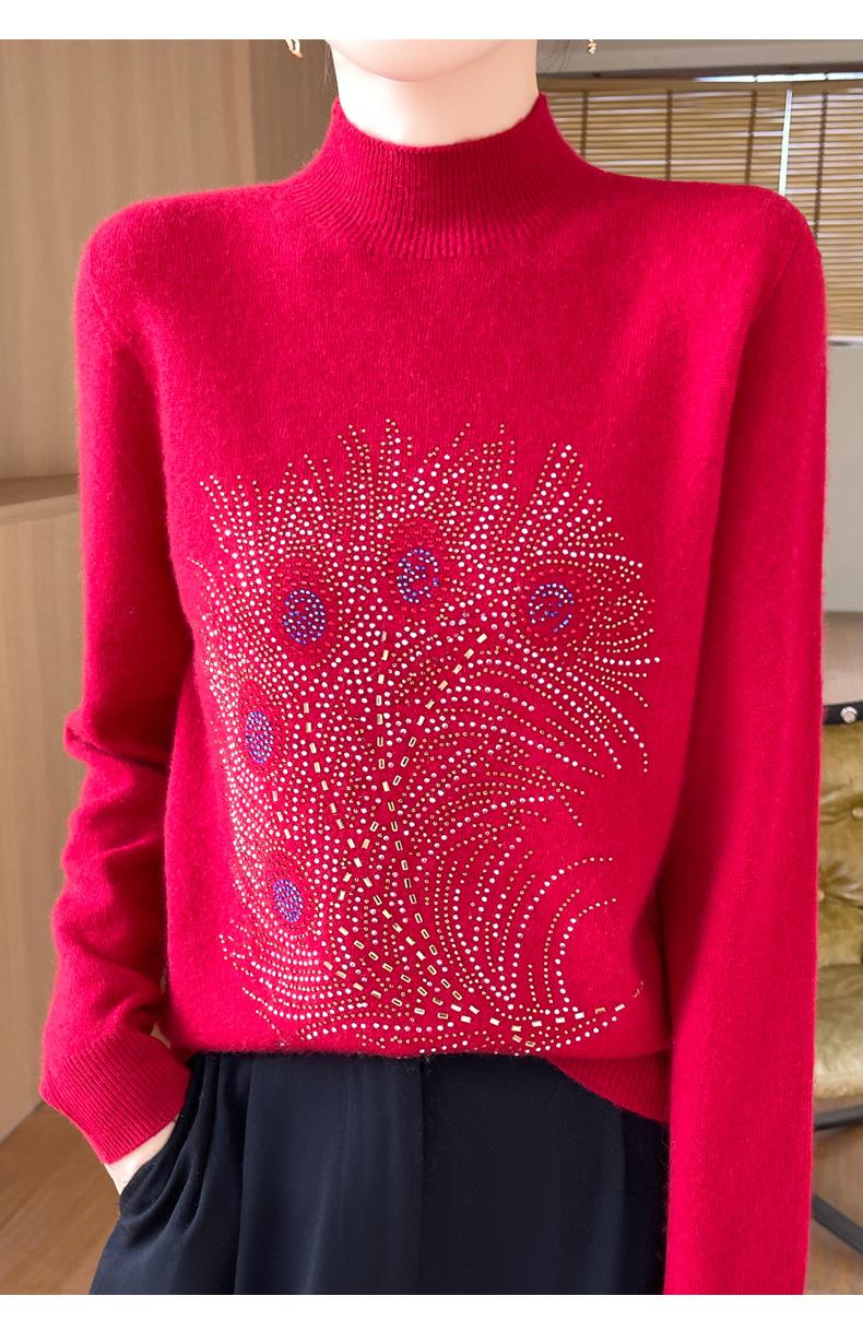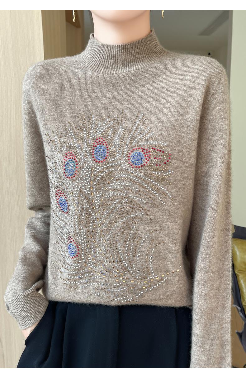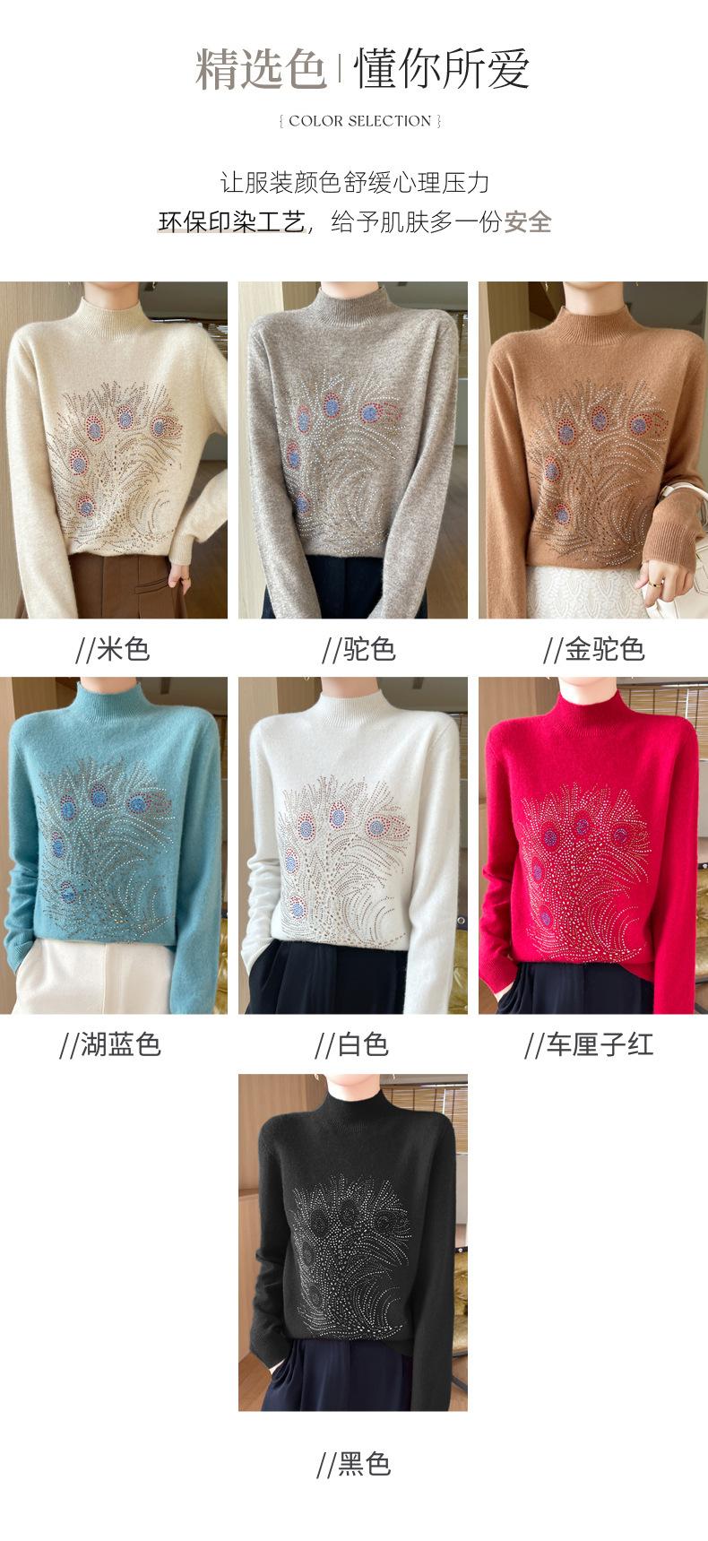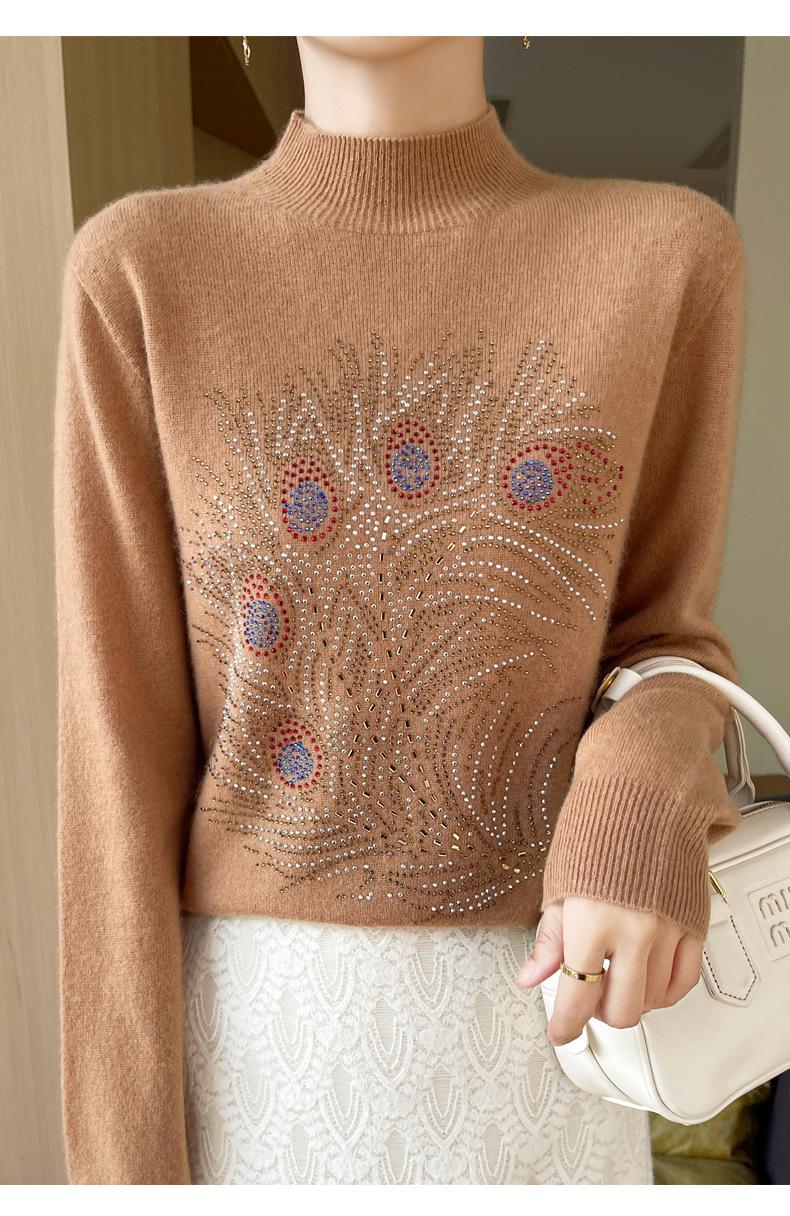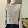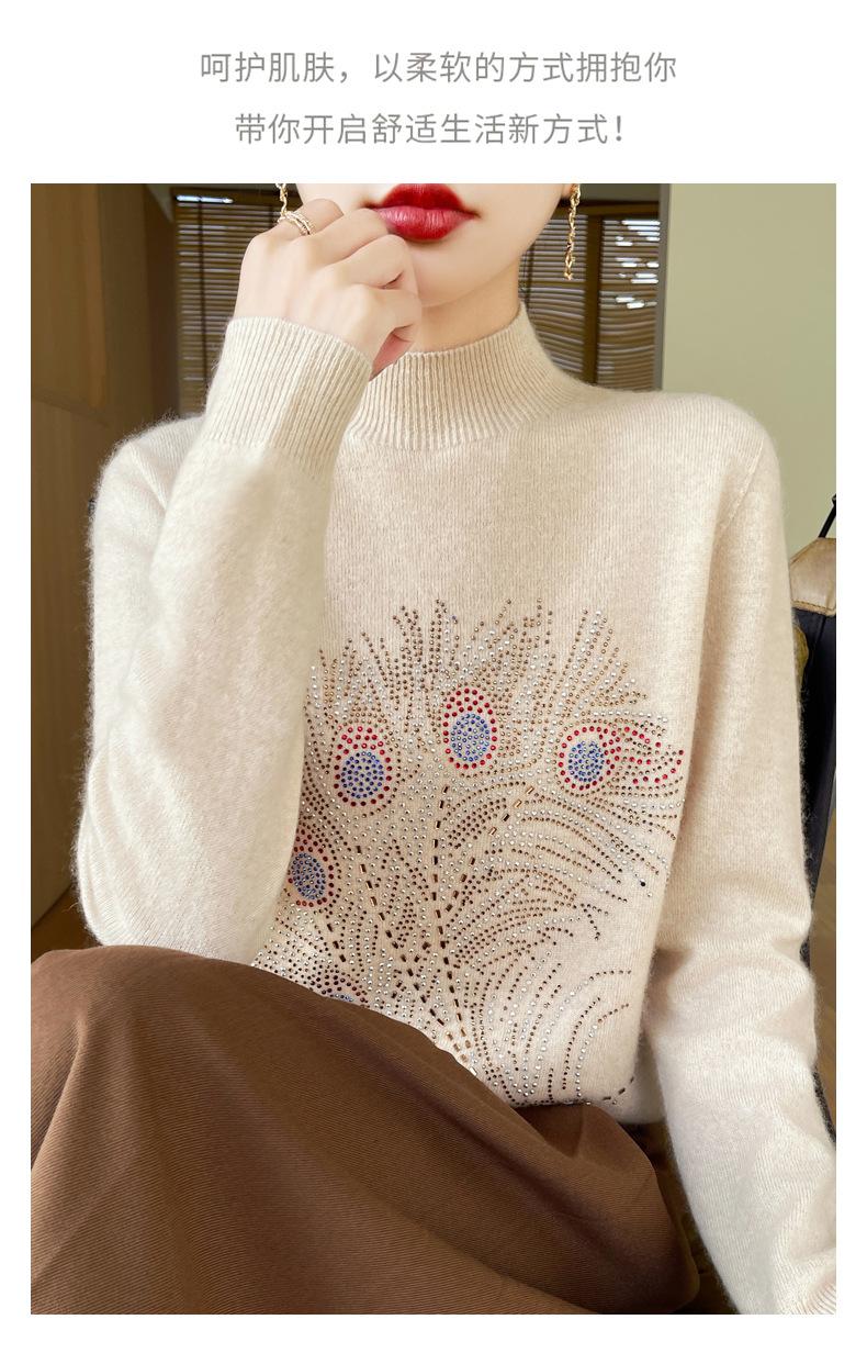 Otoño e Invierno Nuevo Suéter de Punto de Cuello Alto Medio para Mujer con Pedrería Termofijada, Holgado, de Manga Larga, Color Sólido, Casual, Sencillo, Base