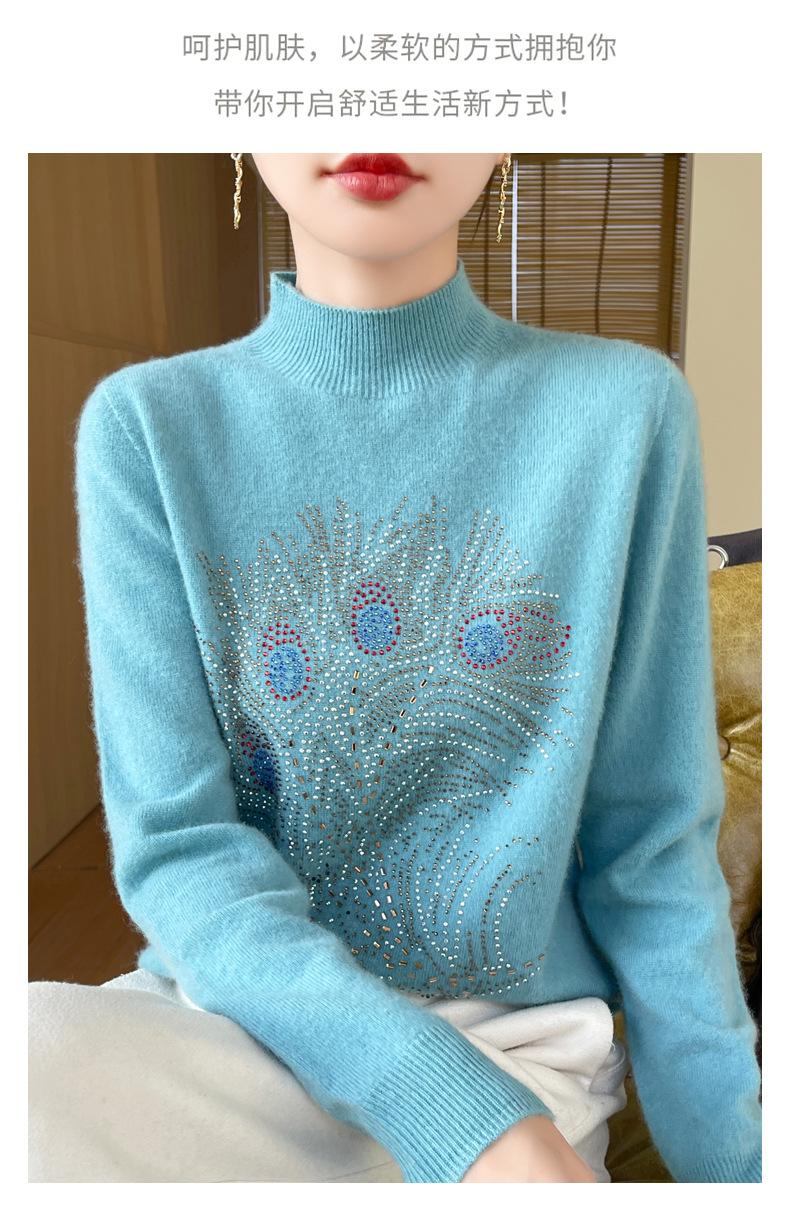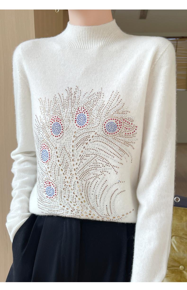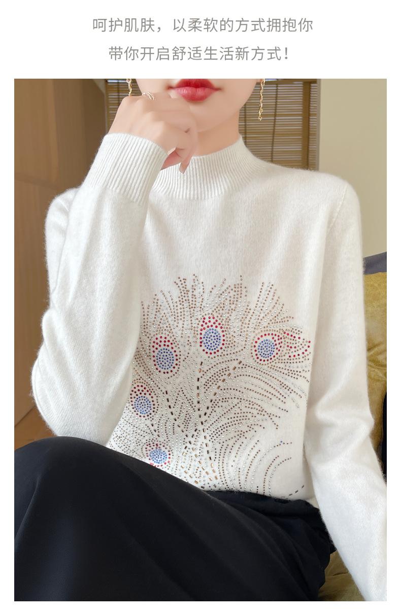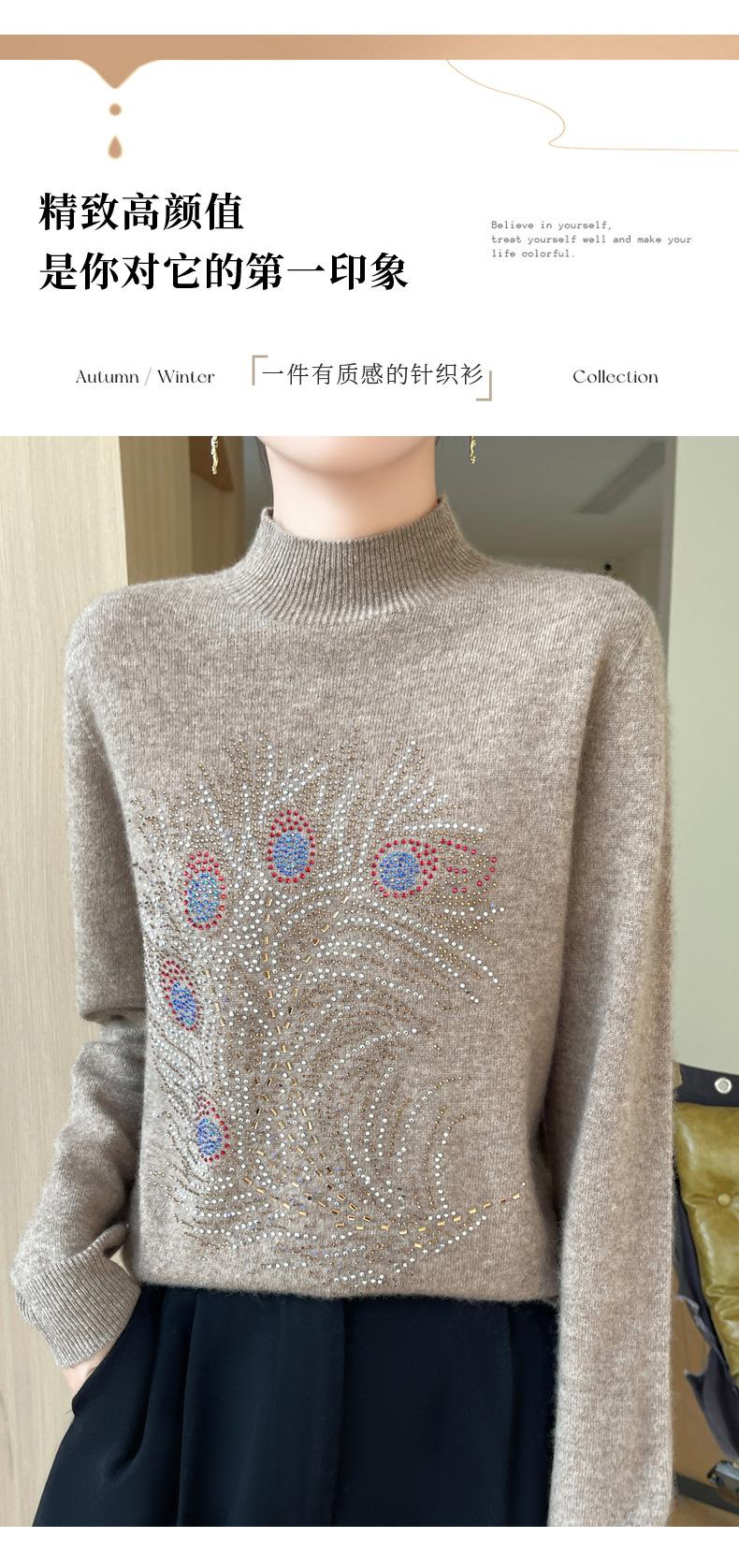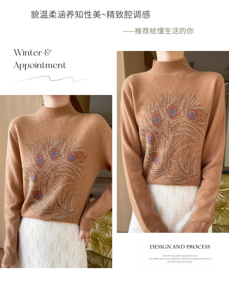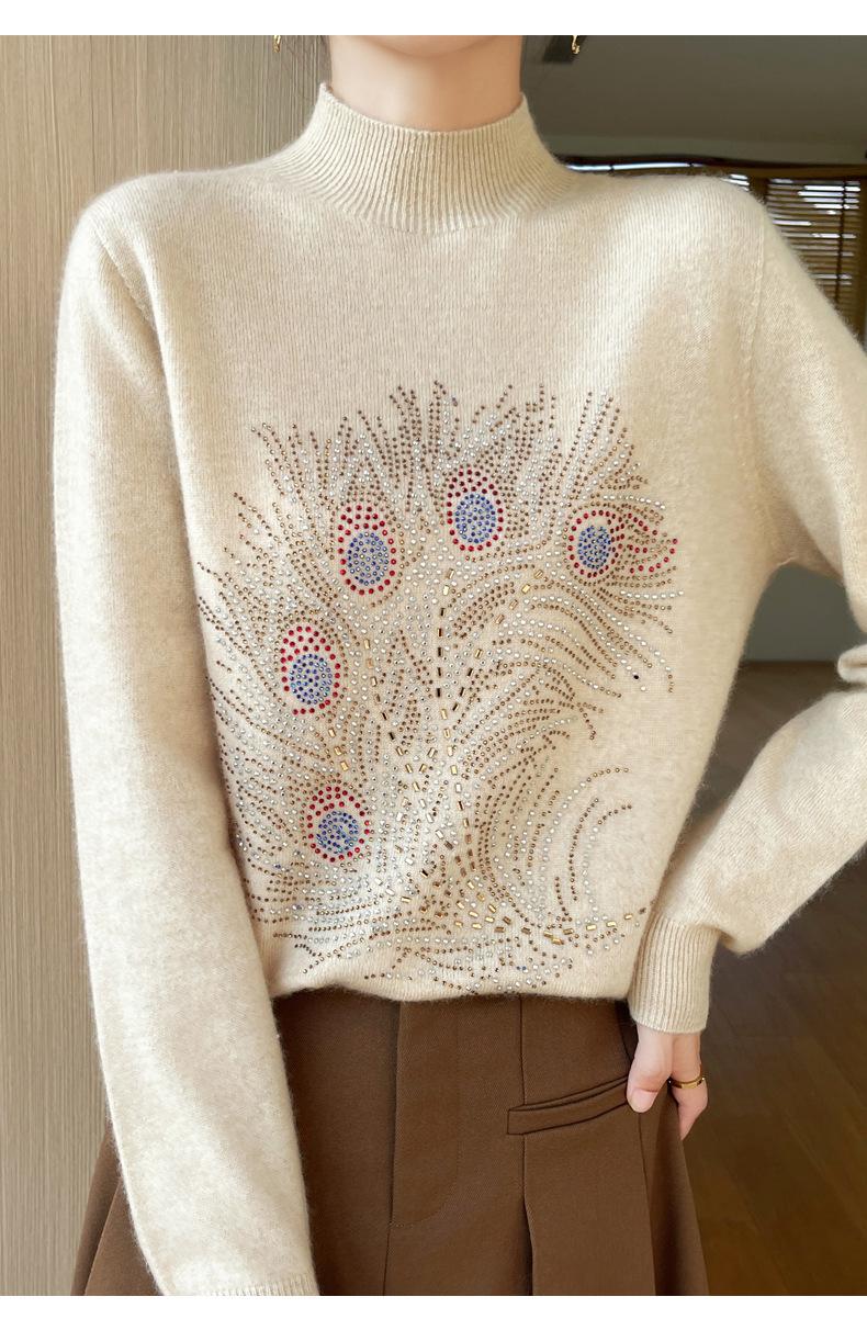 Otoño e Invierno Nuevo Suéter de Punto de Cuello Alto Medio para Mujer con Pedrería Termofijada, Holgado, de Manga Larga, Color Sólido, Casual, Sencillo, Base