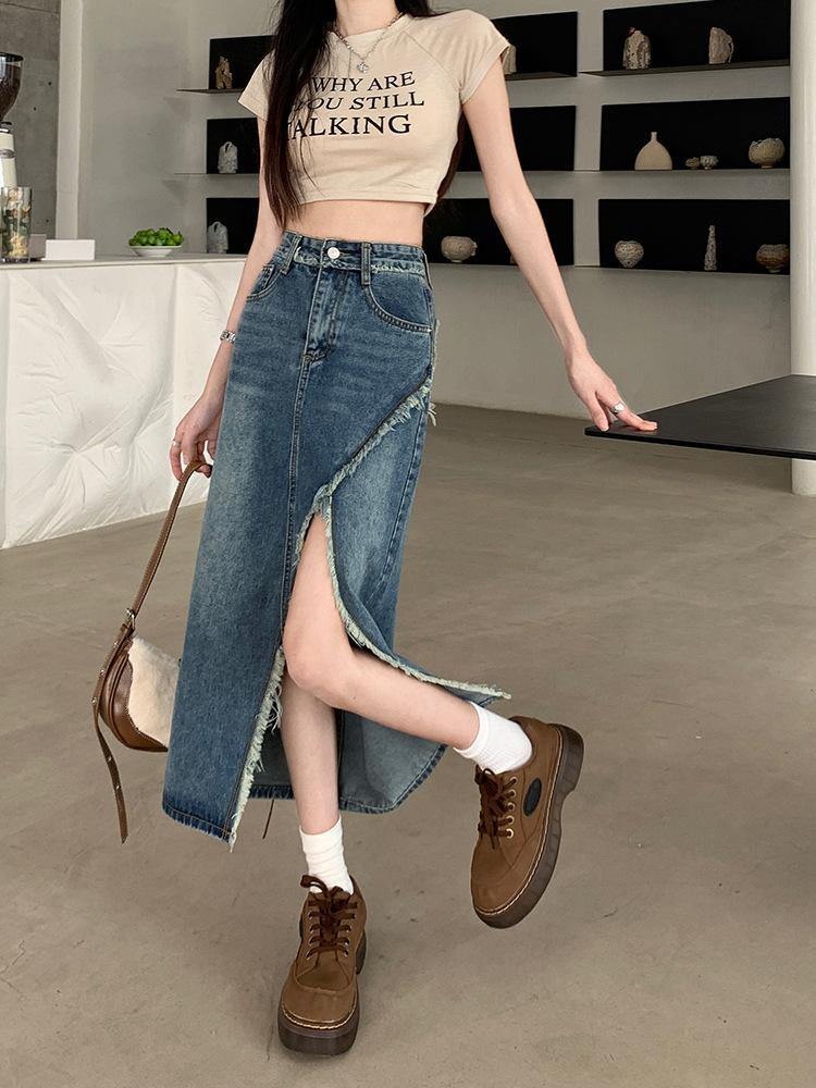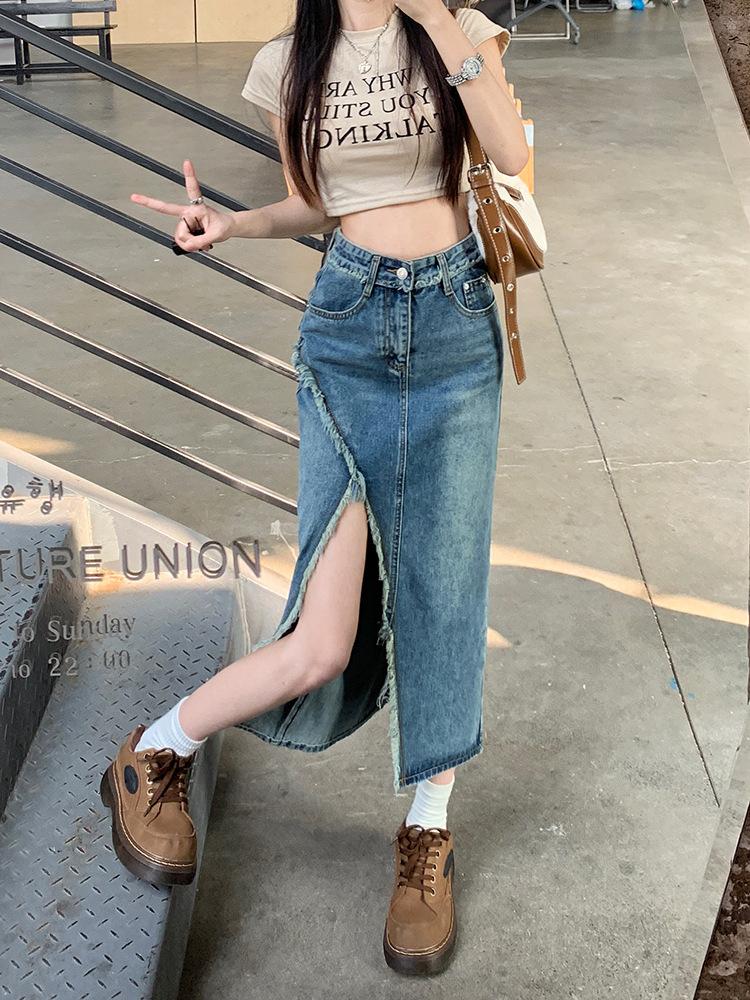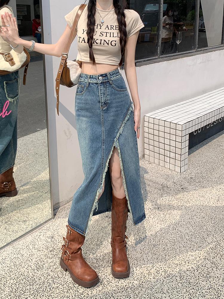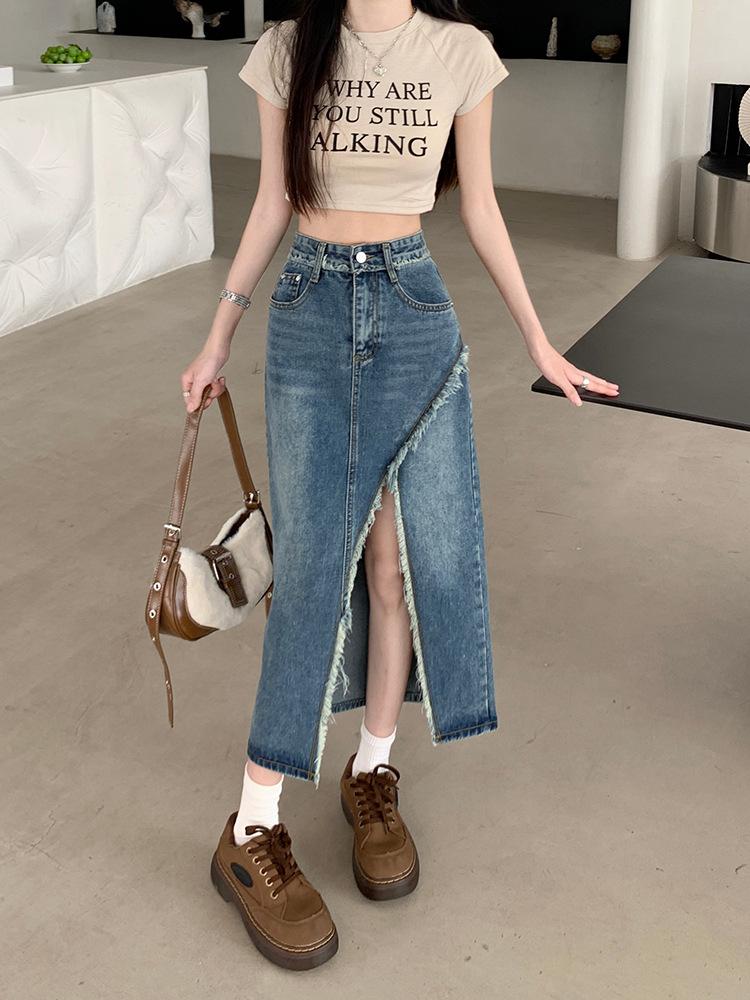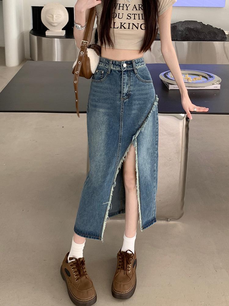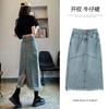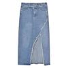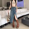 Falda vaquera de corte A con cintura alta y abertura para mujer, diseño de largo medio, de verano, adelgazante