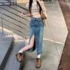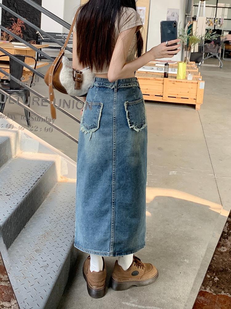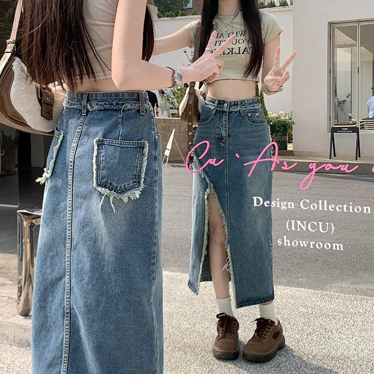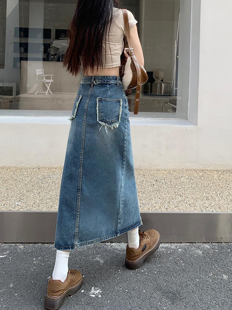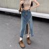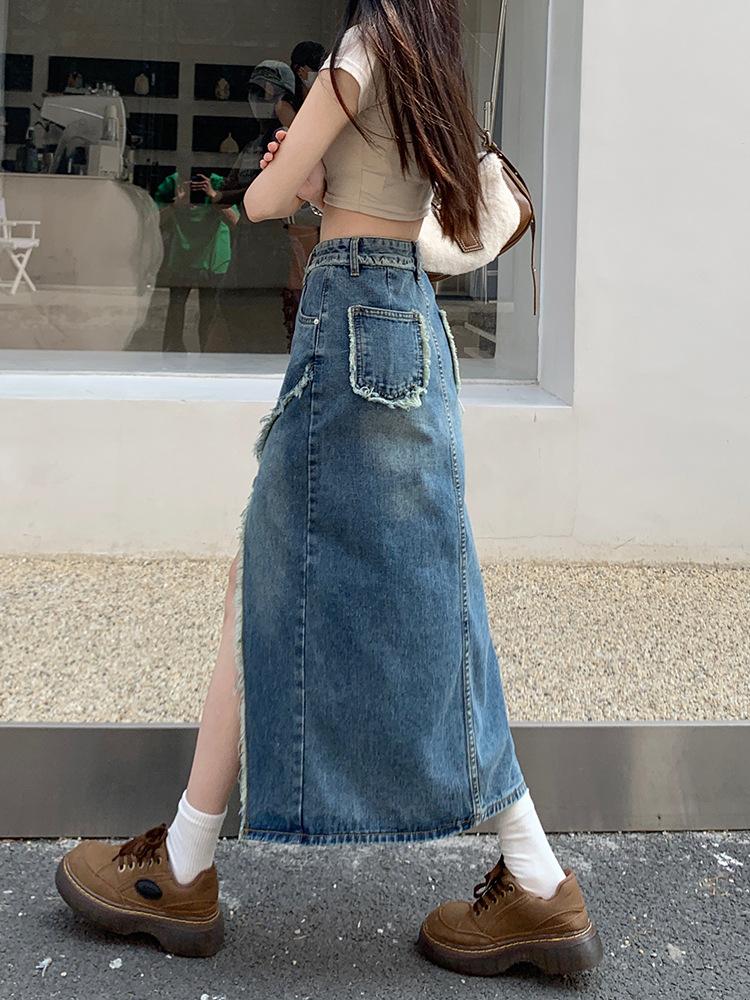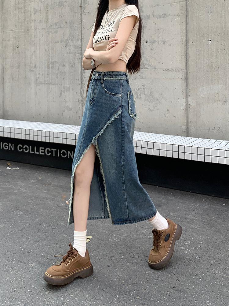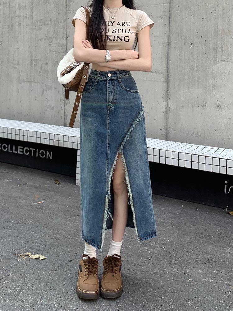 Falda vaquera de corte A con cintura alta y abertura para mujer, diseño de largo medio, de verano, adelgazante