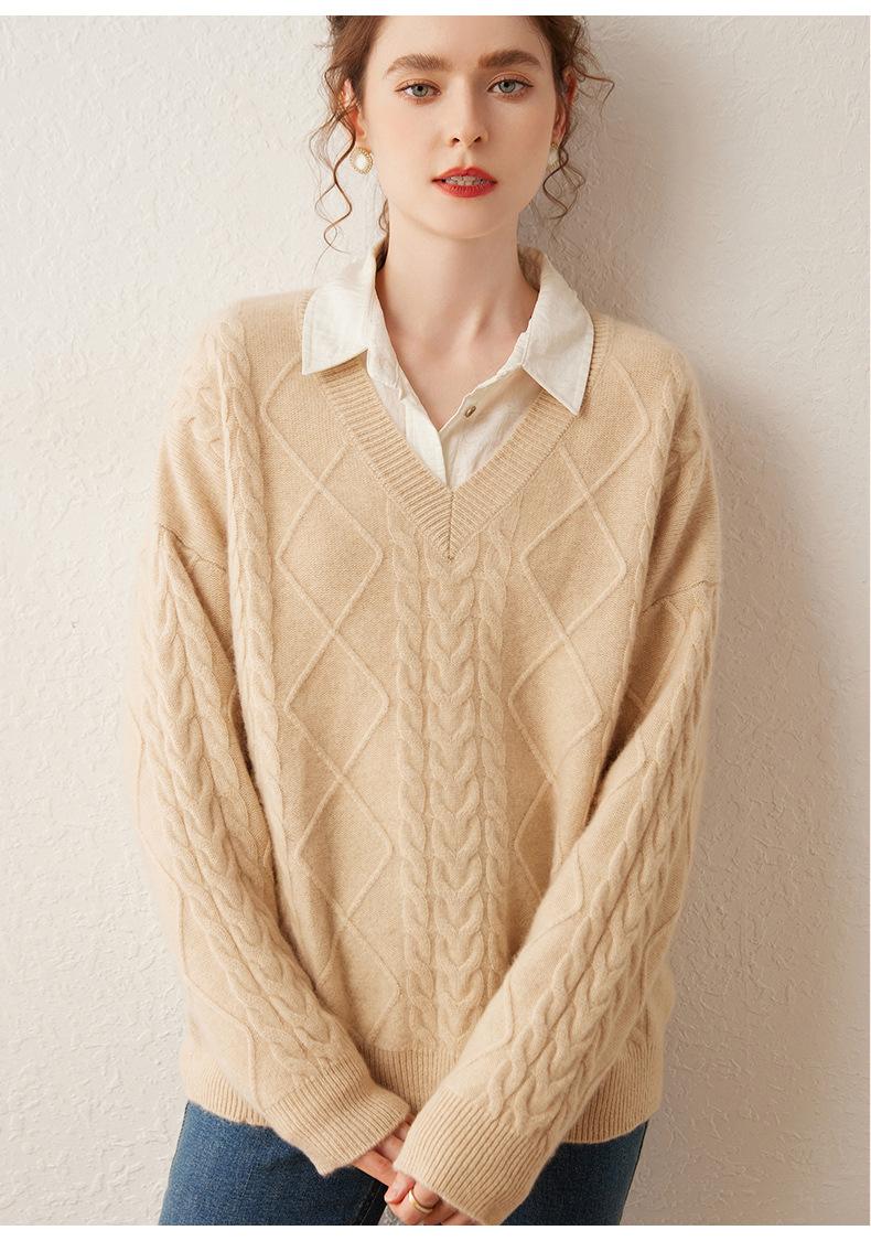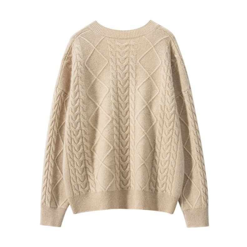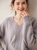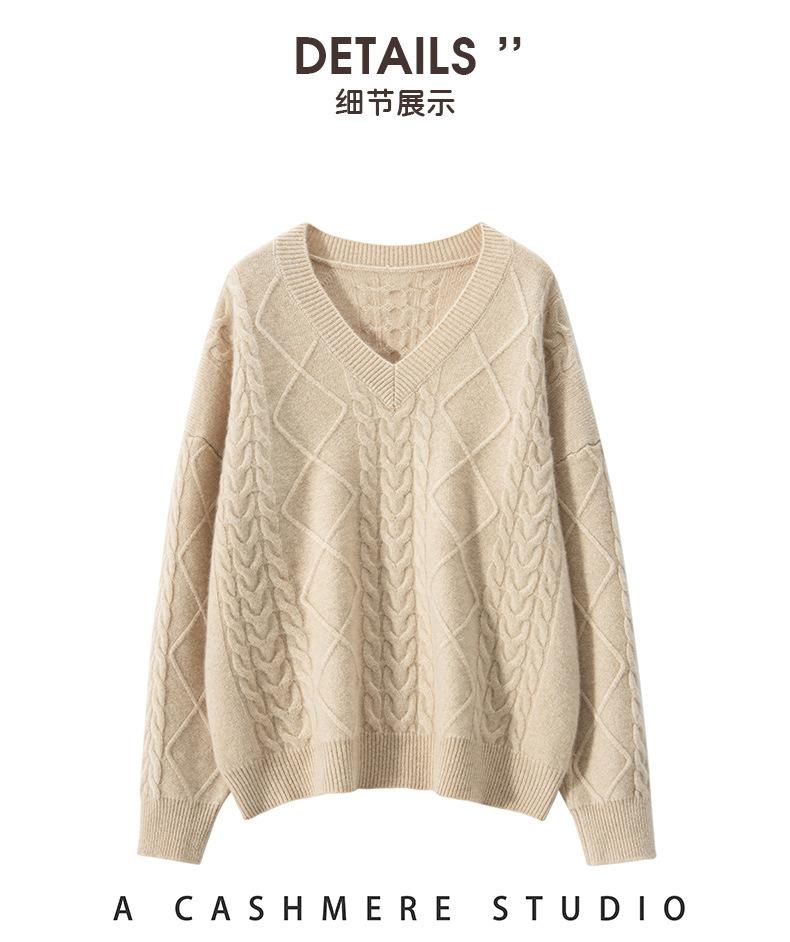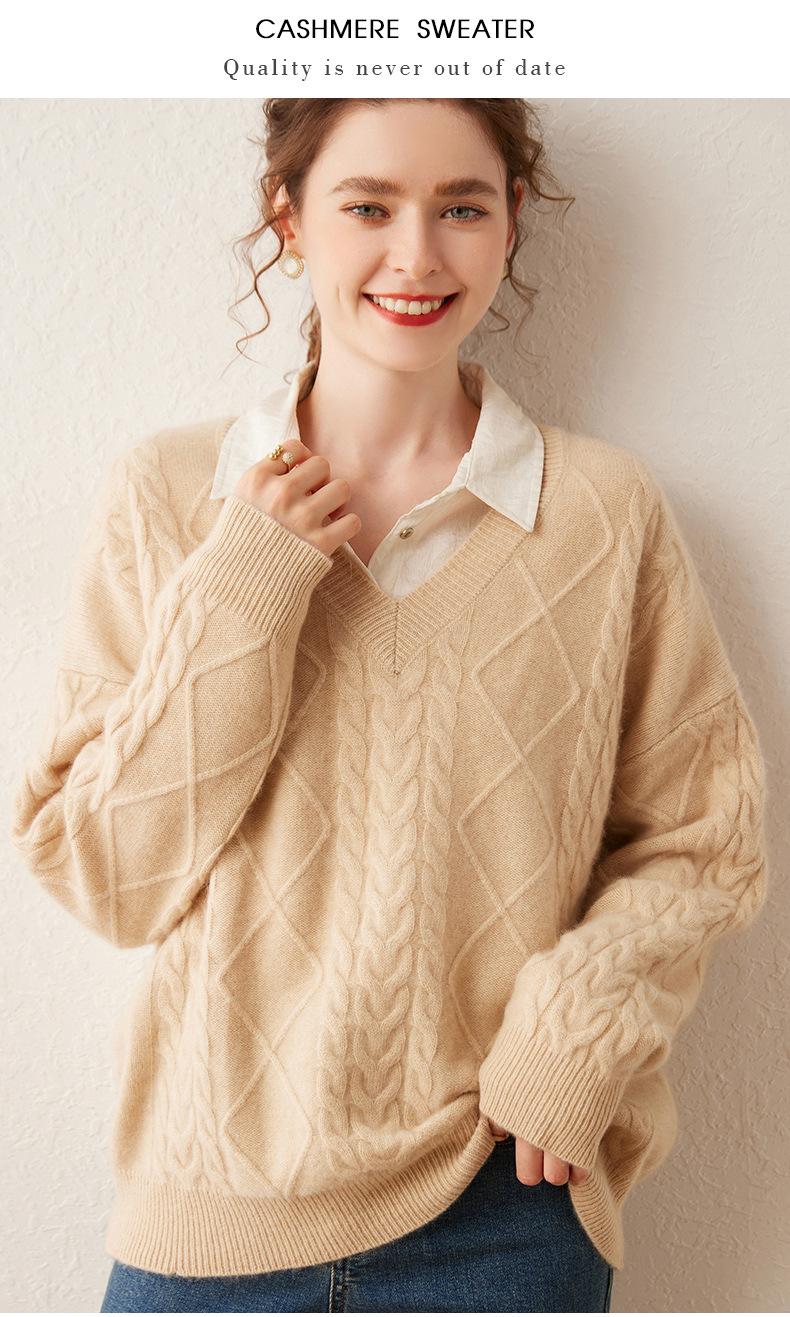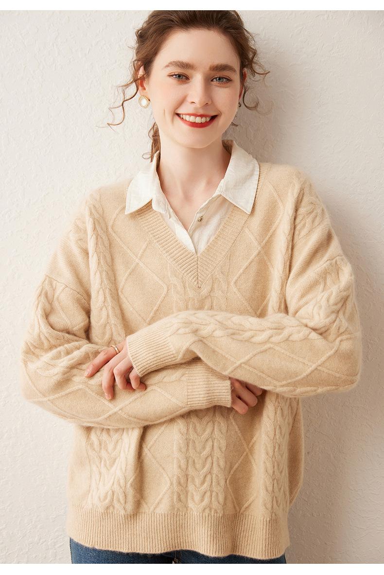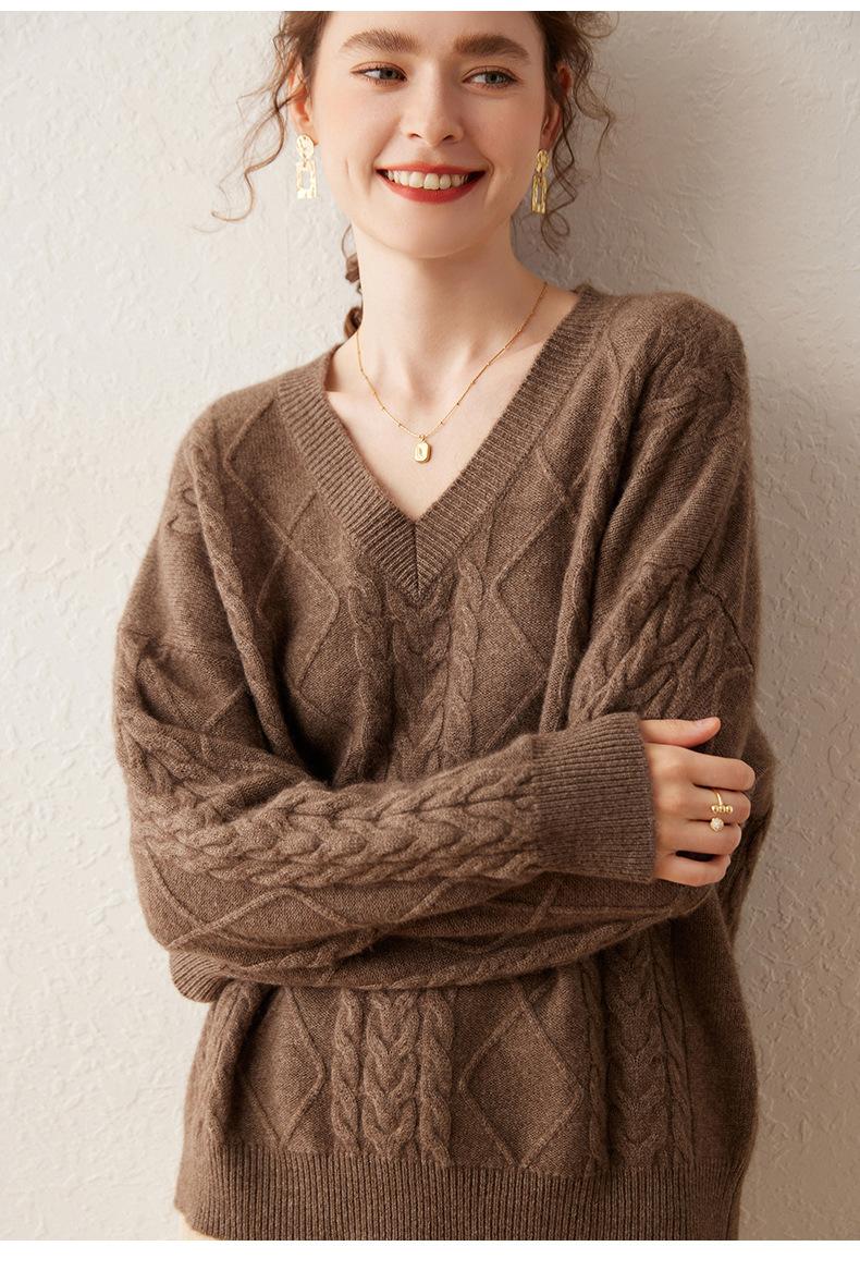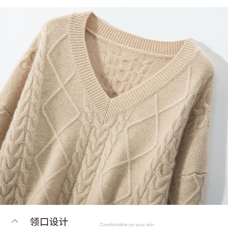 Suéter de cachemira de lana retorcida, suelto, con cuello en V, para mujer, otoño e invierno de 2024, estilo suave, suelto, adelgazante y elegante.