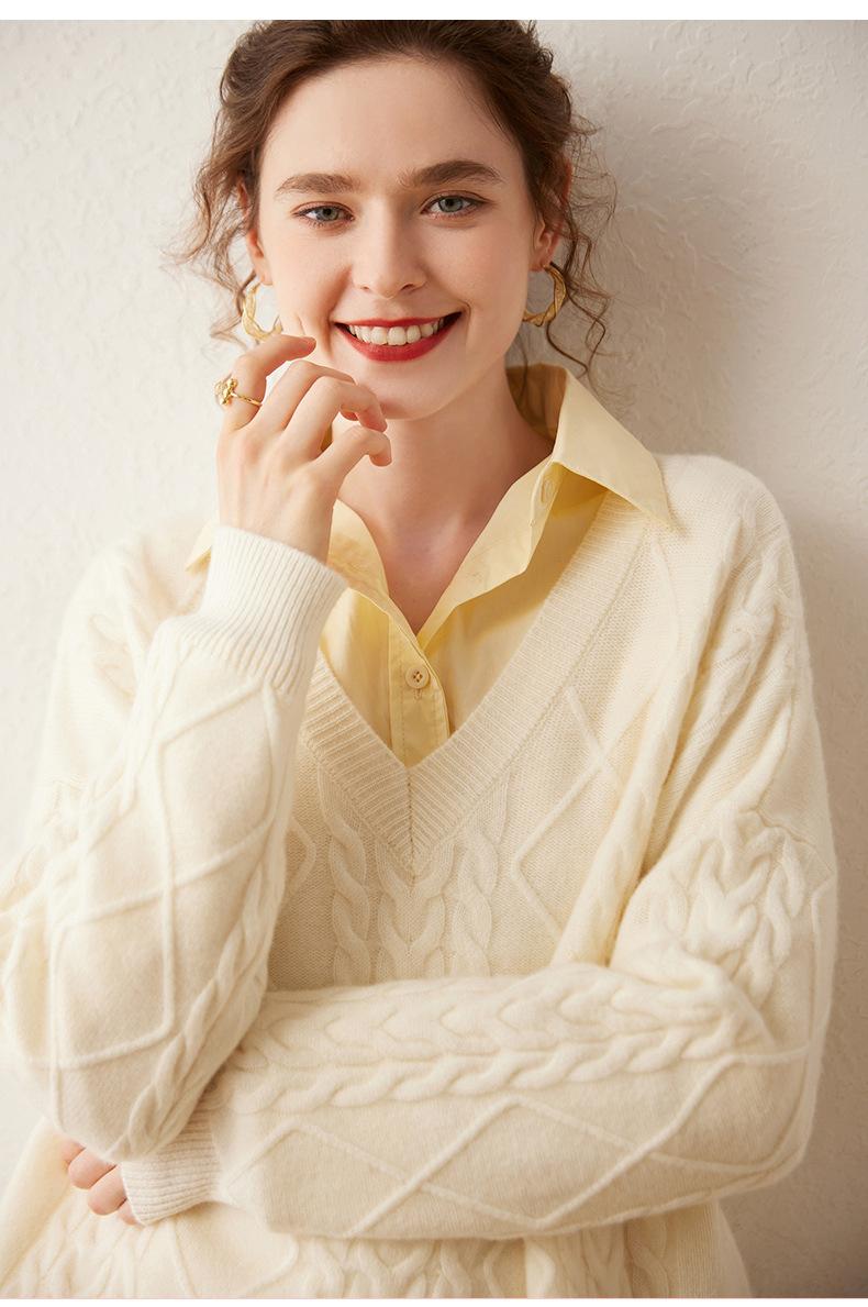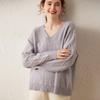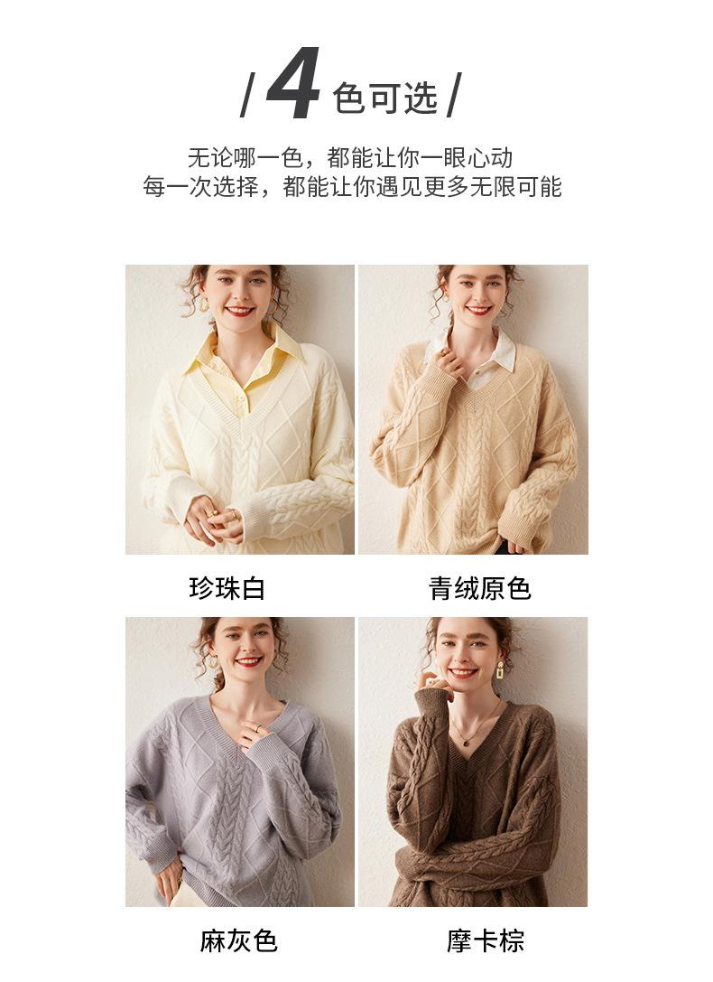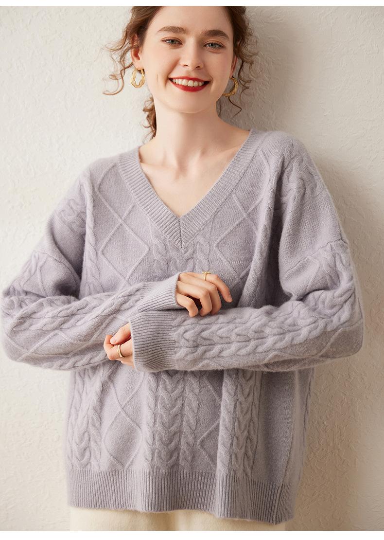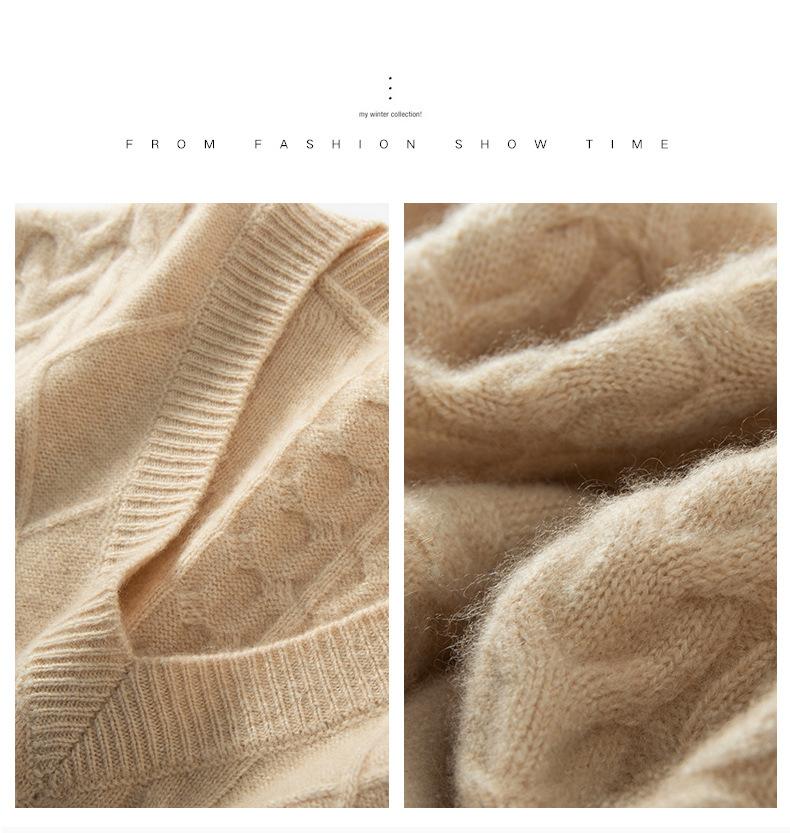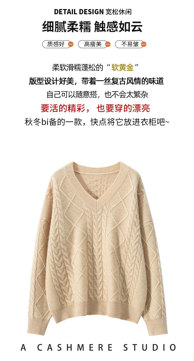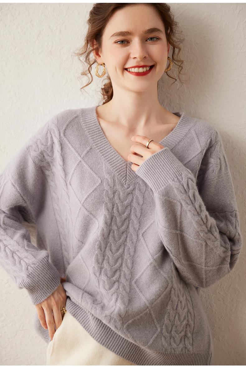 Suéter de cachemira de lana retorcida, suelto, con cuello en V, para mujer, otoño e invierno de 2024, estilo suave, suelto, adelgazante y elegante.