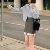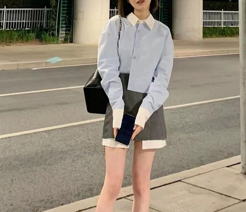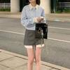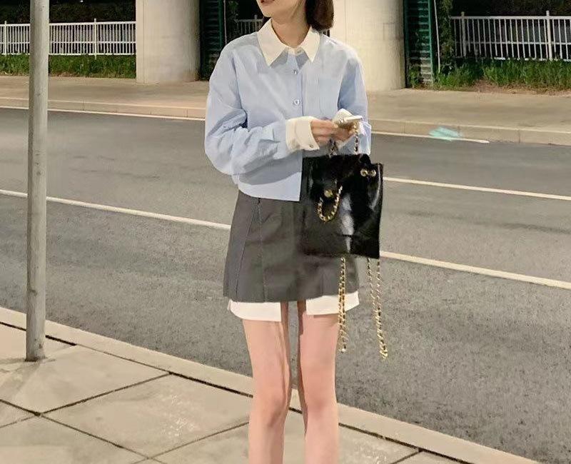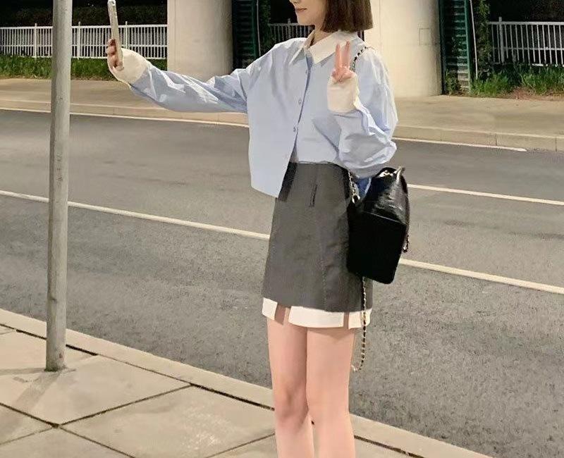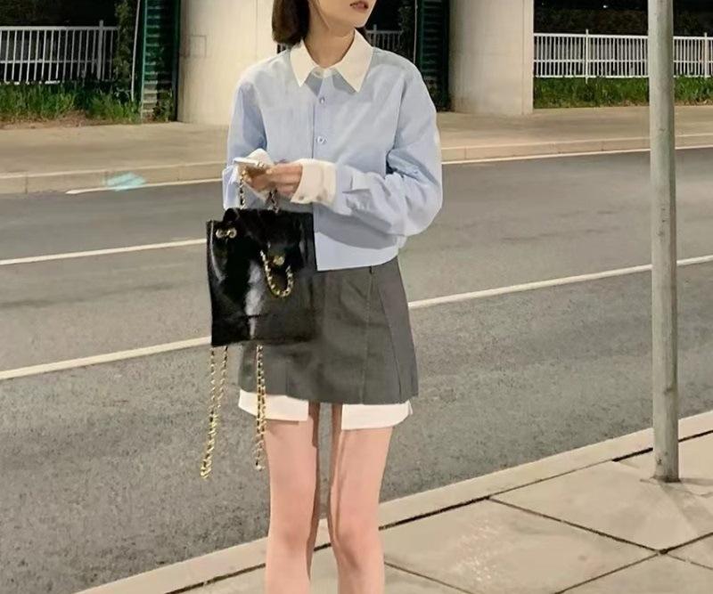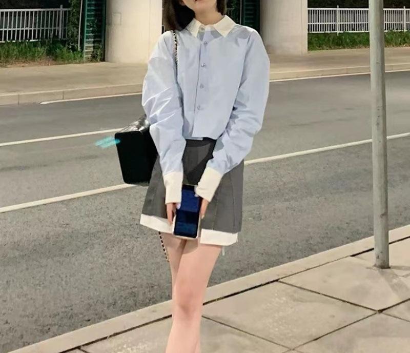 Vestido estilo universitario dulce y salado para mujer, diseño de camisa de manga larga, top de moda, falda corta de media longitud, conjunto de dos piezas