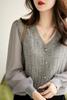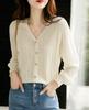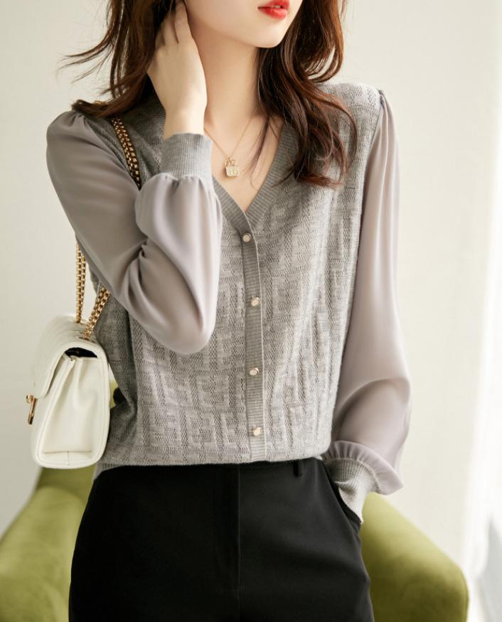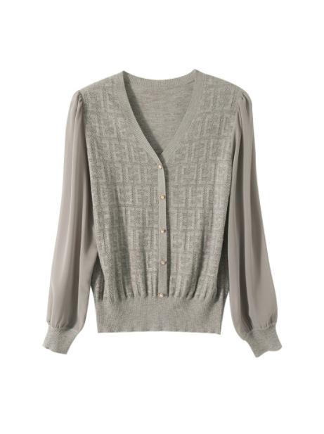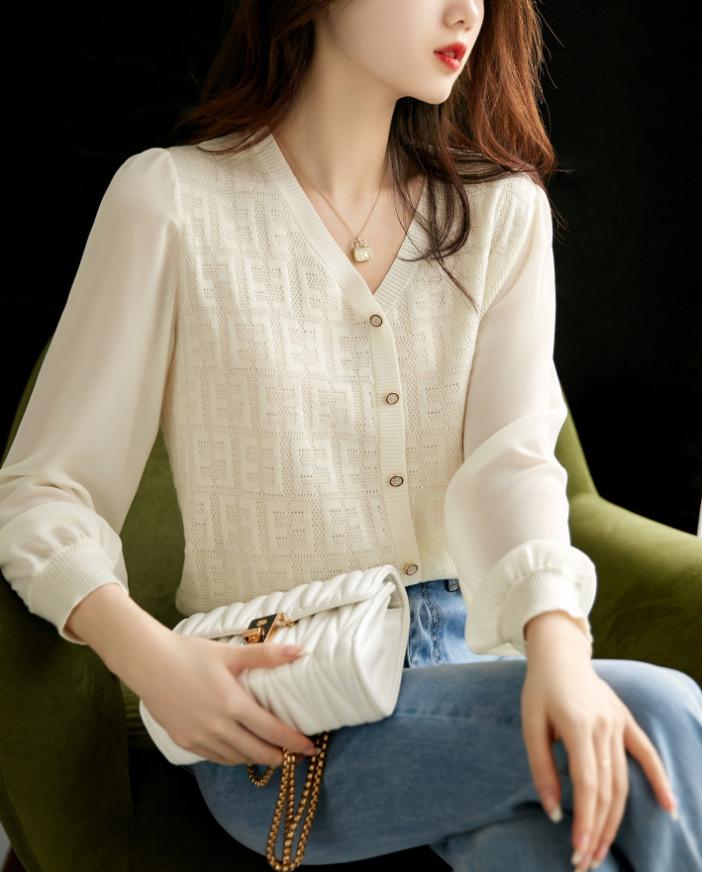 Temperamento Suave Diseño de Punto Calado con Mangas Jacquard Costuradas Sentido Niche Cuello en V Jersey de Punto para Mujer Primavera y Otoño Comercio Exterior