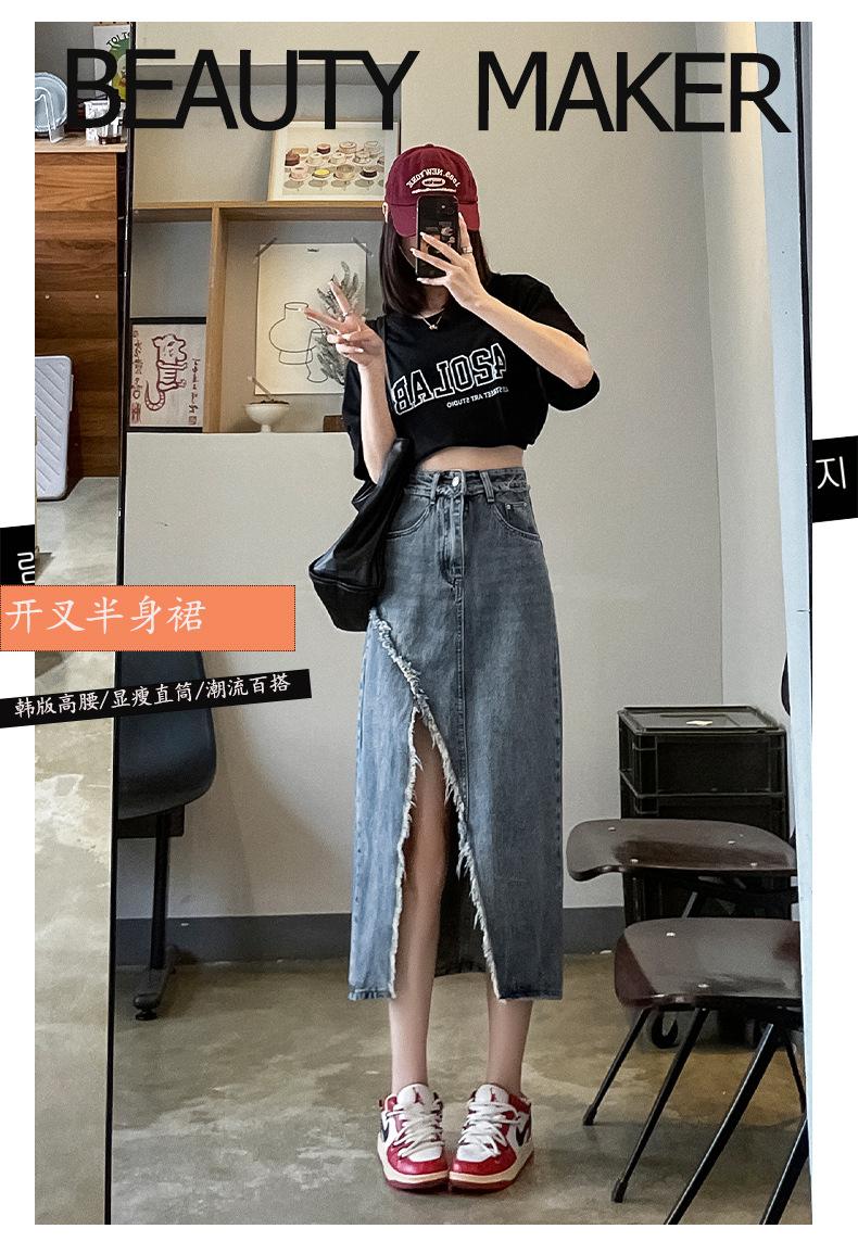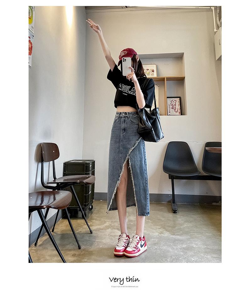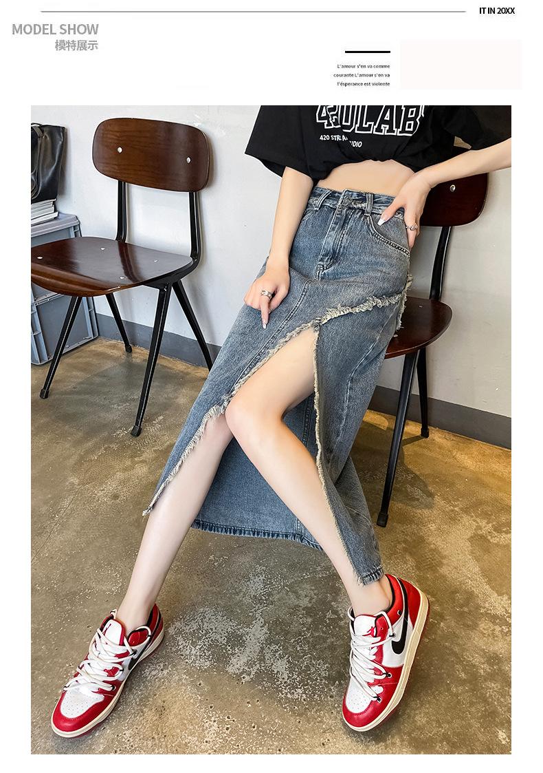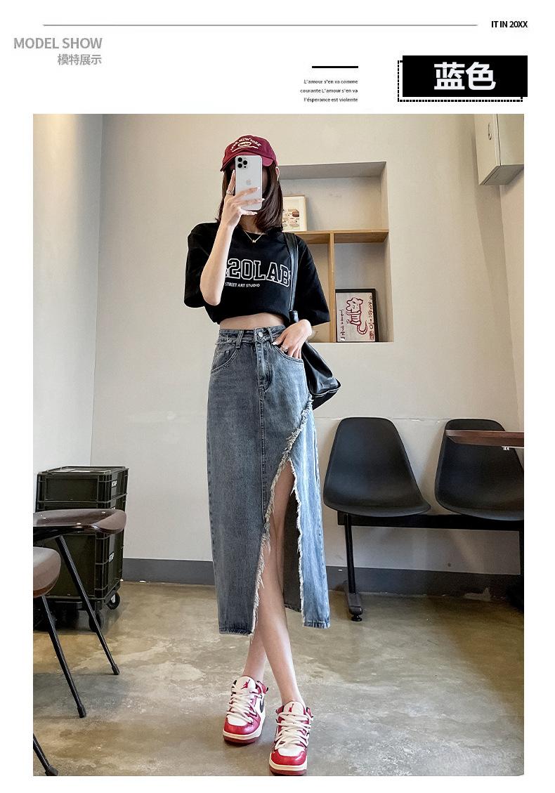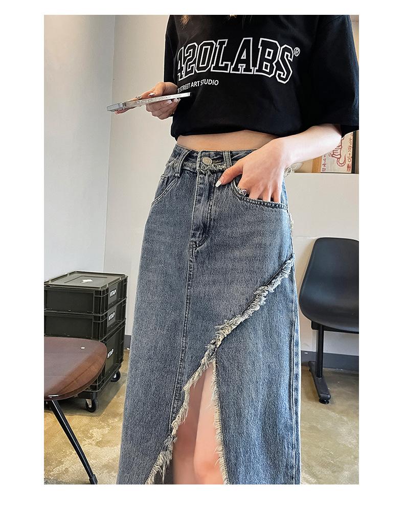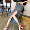 Falda vaquera dividida de primavera y verano para mujer, falda irregular de cintura alta, adelgazante, con borde sin rematar, falda de corte A, longitud media, de moda.