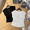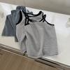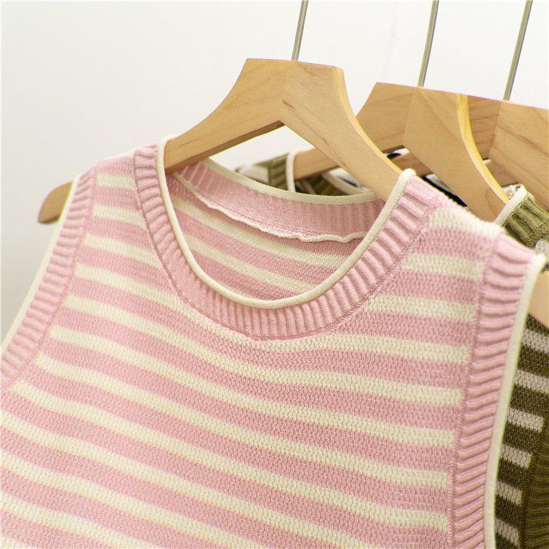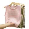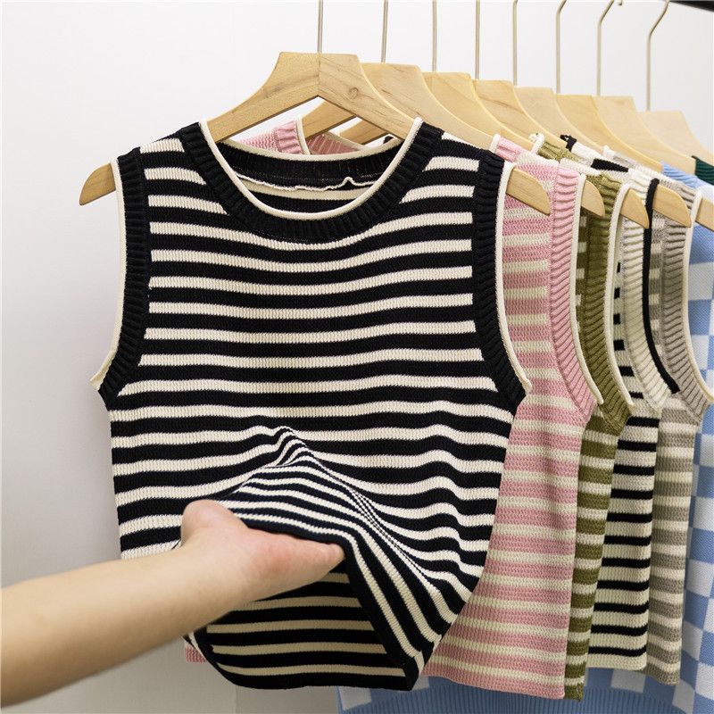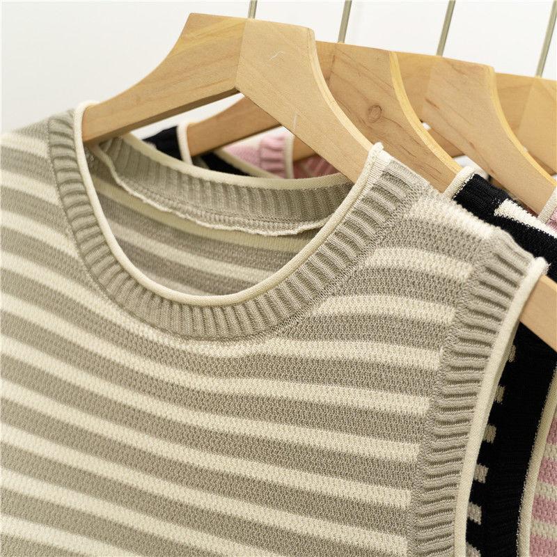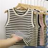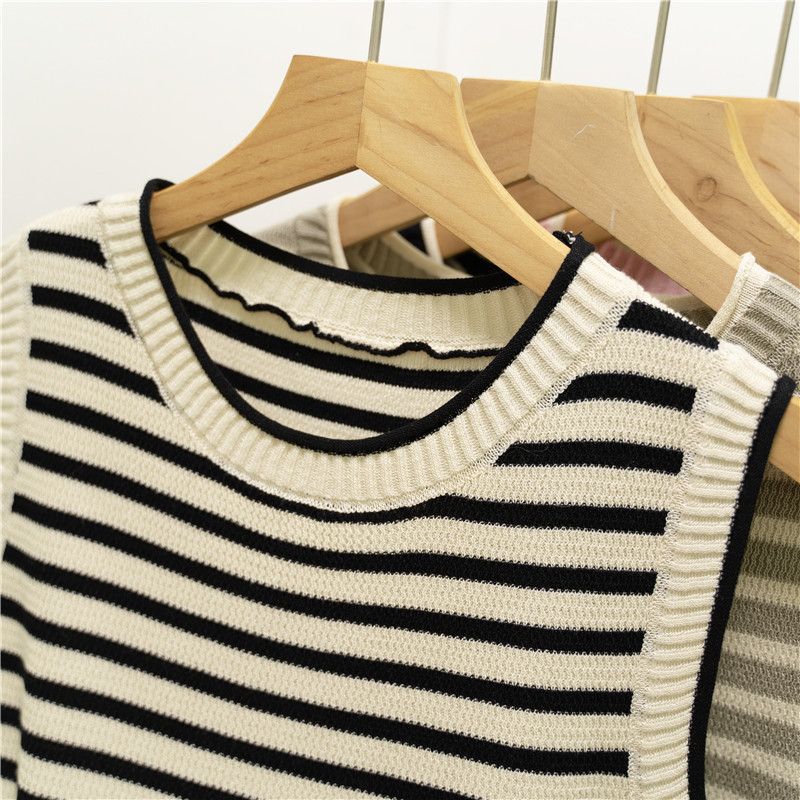 Camisola de verano a rayas blancas y negras de estilo coreano, prenda exterior de cuello redondo, corte entallado, interior corto y sin mangas de punto