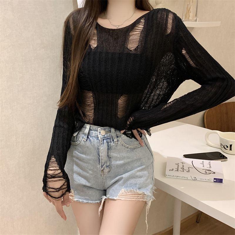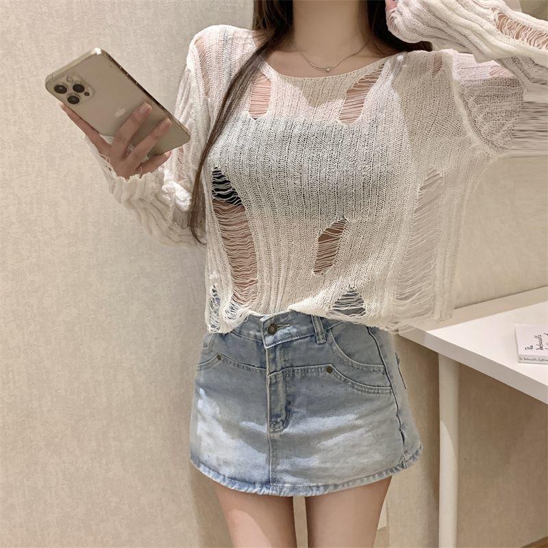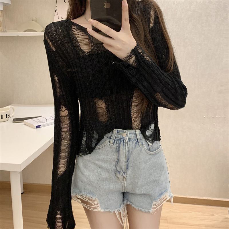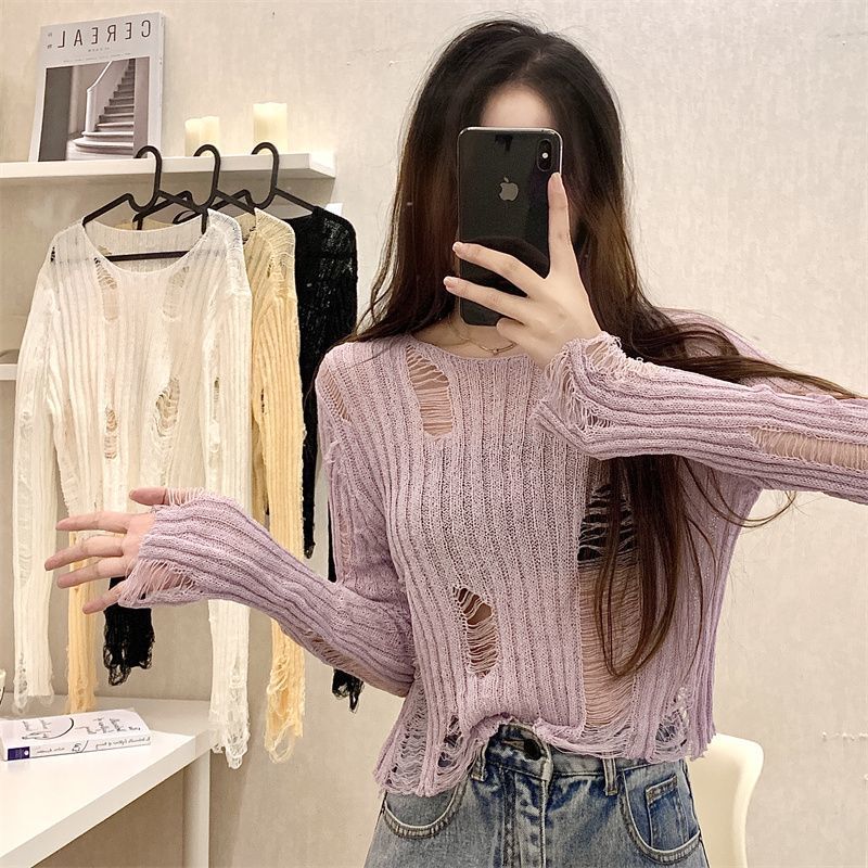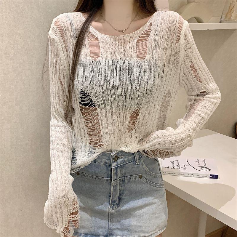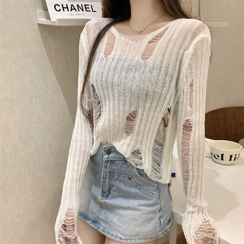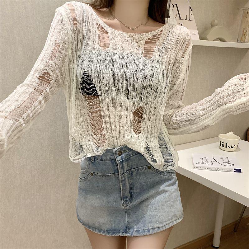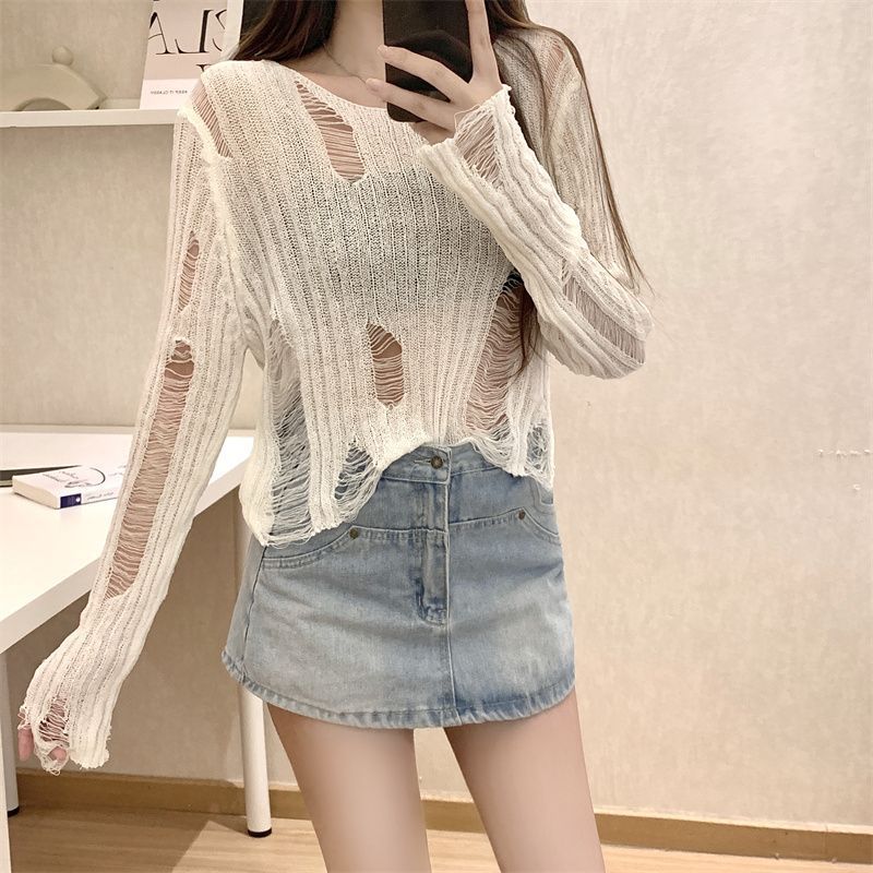 Playera Blanca Delgada Deseo Puro Manga Larga con Diseño de Agujeros Sentido Niche Chic Sexy Ajustada Adelgazante Clavícula Top