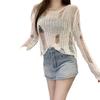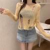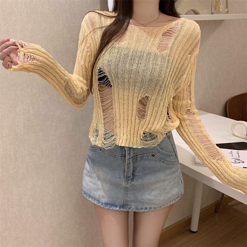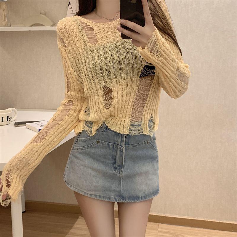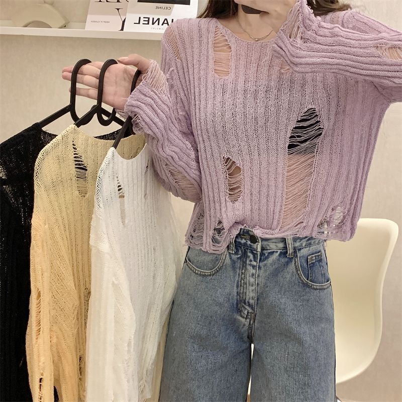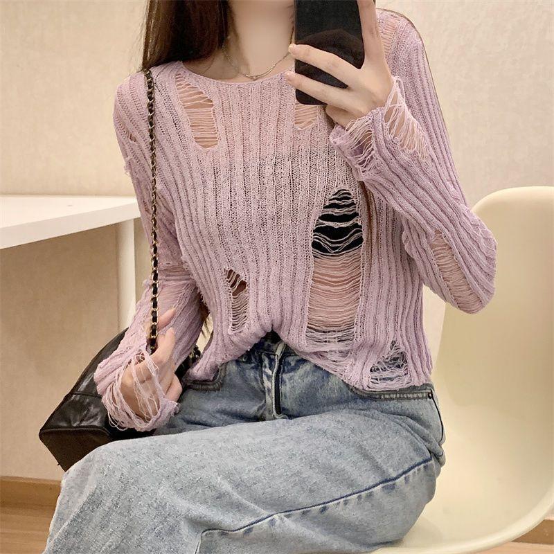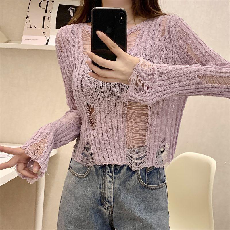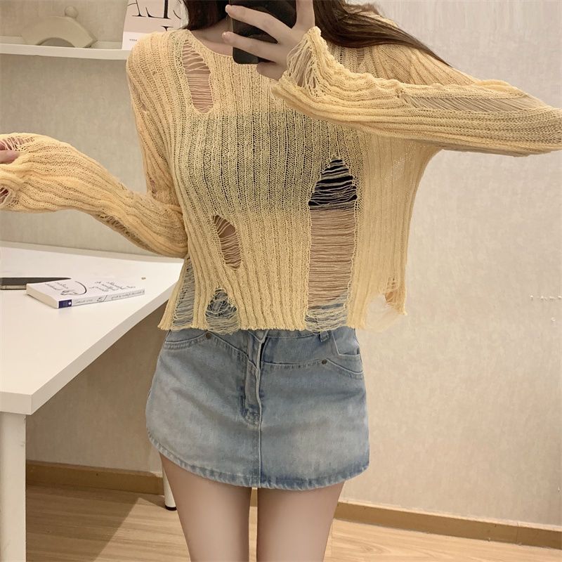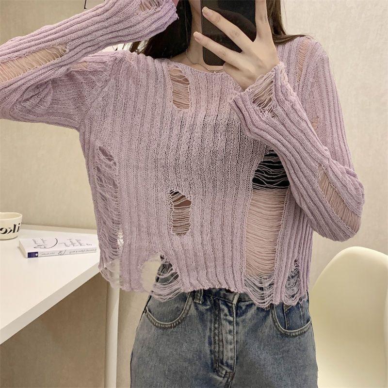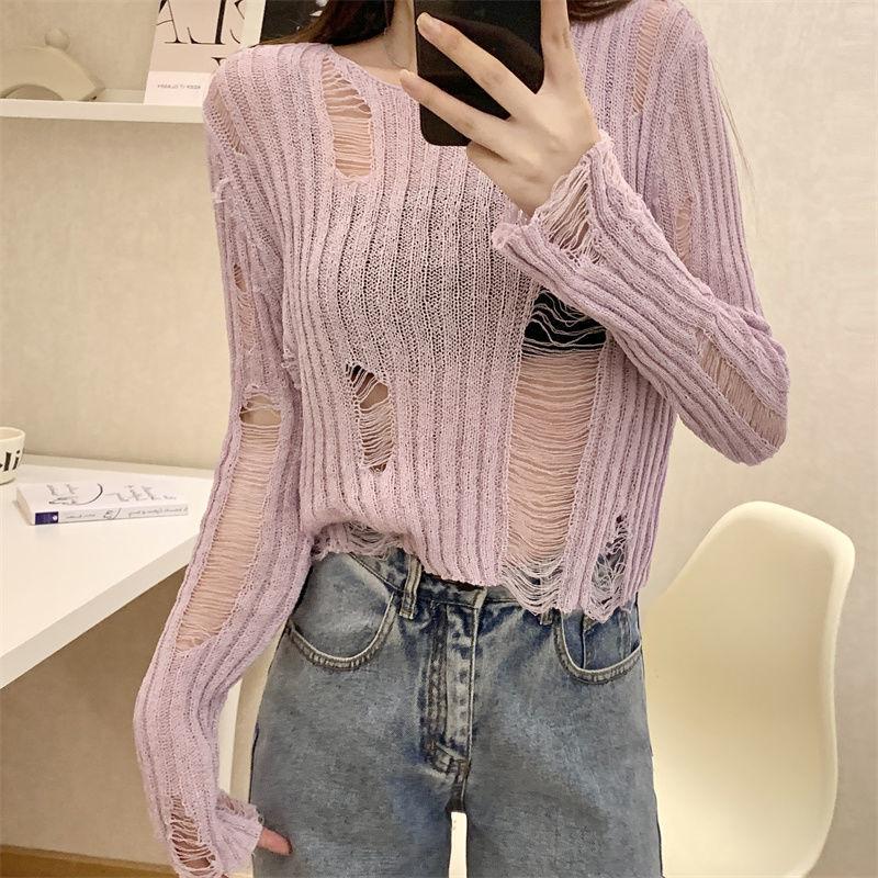 Playera Blanca Delgada Deseo Puro Manga Larga con Diseño de Agujeros Sentido Niche Chic Sexy Ajustada Adelgazante Clavícula Top