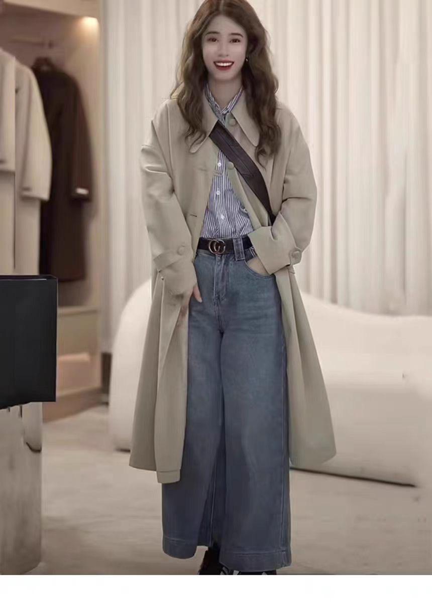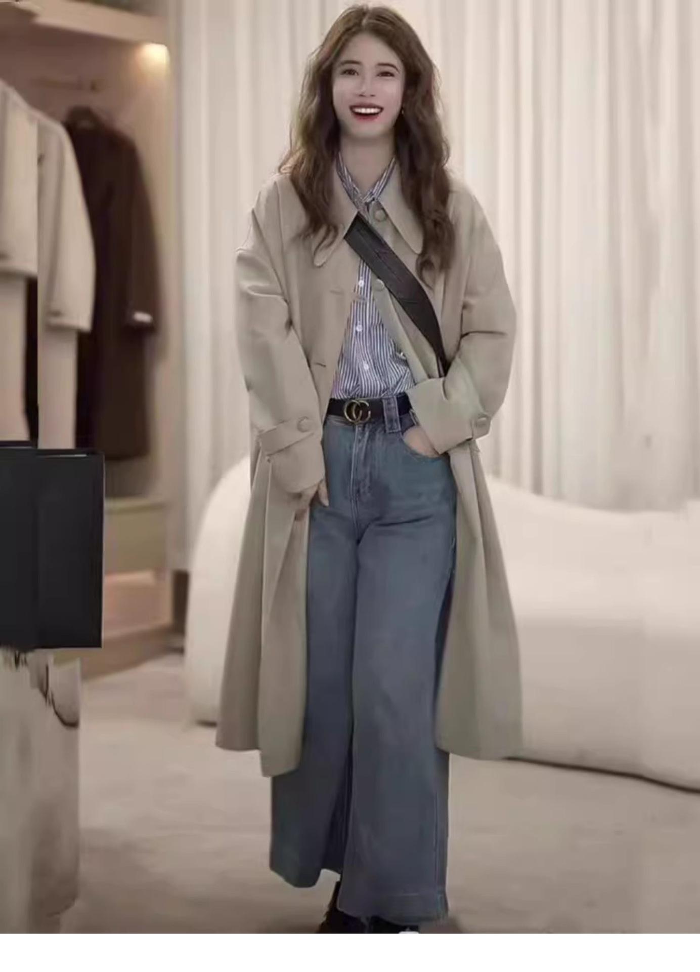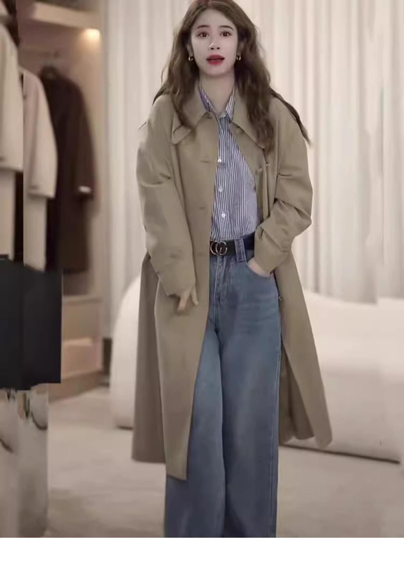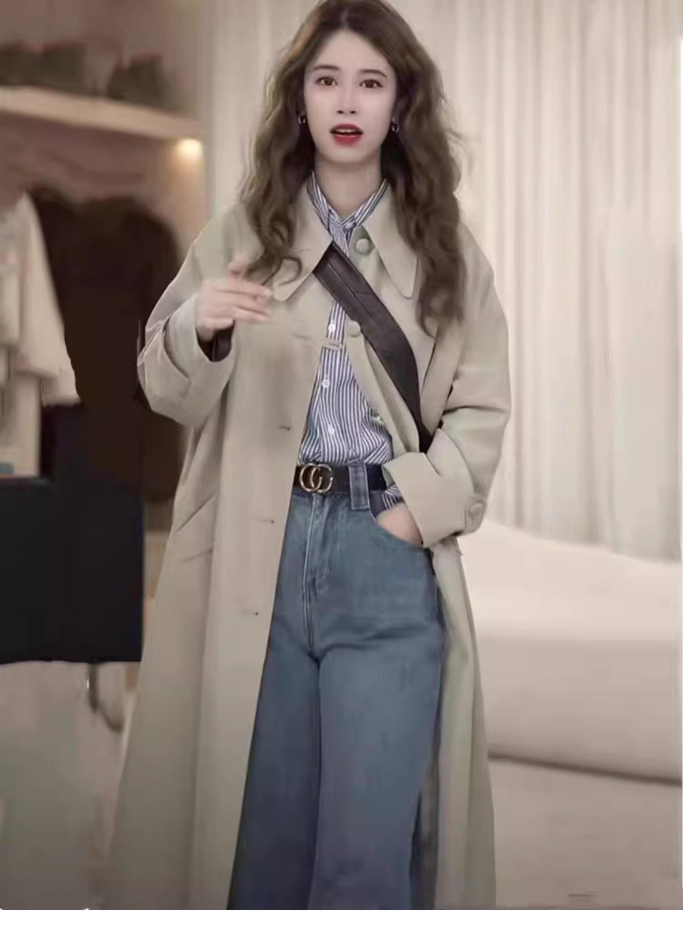 Abrigo Trench de Largo Medio para Mujer Otoño 2024, Chaqueta Nueva Holgada Casual Estilo Británico para Figuras Petite, Estilo para Ir al Trabajo