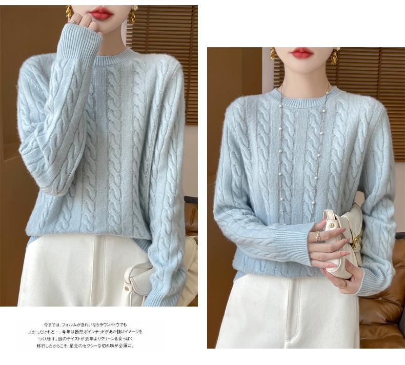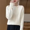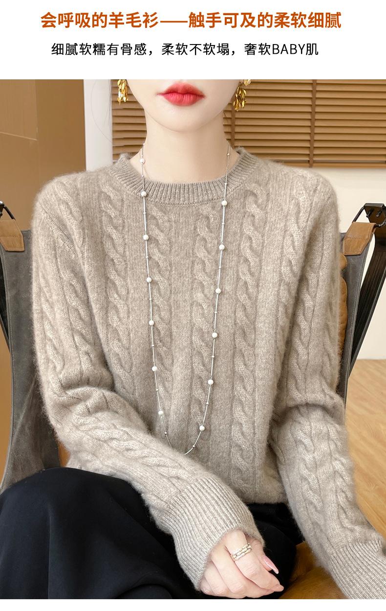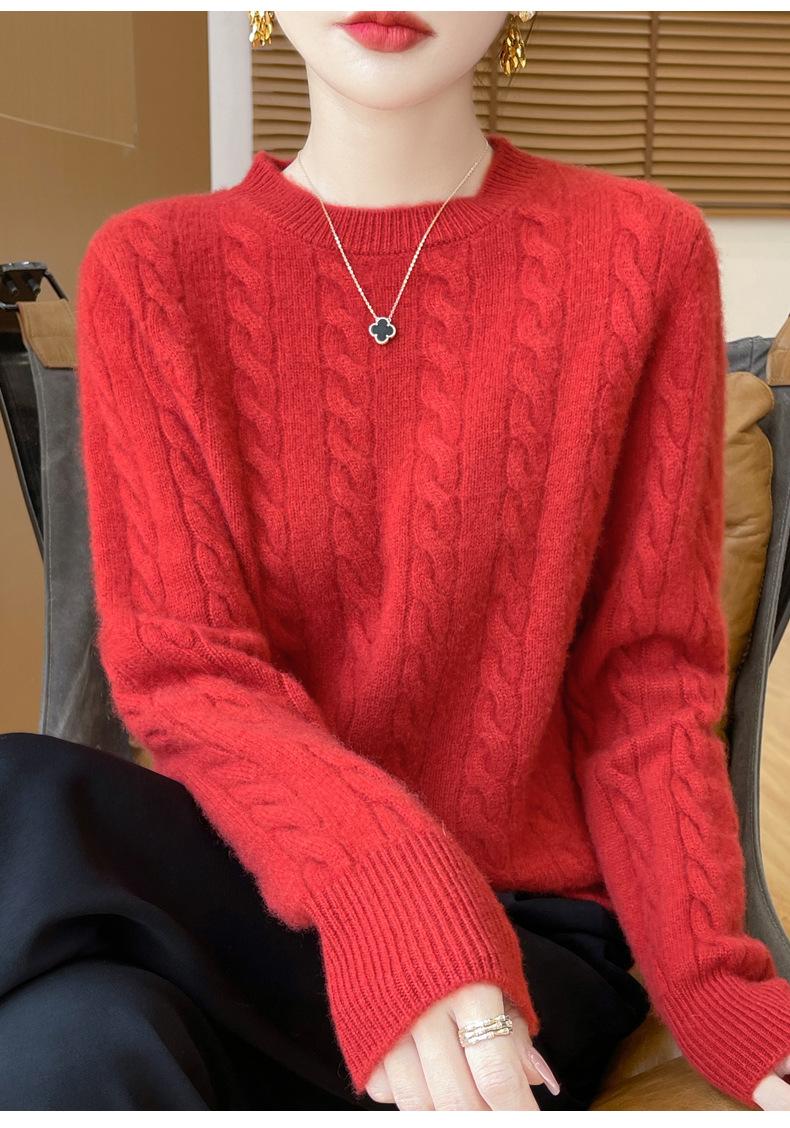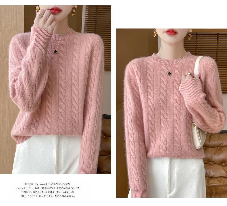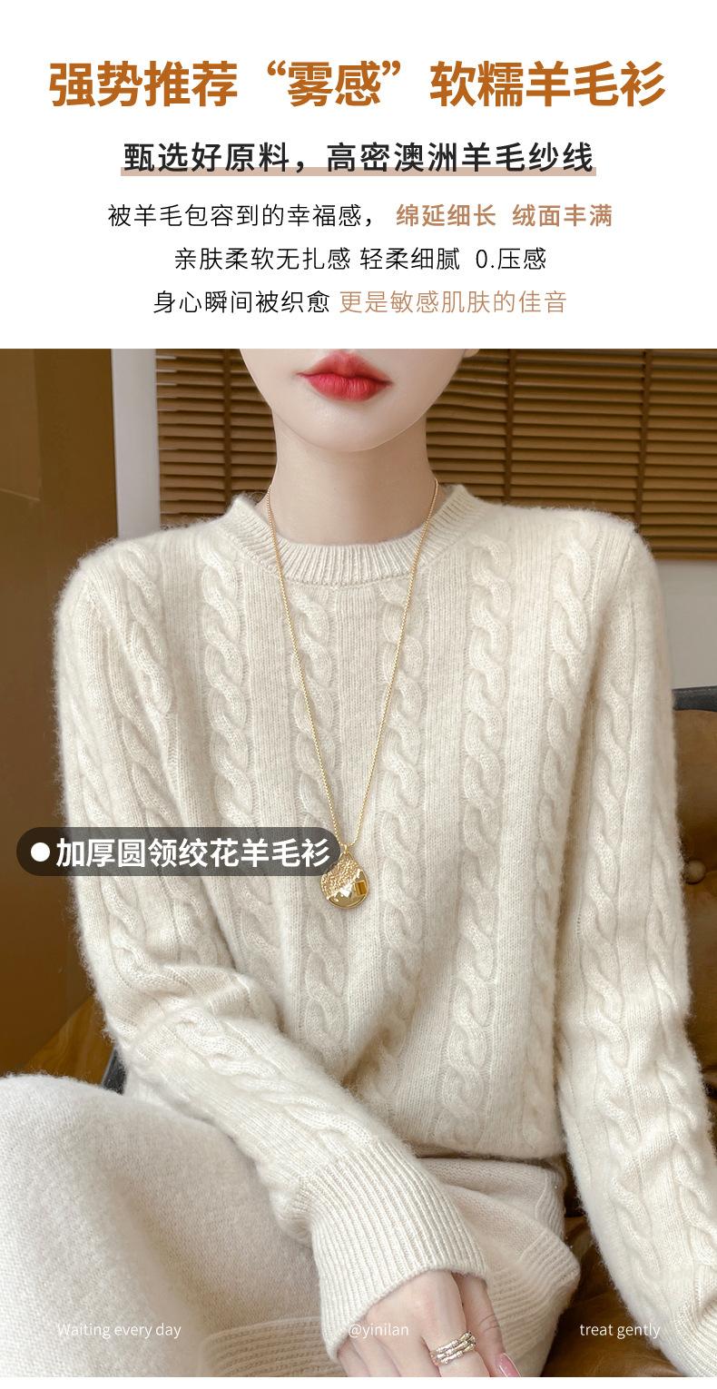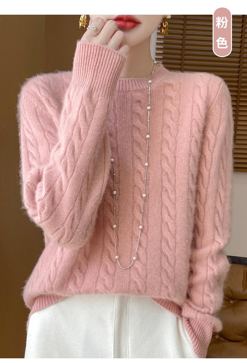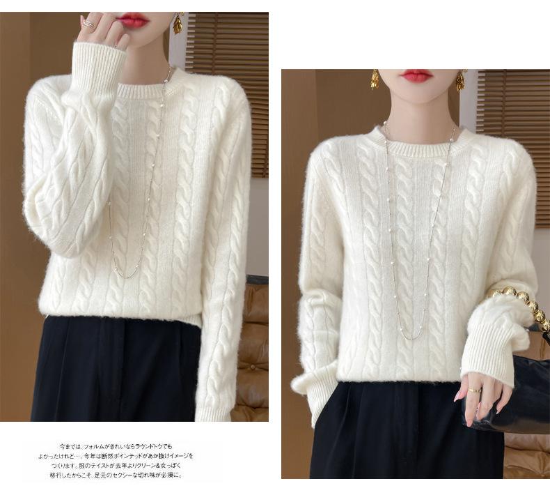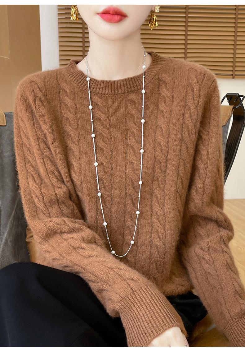 Camisa de punto con cuello redondo trenzado de lana pura para mujer, jersey de manga larga, color sólido, gruesa, para uso diario, otoño e invierno, nueva