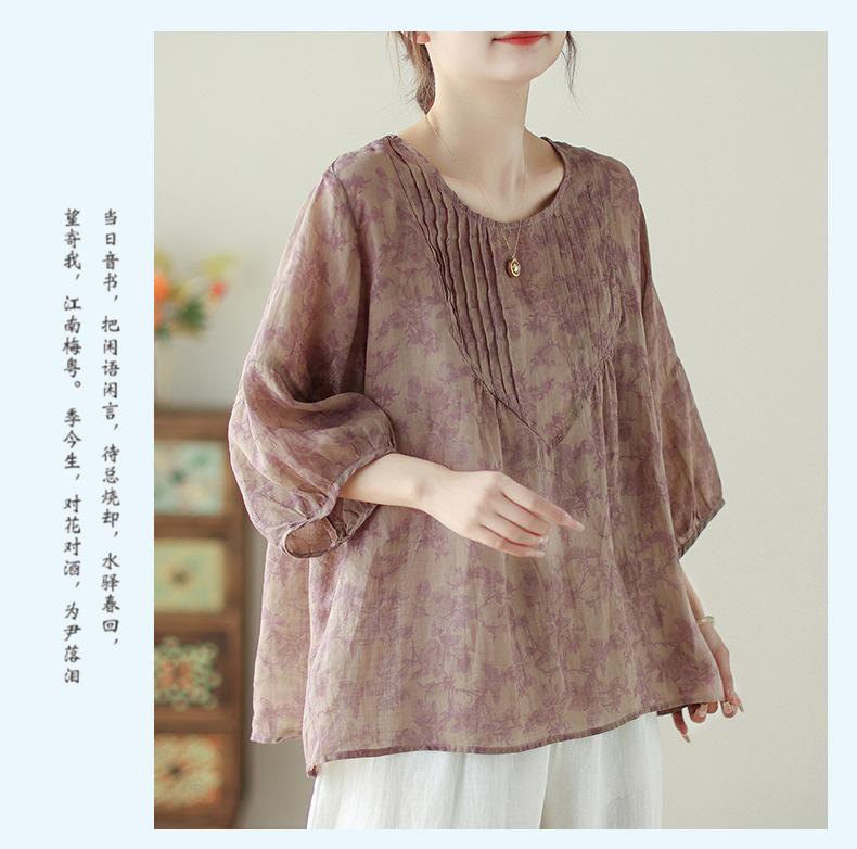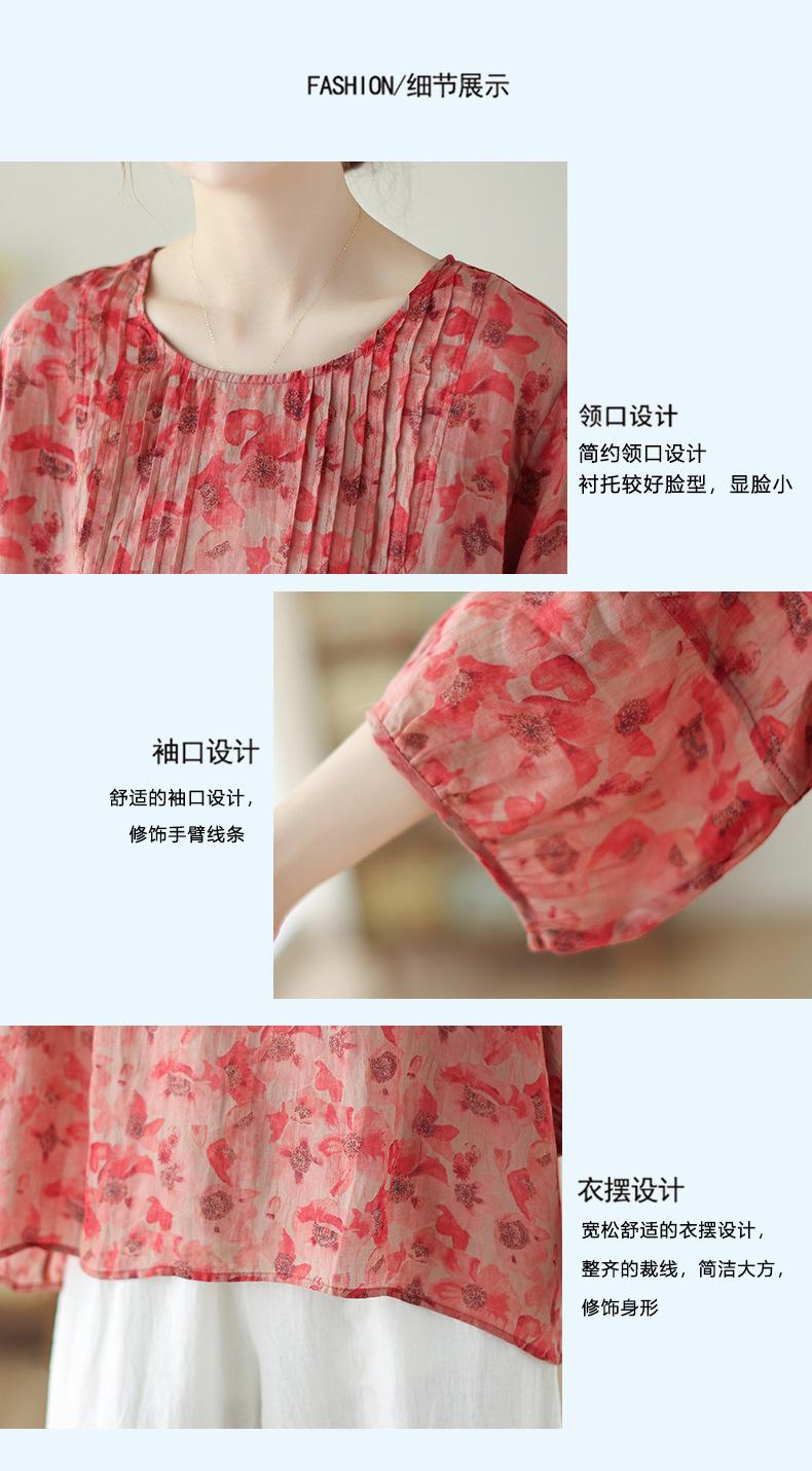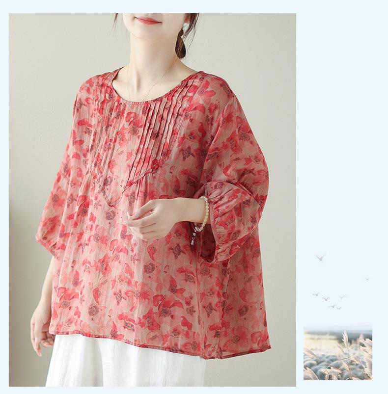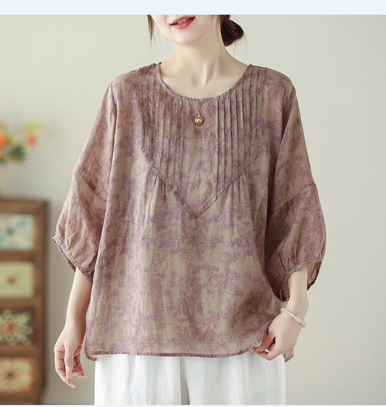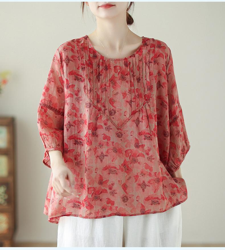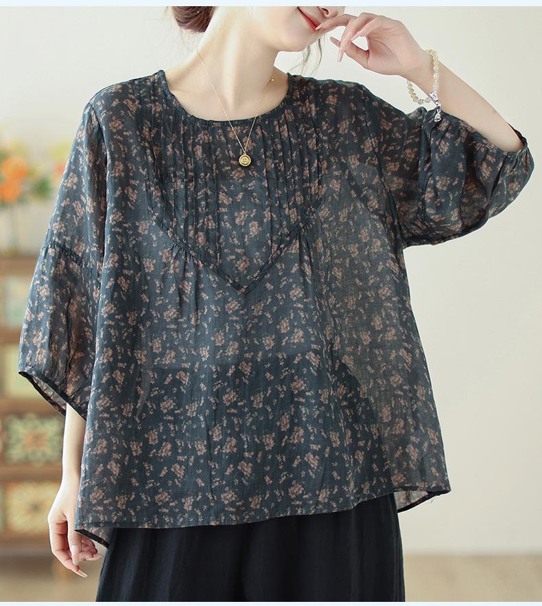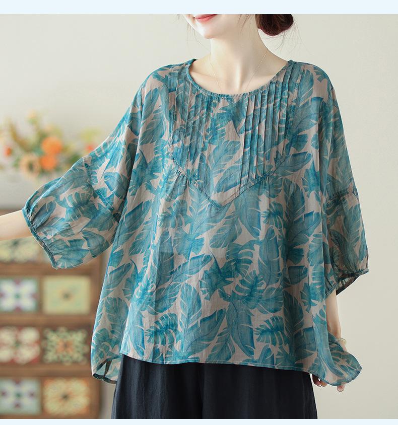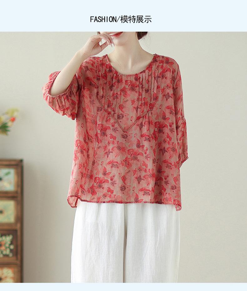 Camiseta de manga corta fina con cuello redondo y estampado floral, estilo artístico, de estilo real, de verano 2024