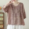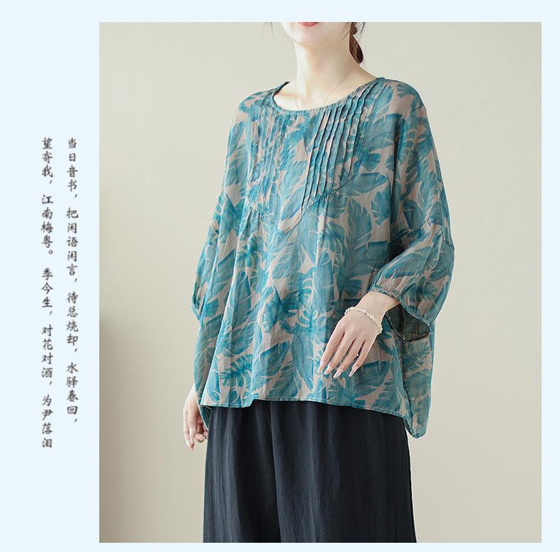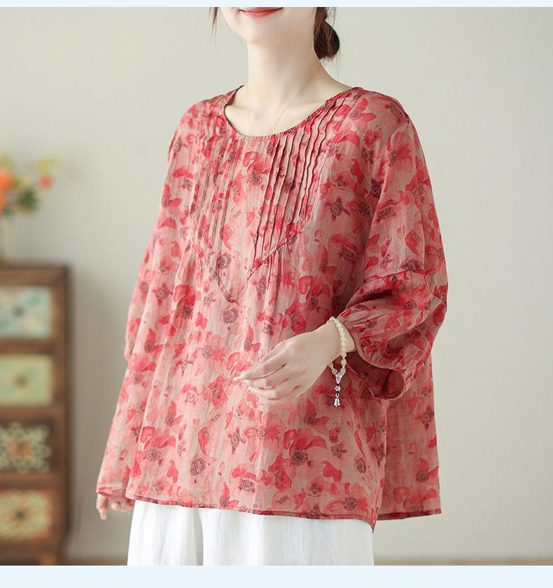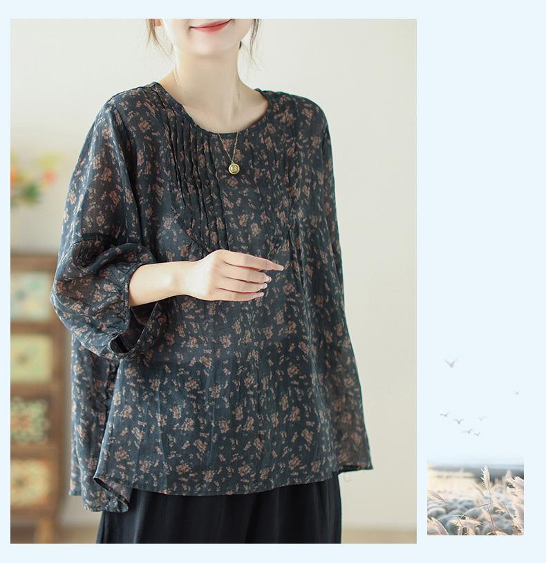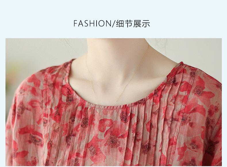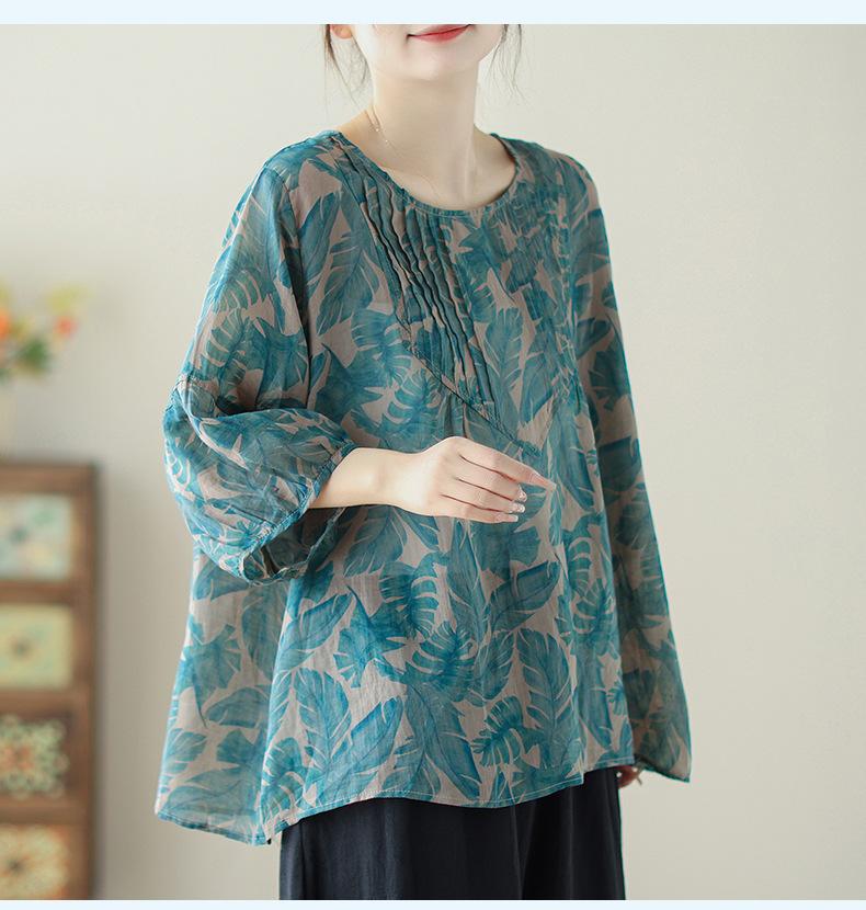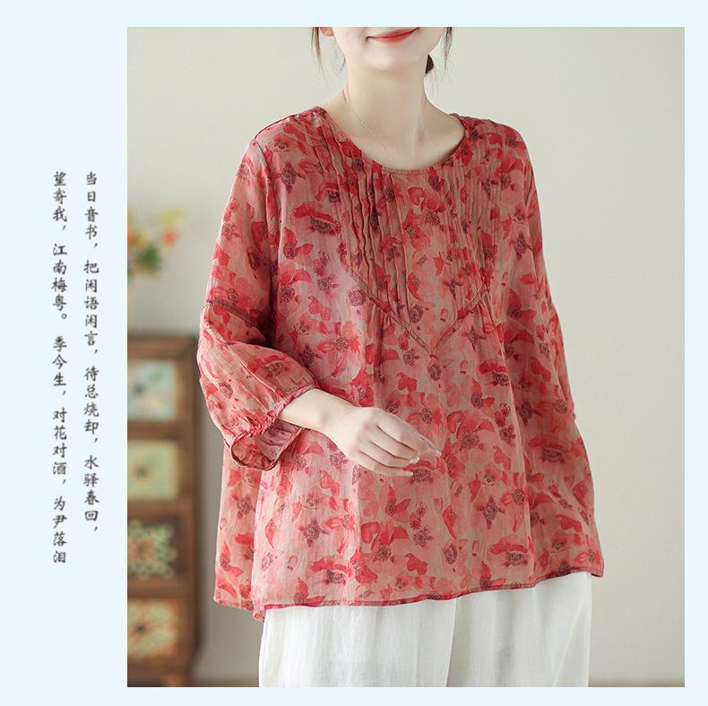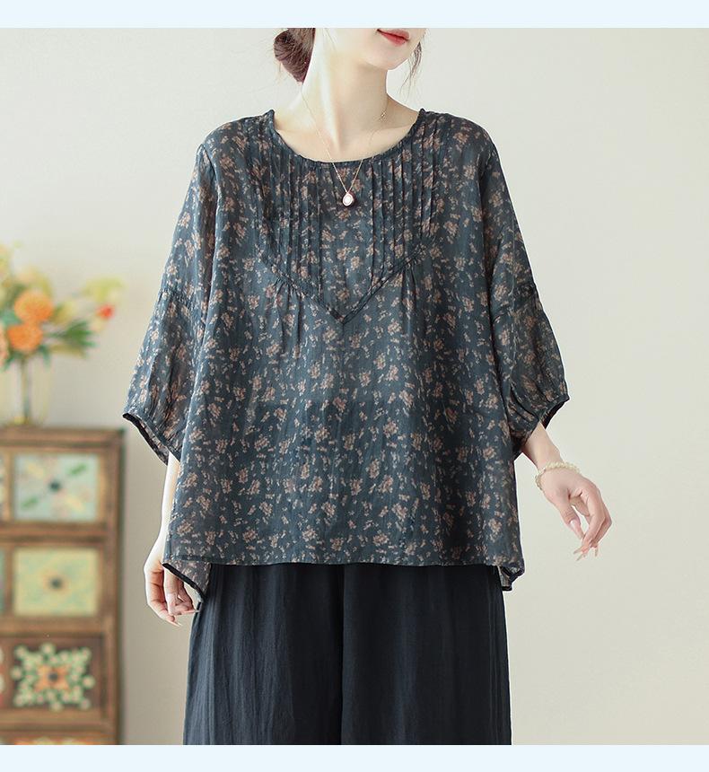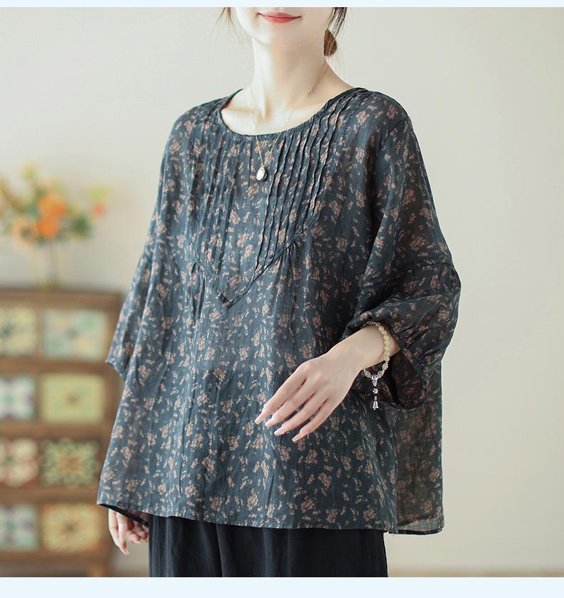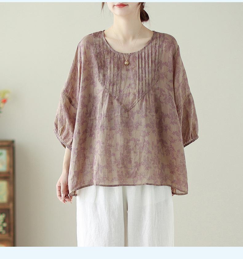 Camiseta de manga corta fina con cuello redondo y estampado floral, estilo artístico, de estilo real, de verano 2024