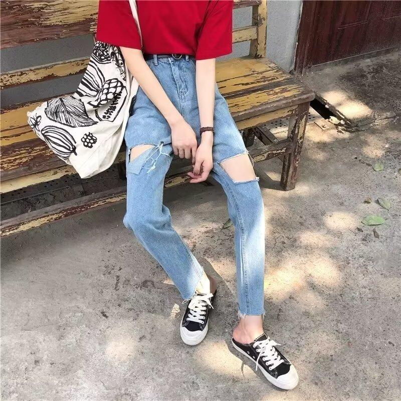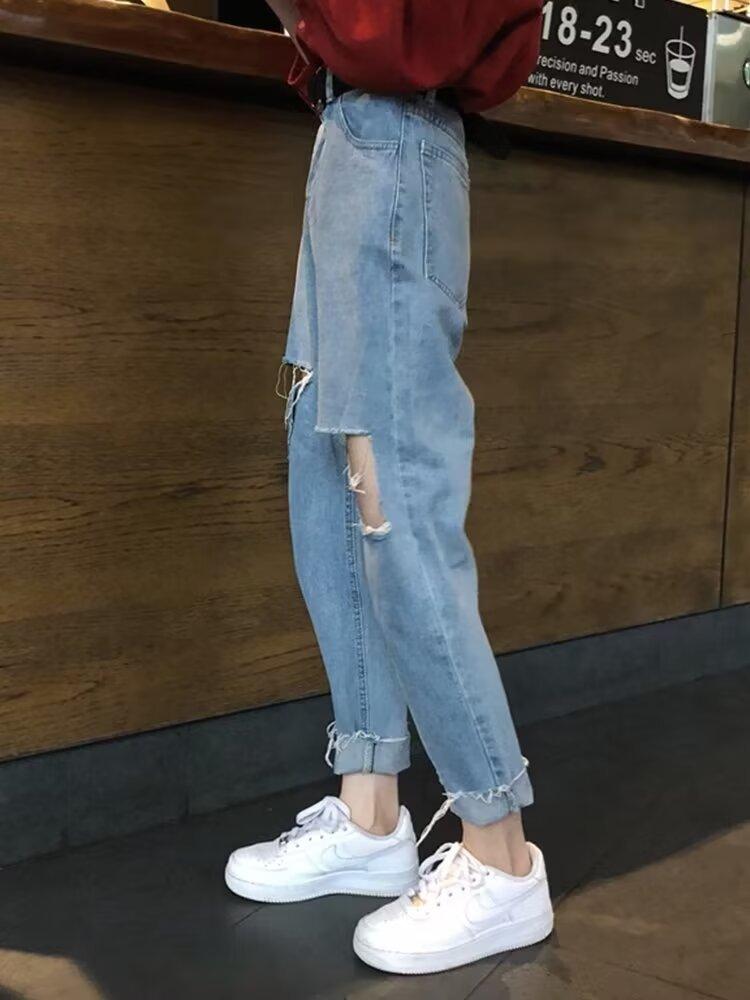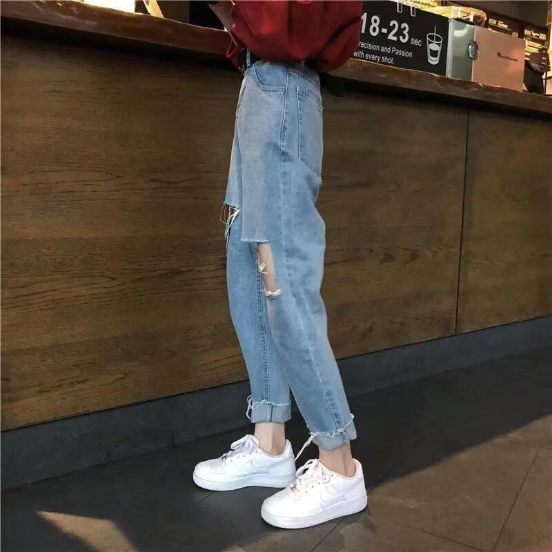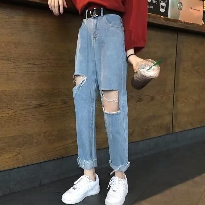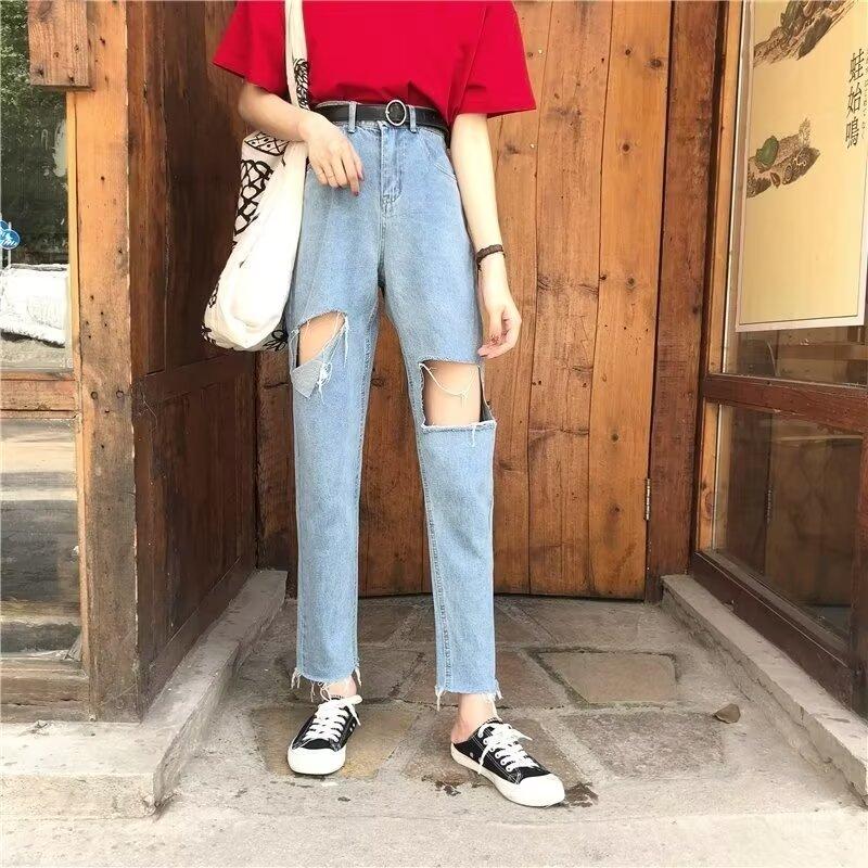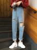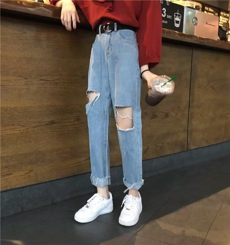 Pantalones vaqueros retro rotos para mujer, verano 2024, nuevos, de cintura alta, holgados, adelgazantes, informales, combinables, de nueve puntos, pantalones harén