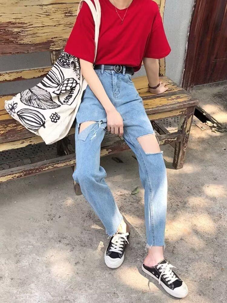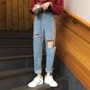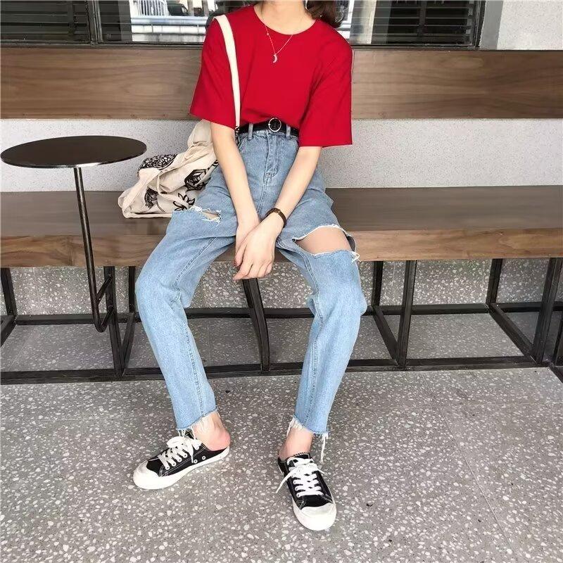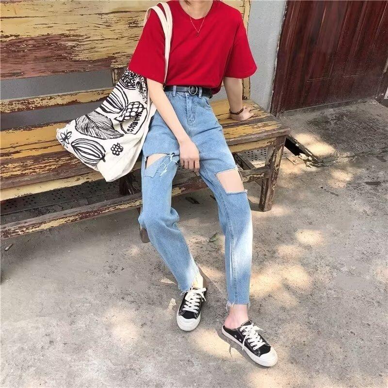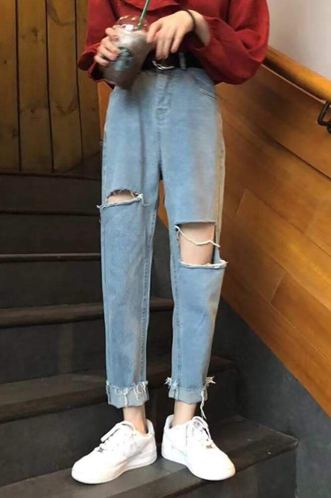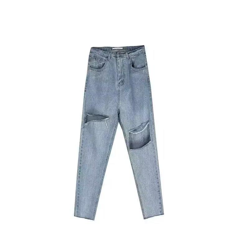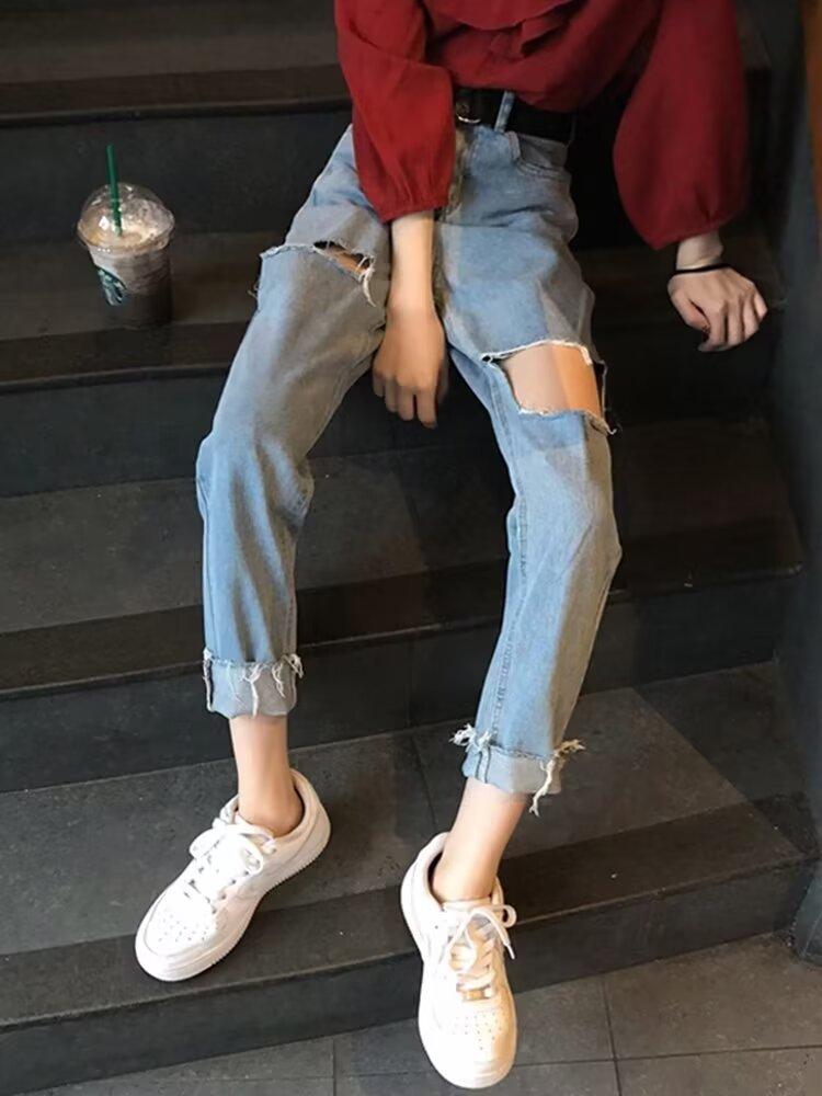 Pantalones vaqueros retro rotos para mujer, verano 2024, nuevos, de cintura alta, holgados, adelgazantes, informales, combinables, de nueve puntos, pantalones harén