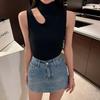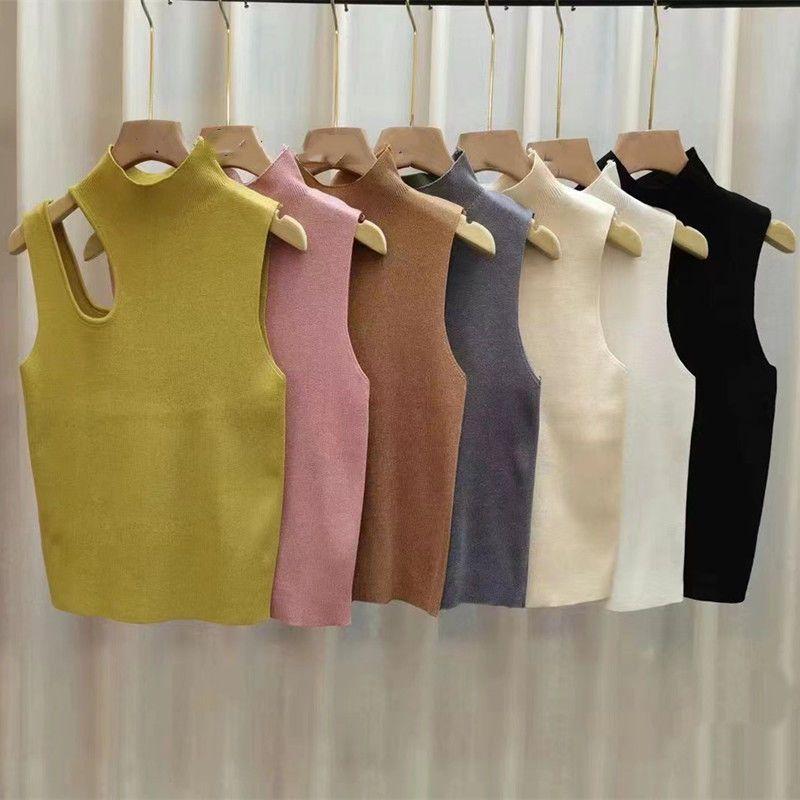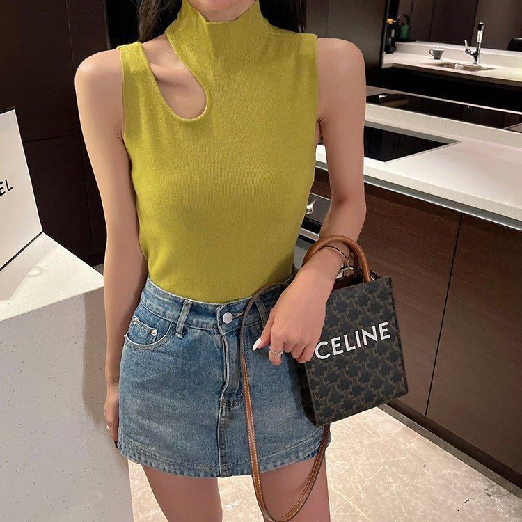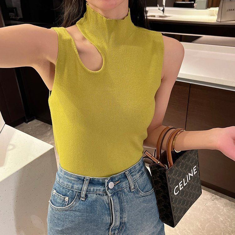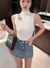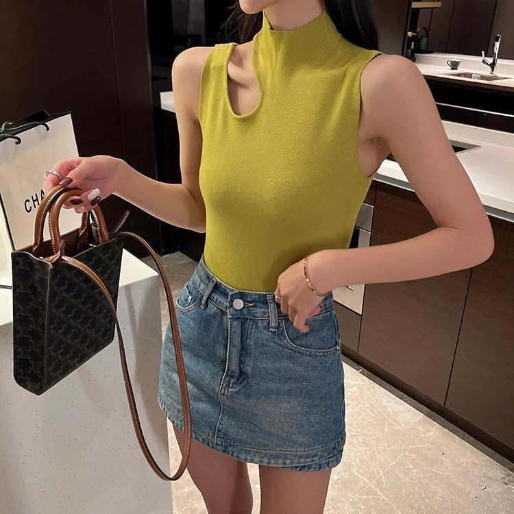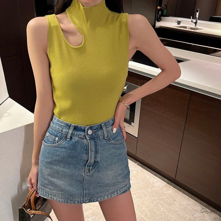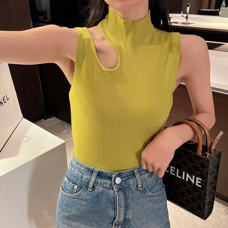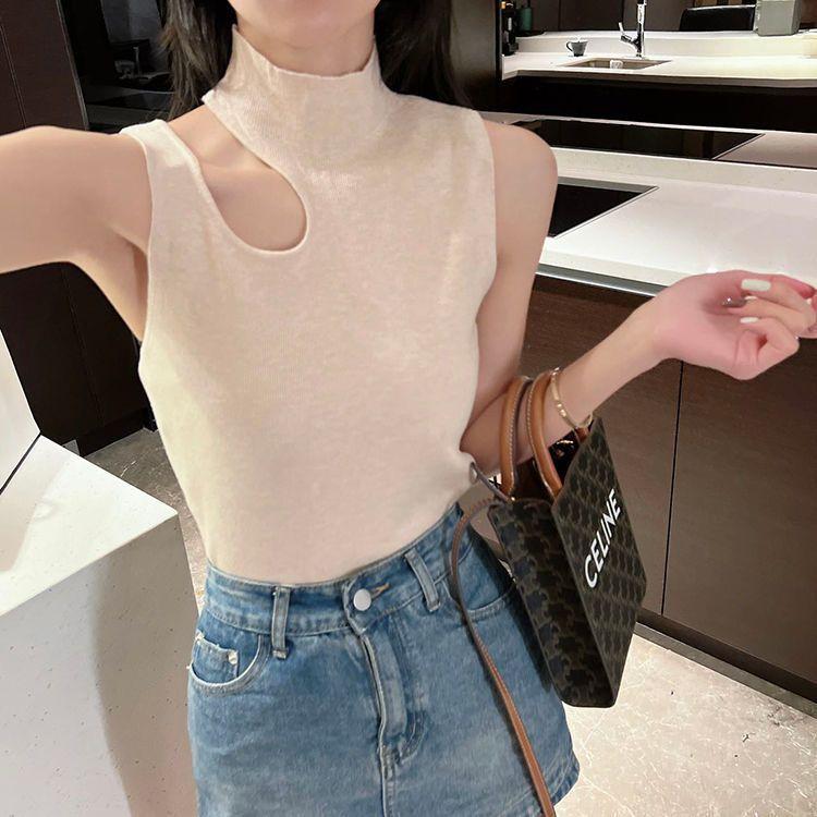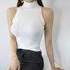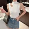 Top sin mangas calado para mujer, prenda exterior, estilo sexy y seductor, top corto ajustado de cuello alto, verano de cuello alto calado