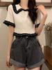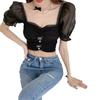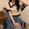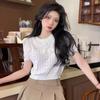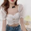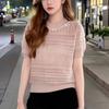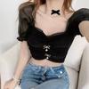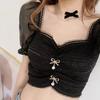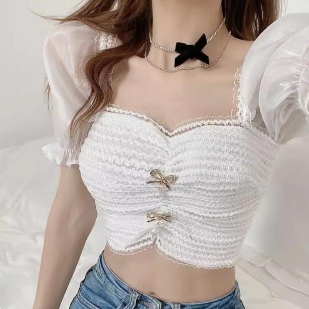 Diseño francés Sense Verano Nuevo Lindo Exquisito Lazo Tejido Top Corto Nicho Dulce Manga Corta
