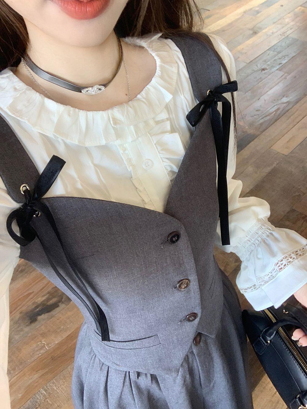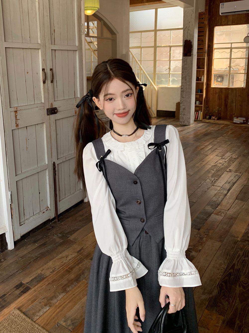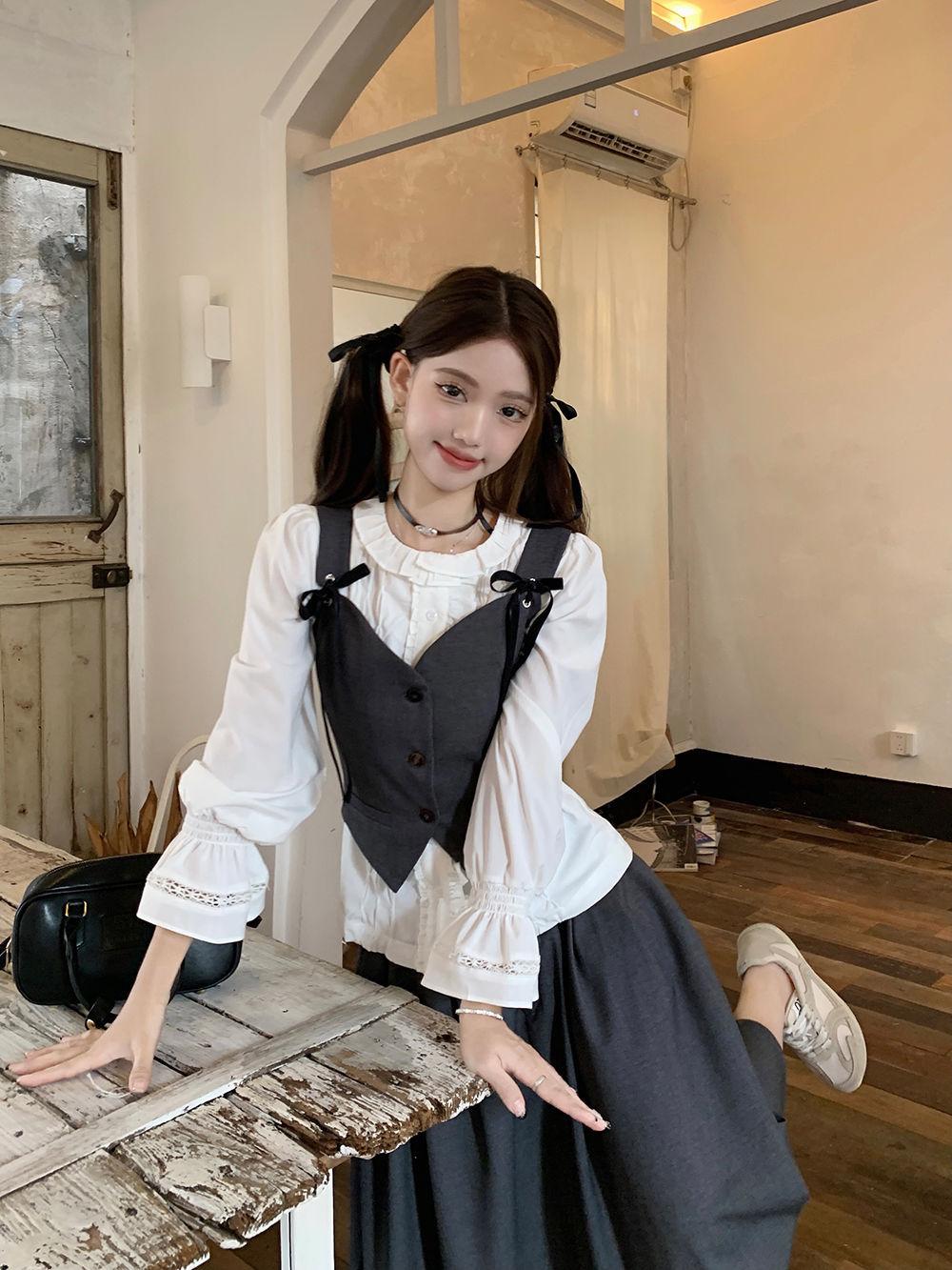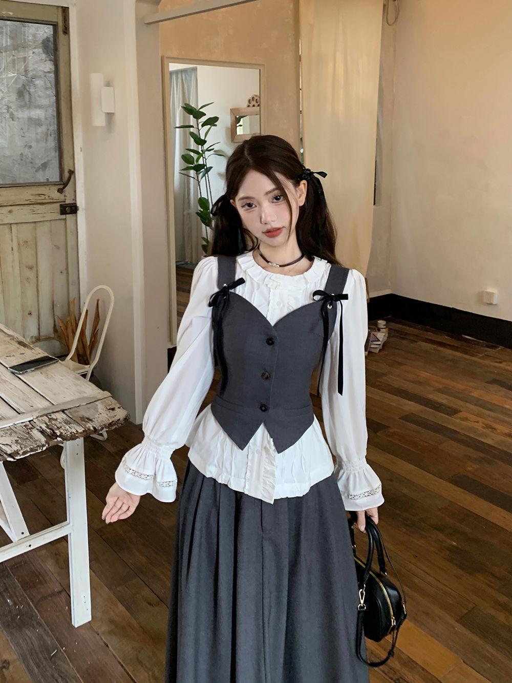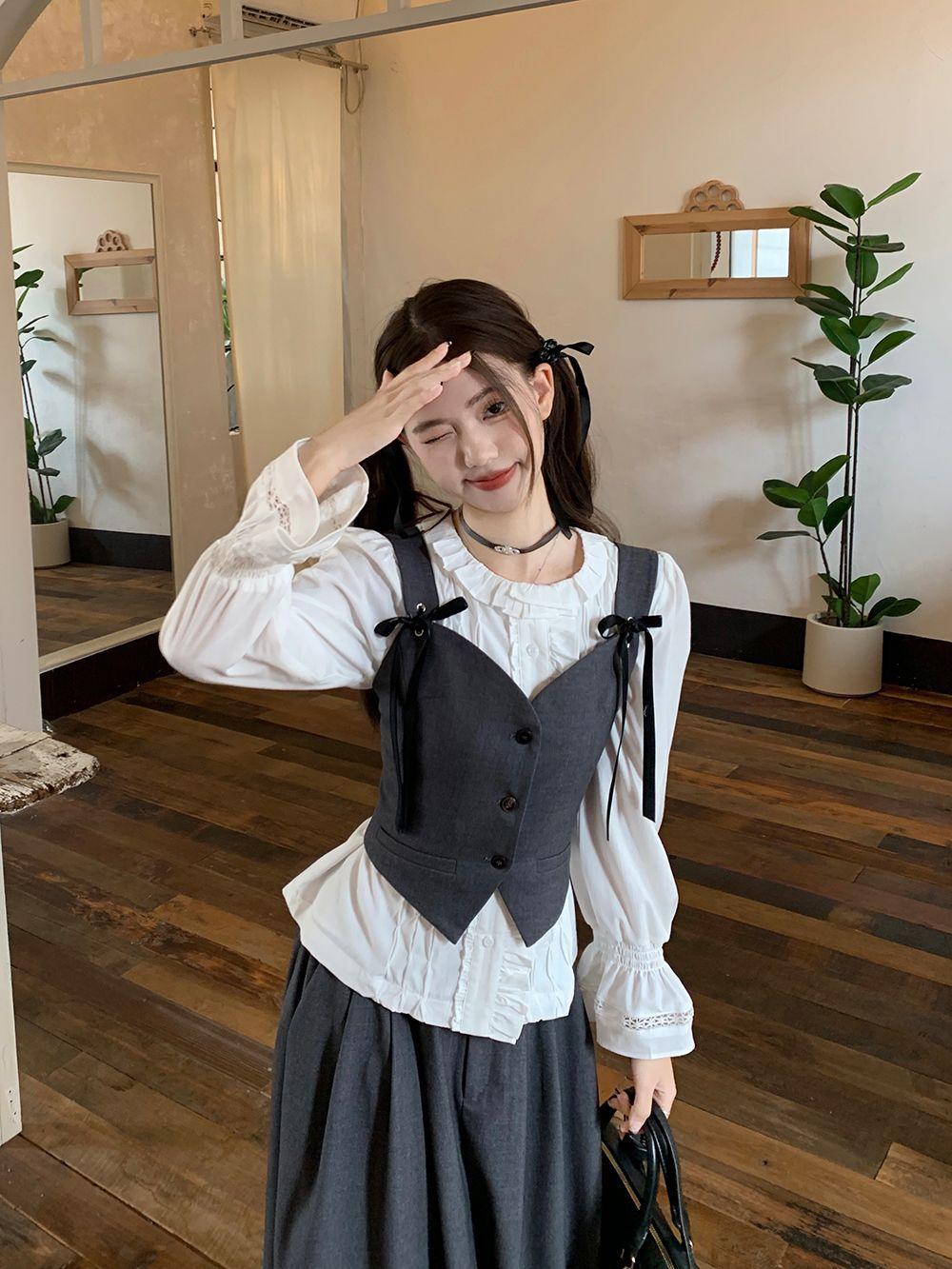 Chaleco de Capas con Lazo, Camisa Hueca de Manga Larga, Falda Slim a Media Pierna, Traje de Moda Nueva para Principios de Primavera para Mujer