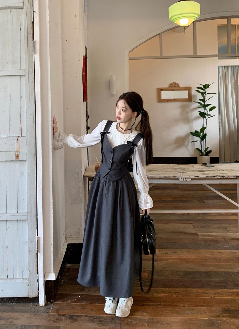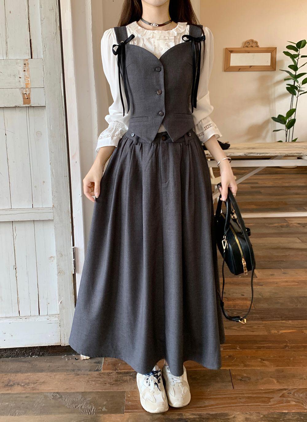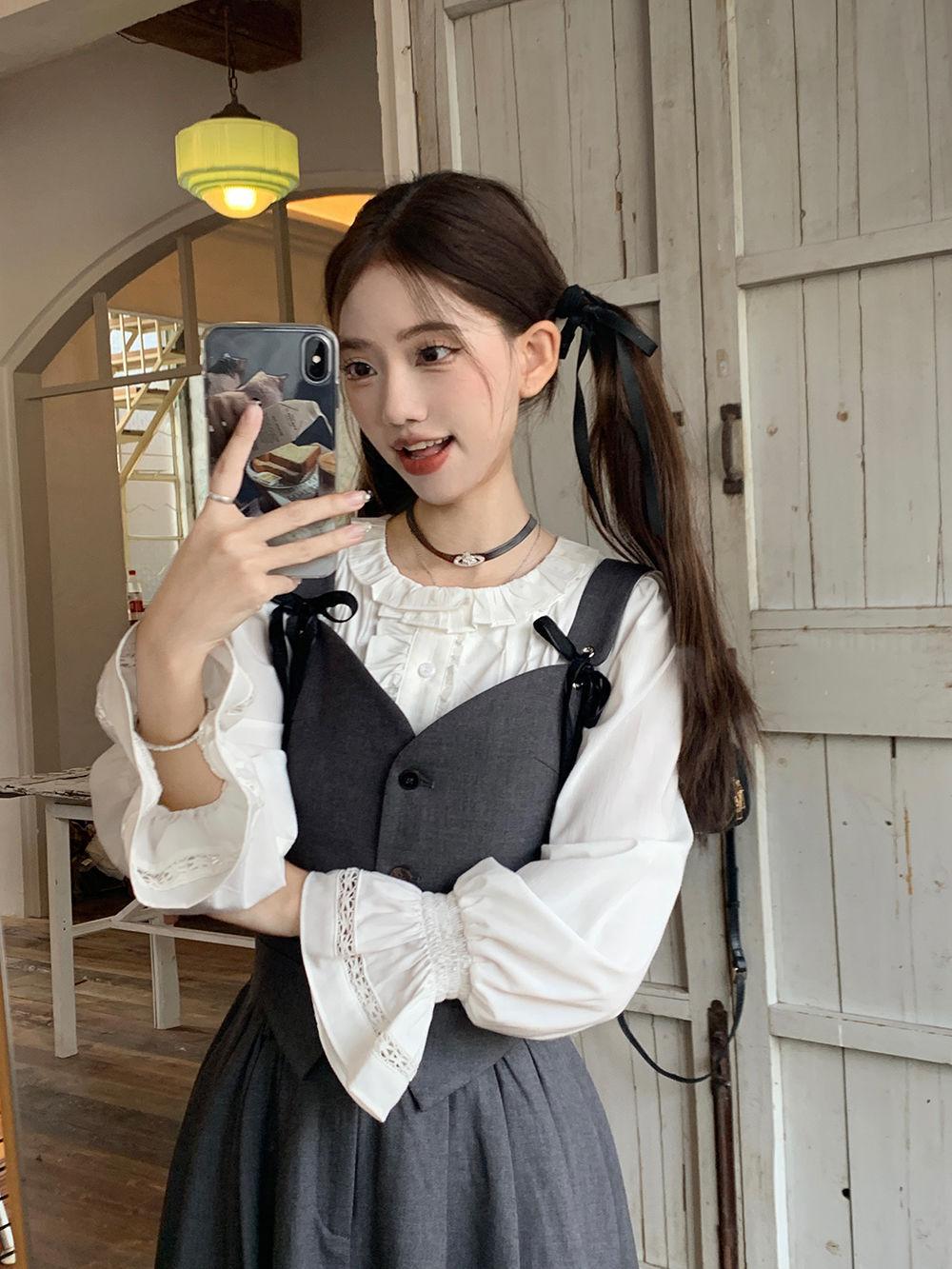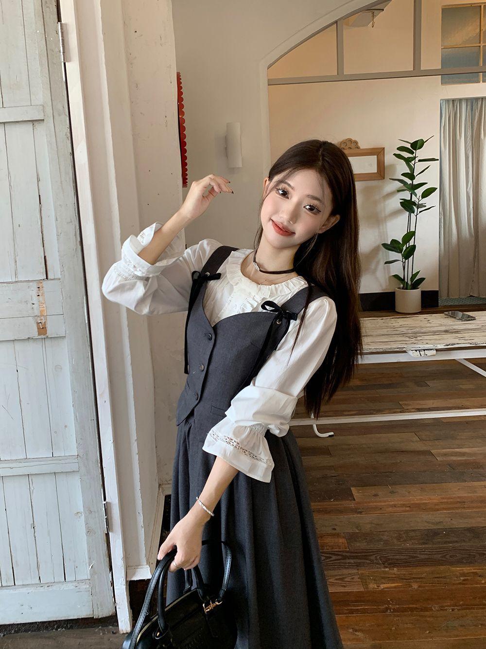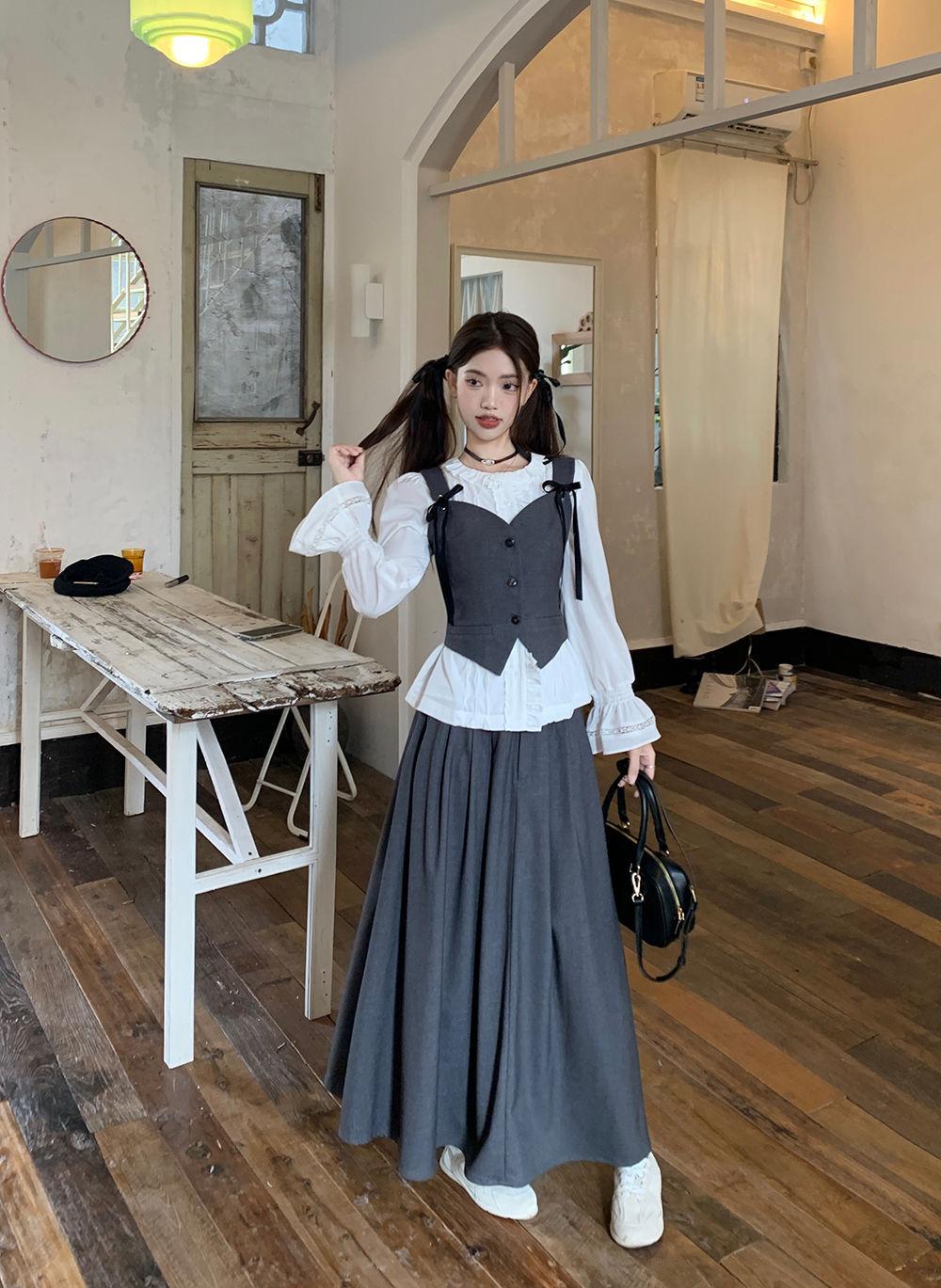 Chaleco de Capas con Lazo, Camisa Hueca de Manga Larga, Falda Slim a Media Pierna, Traje de Moda Nueva para Principios de Primavera para Mujer