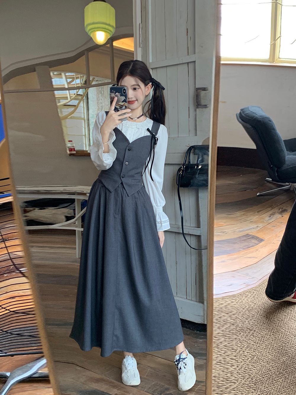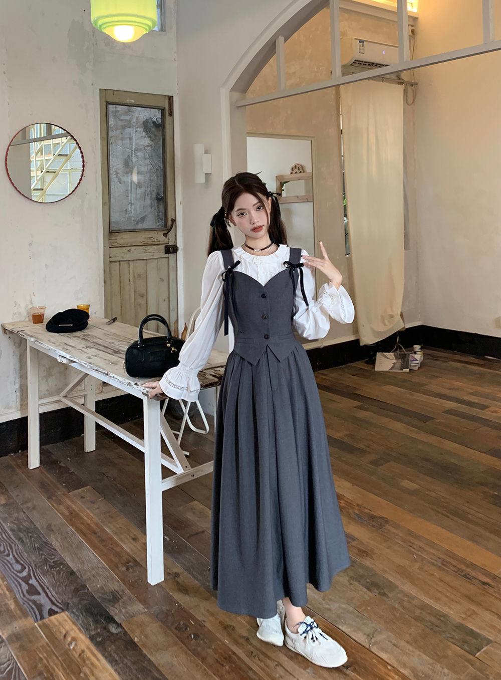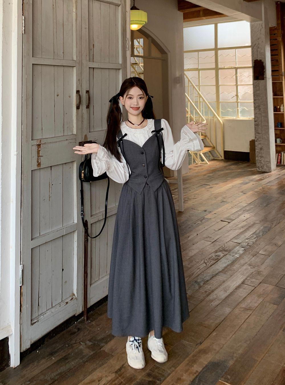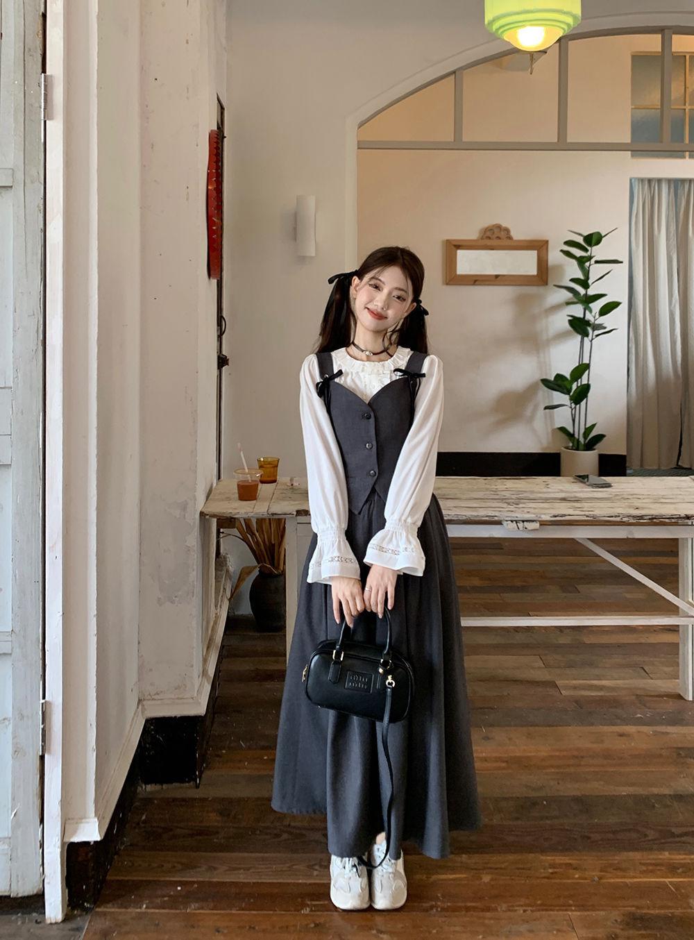 Chaleco de Capas con Lazo, Camisa Hueca de Manga Larga, Falda Slim a Media Pierna, Traje de Moda Nueva para Principios de Primavera para Mujer