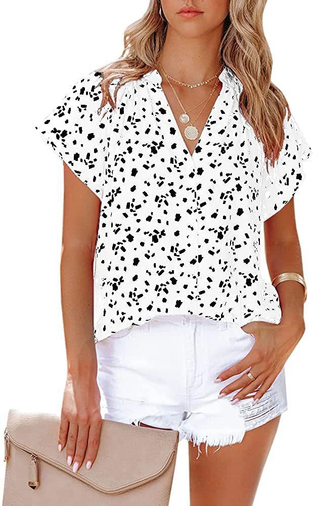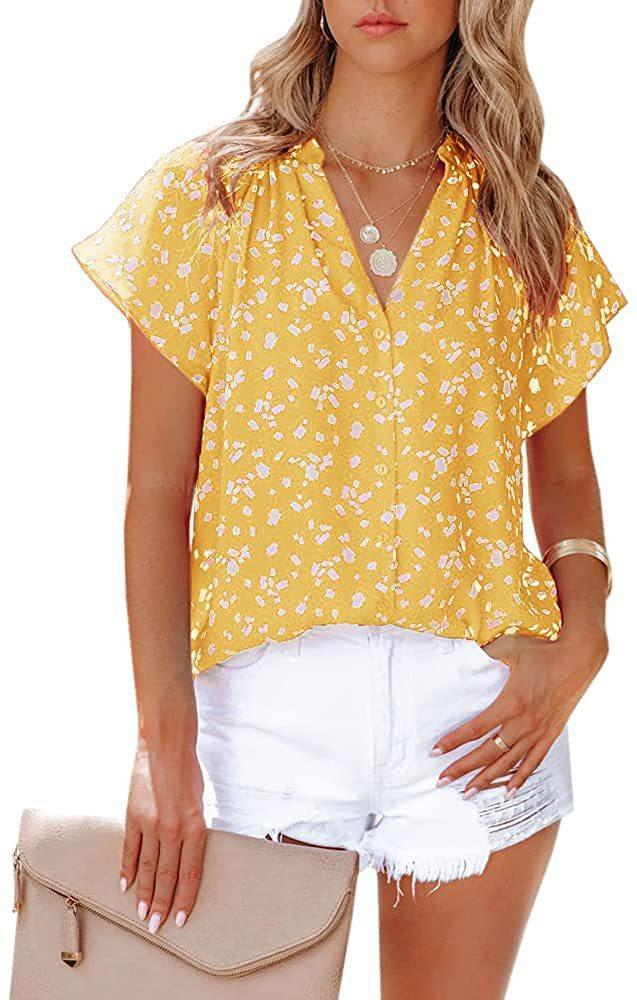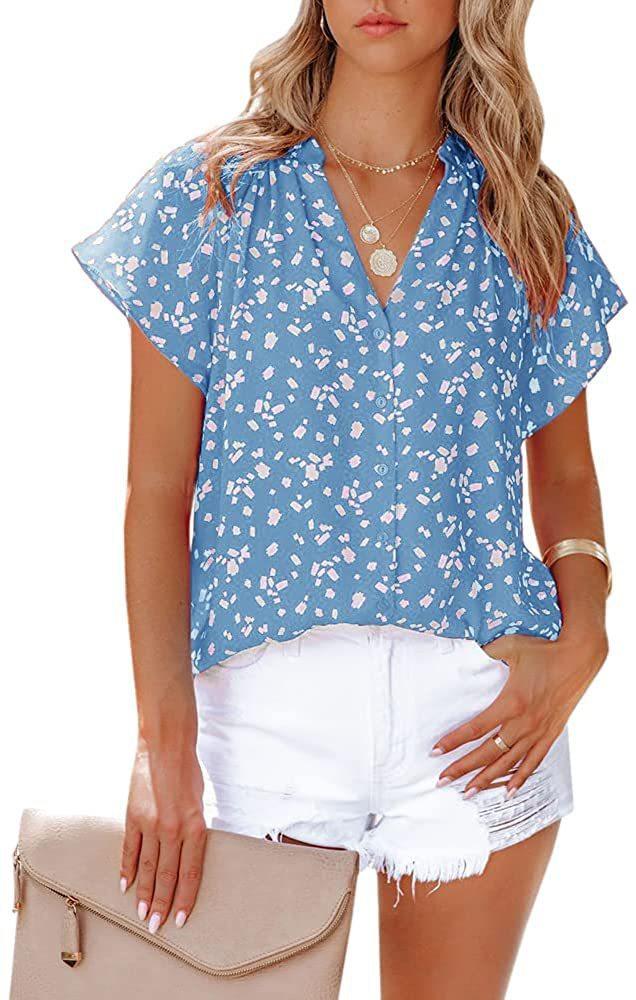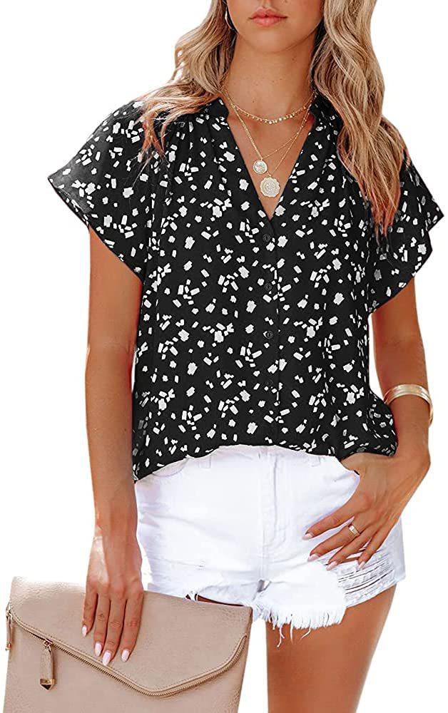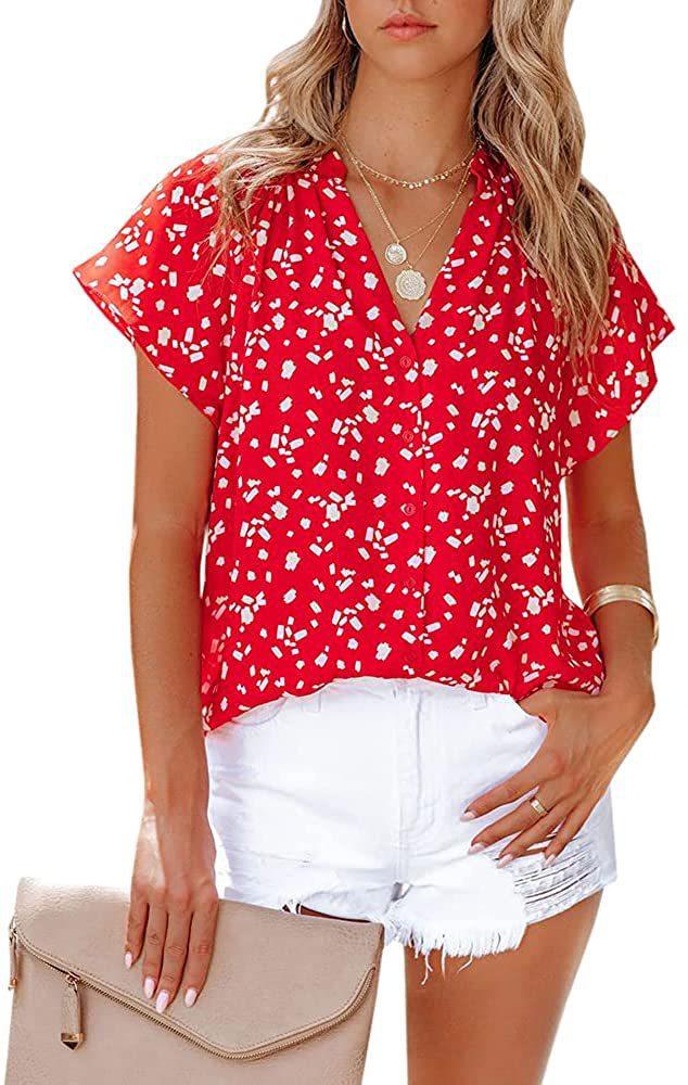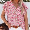 Camiseta de manga corta arrugada con botones y estampado floral, camisa informal de verano holgada y fluida