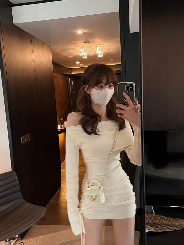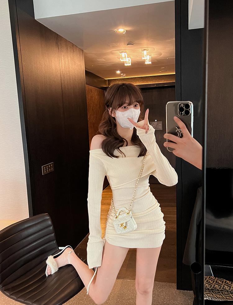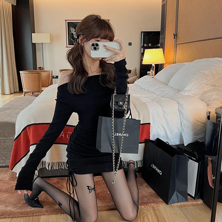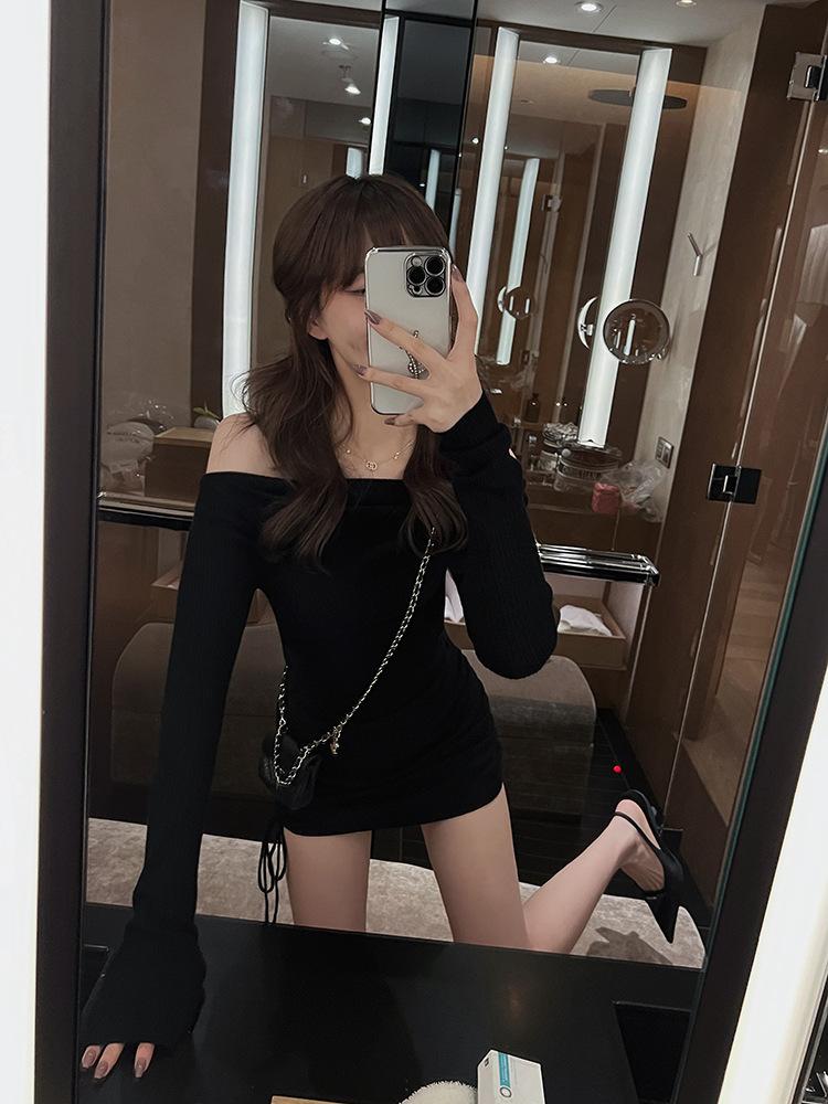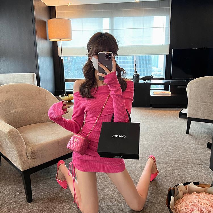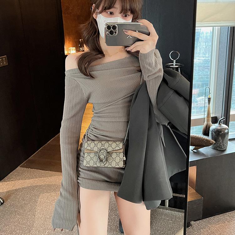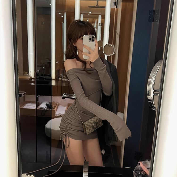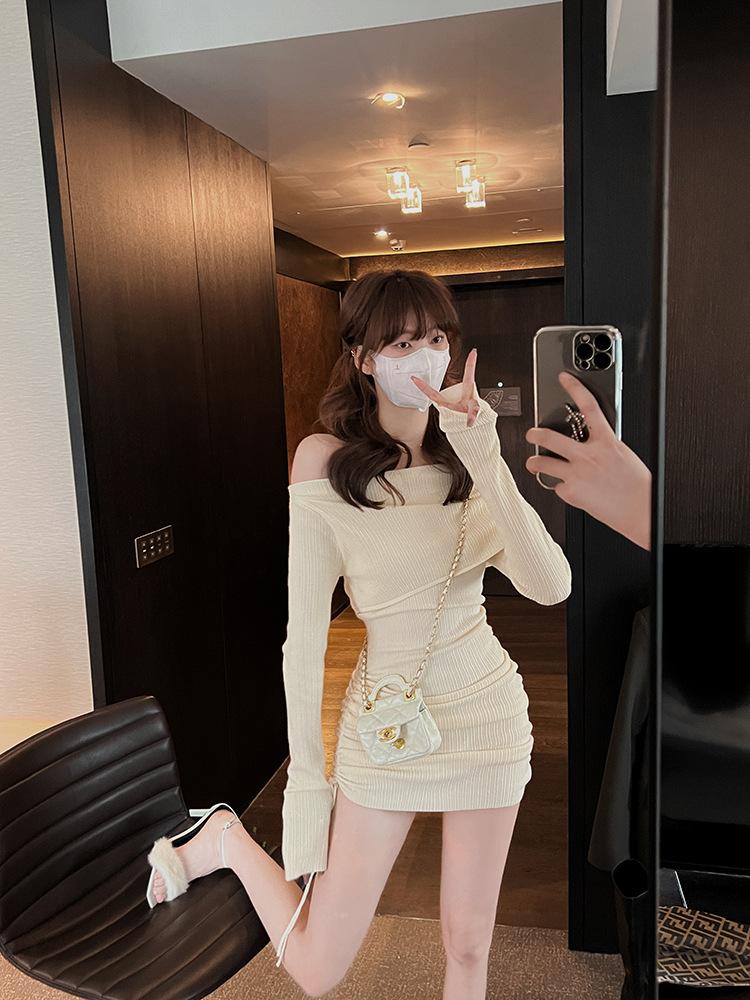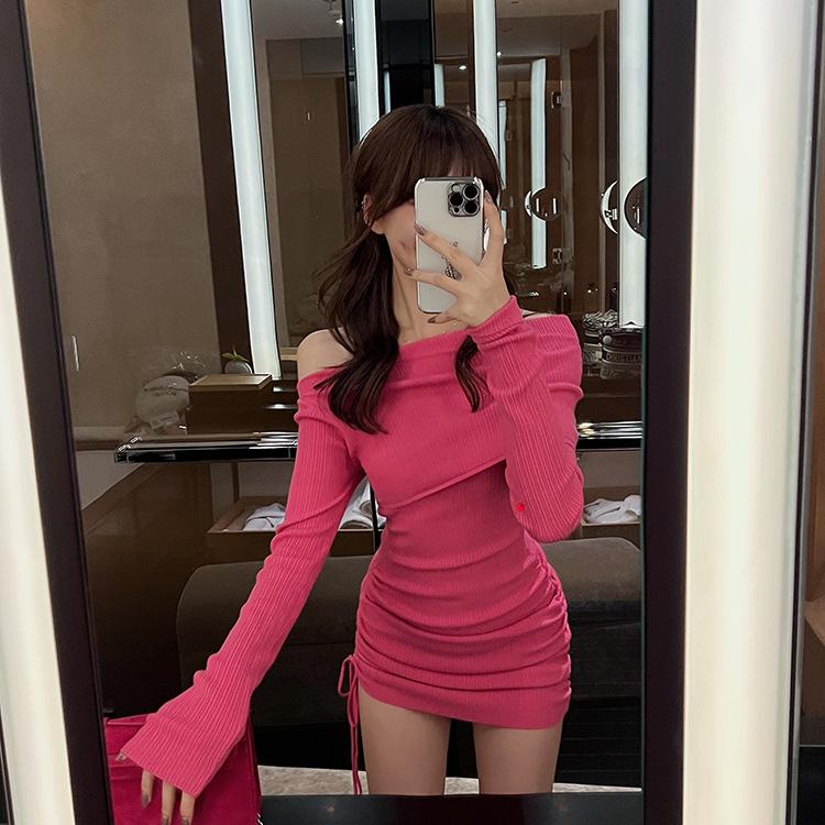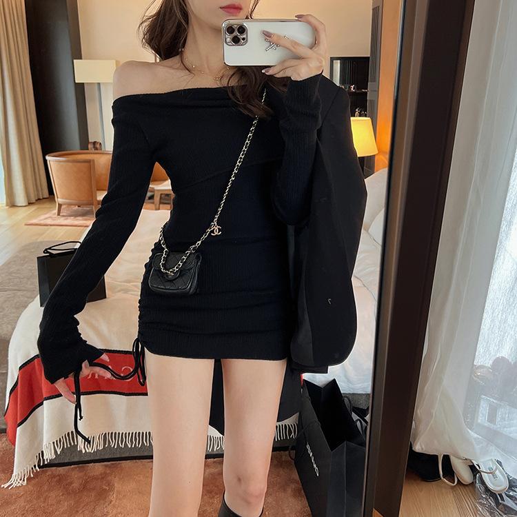 Vestido ajustado de punto con hombros descubiertos y manga larga para mujer, sexy y sexy, ajustado hasta la cadera.