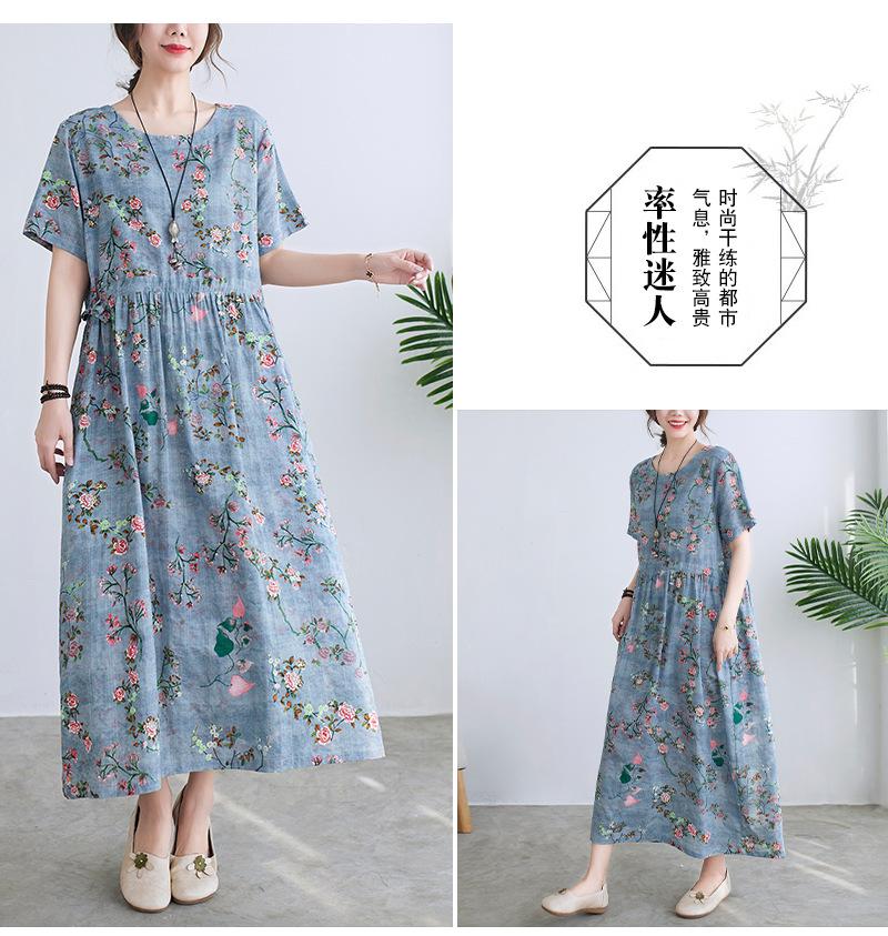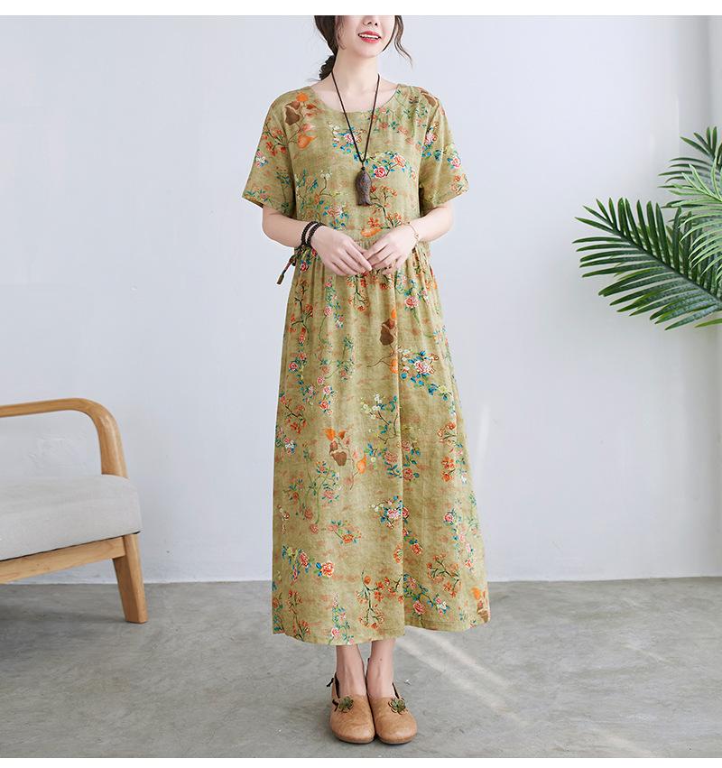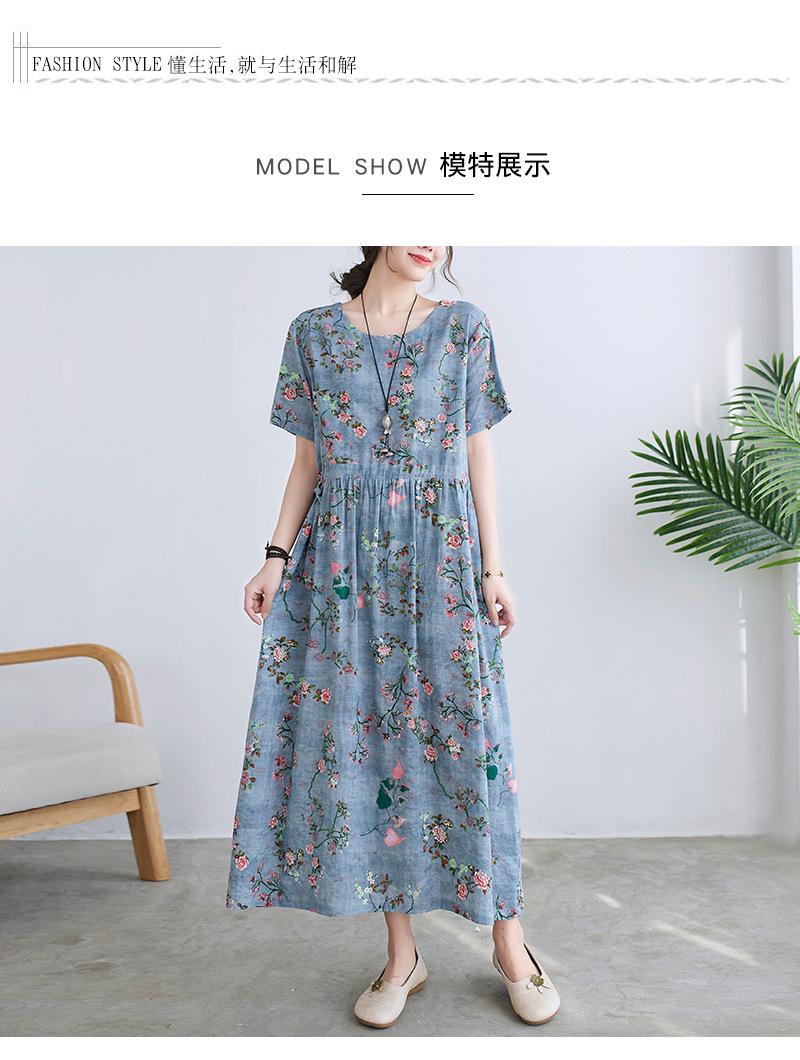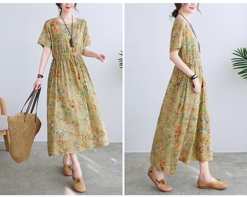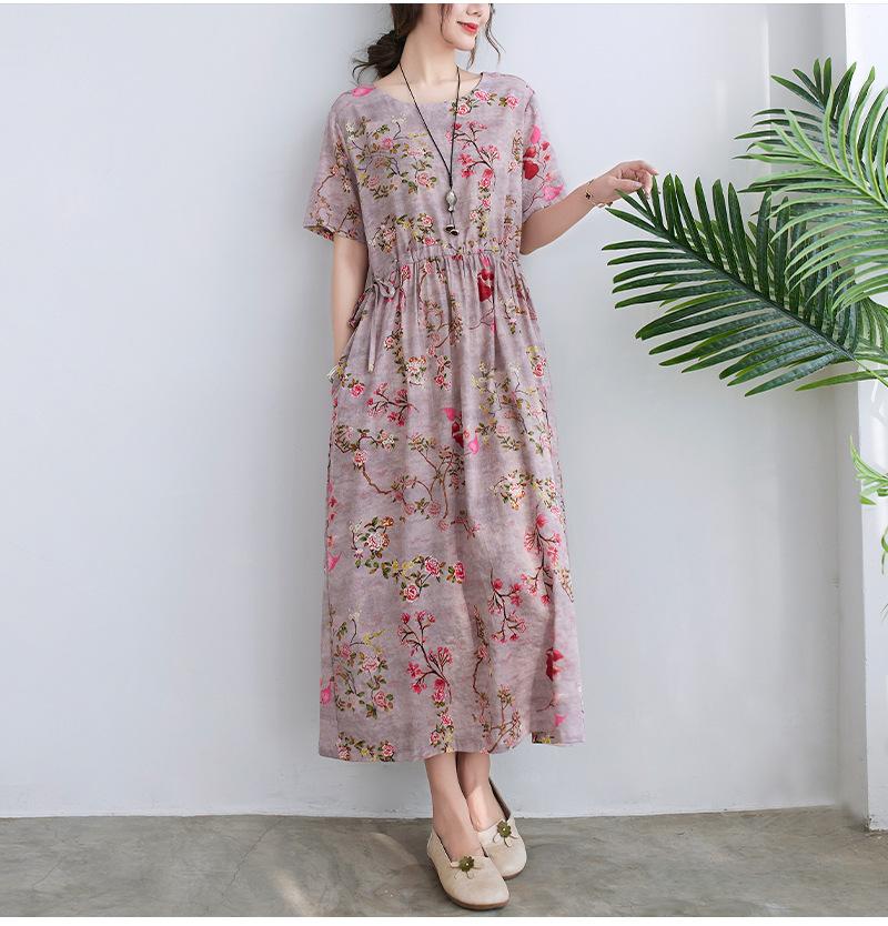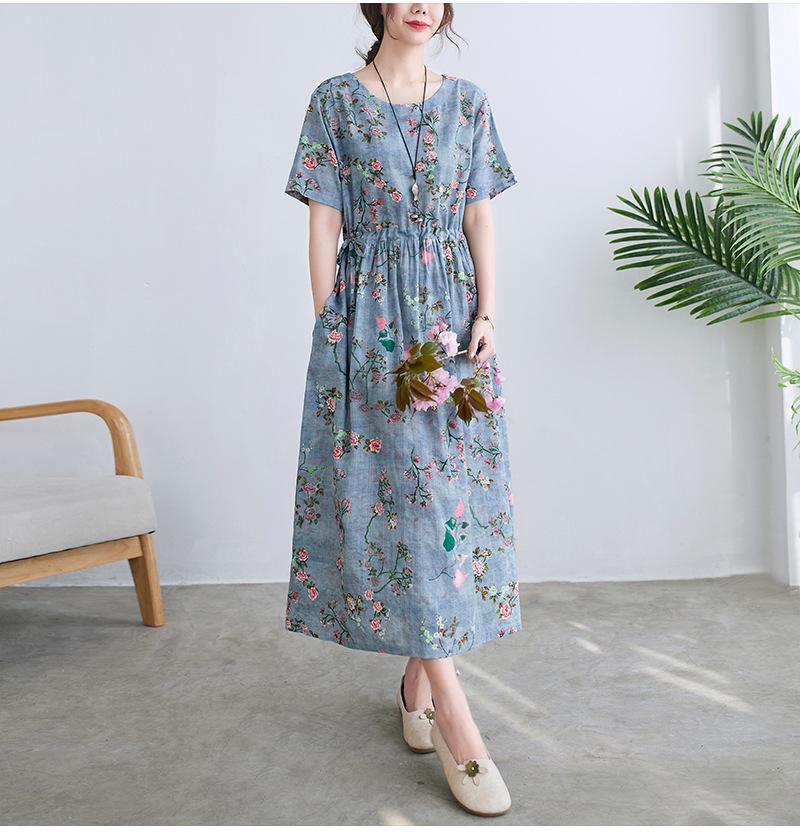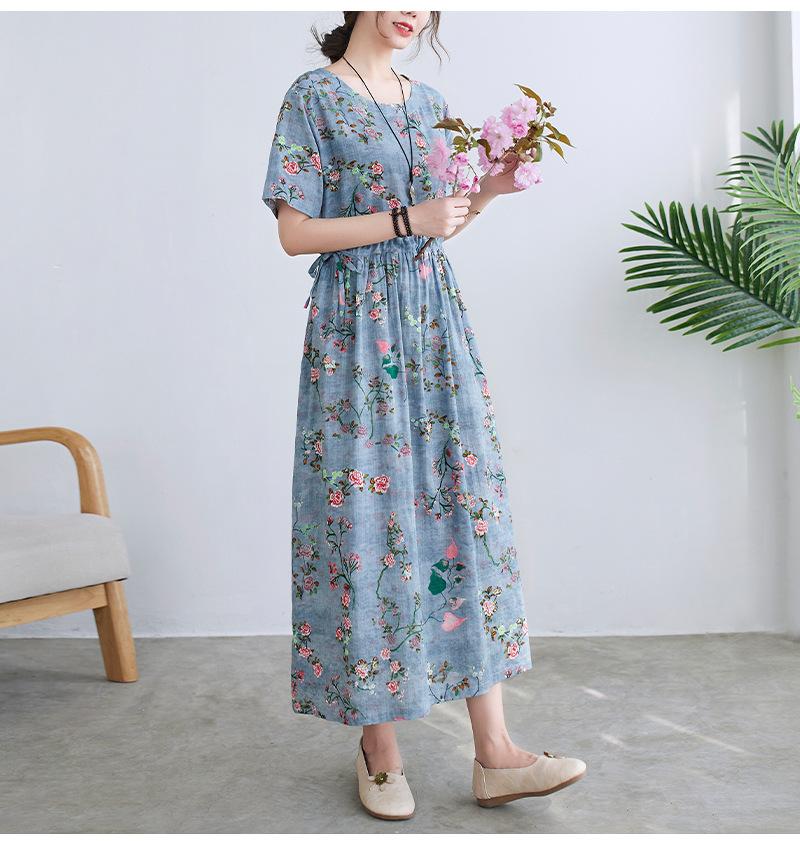 Vestido Floral Artístico Retro de Algodón y Lino para Mujer 2024 Verano Nuevo Vestido Largo Holgado con Cintura Ceñida y Bajo Amplio