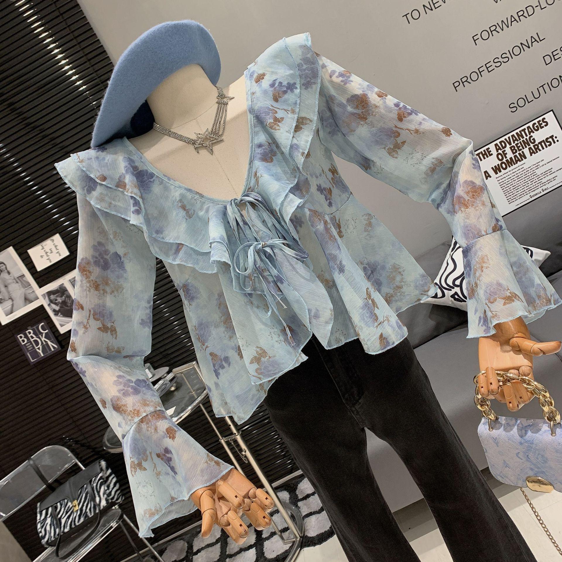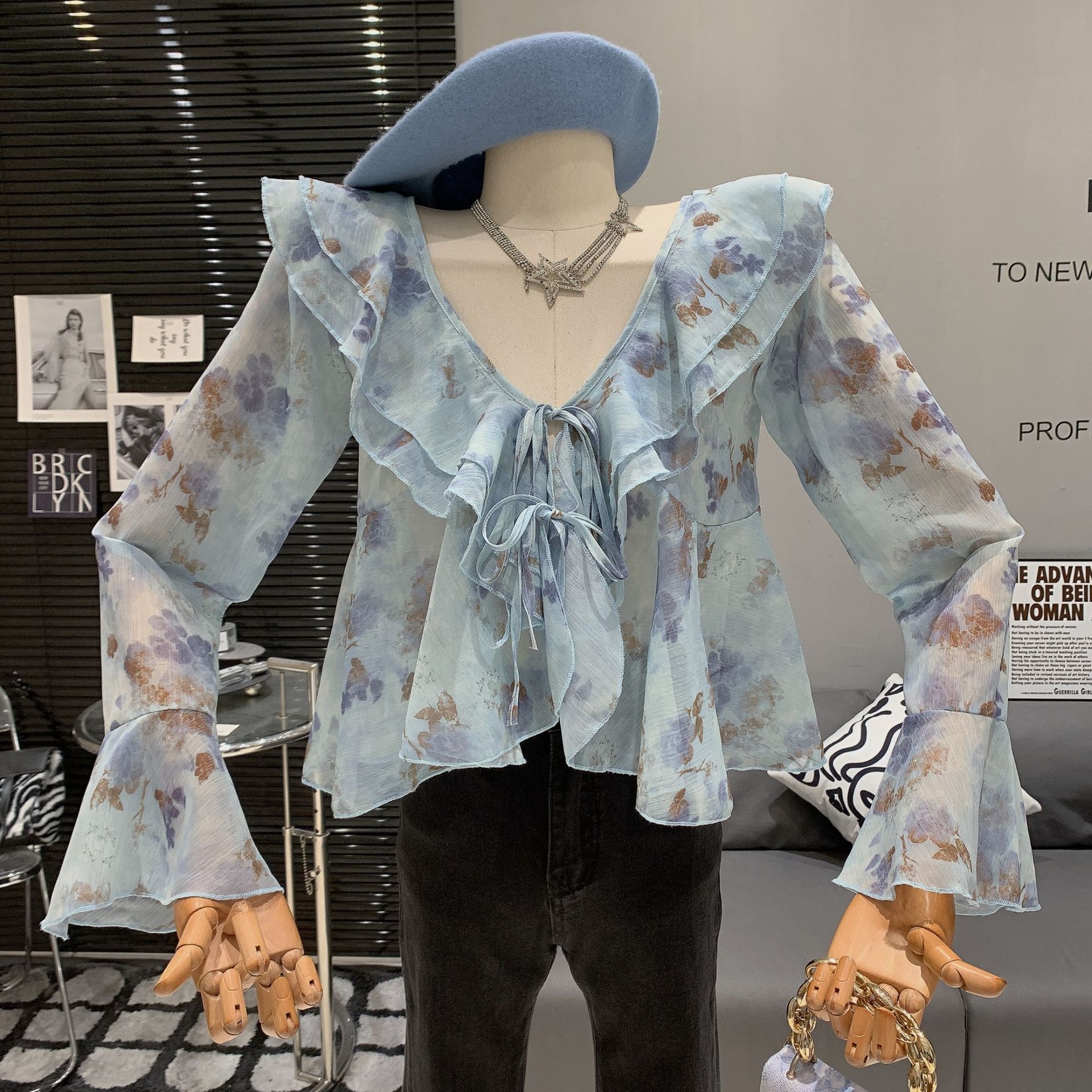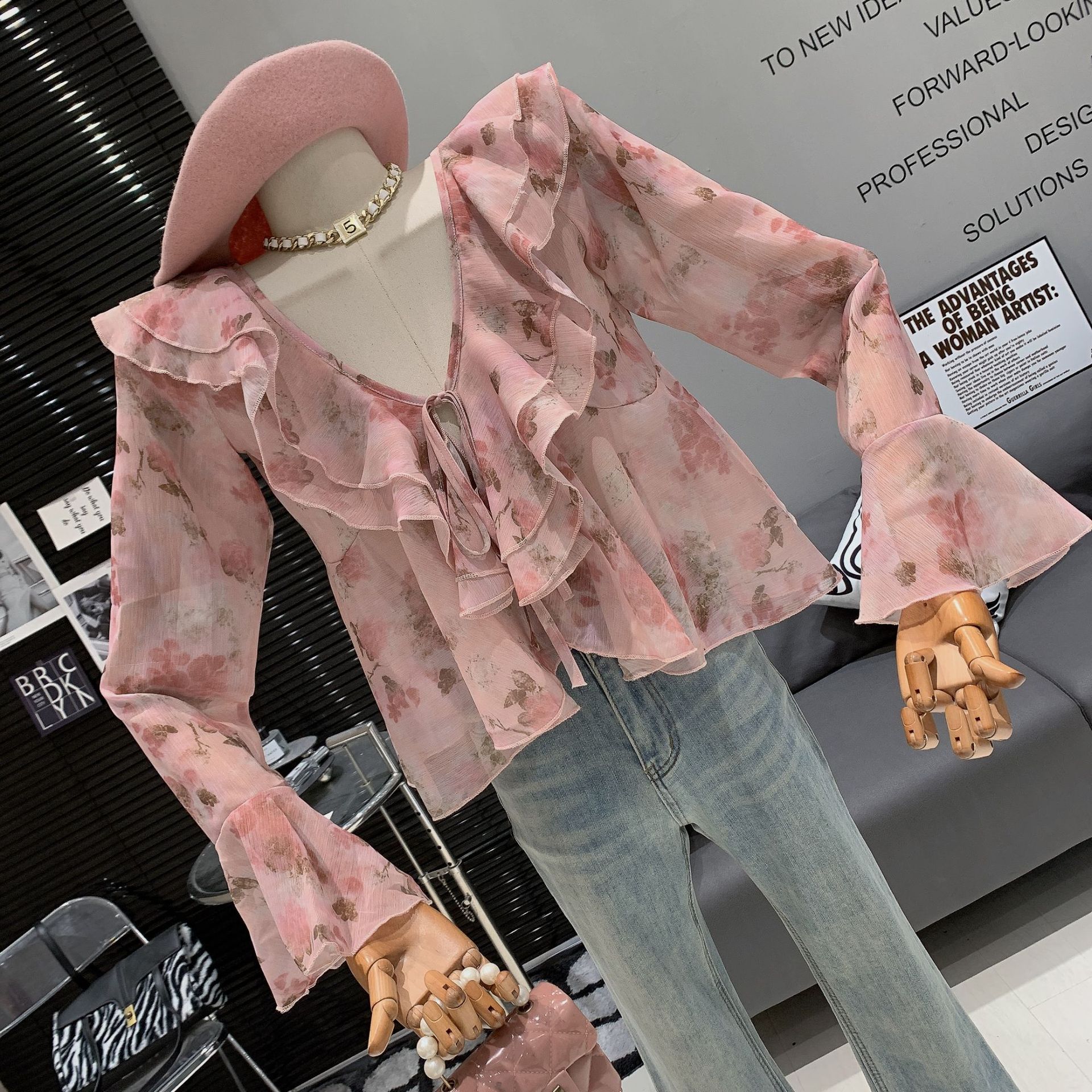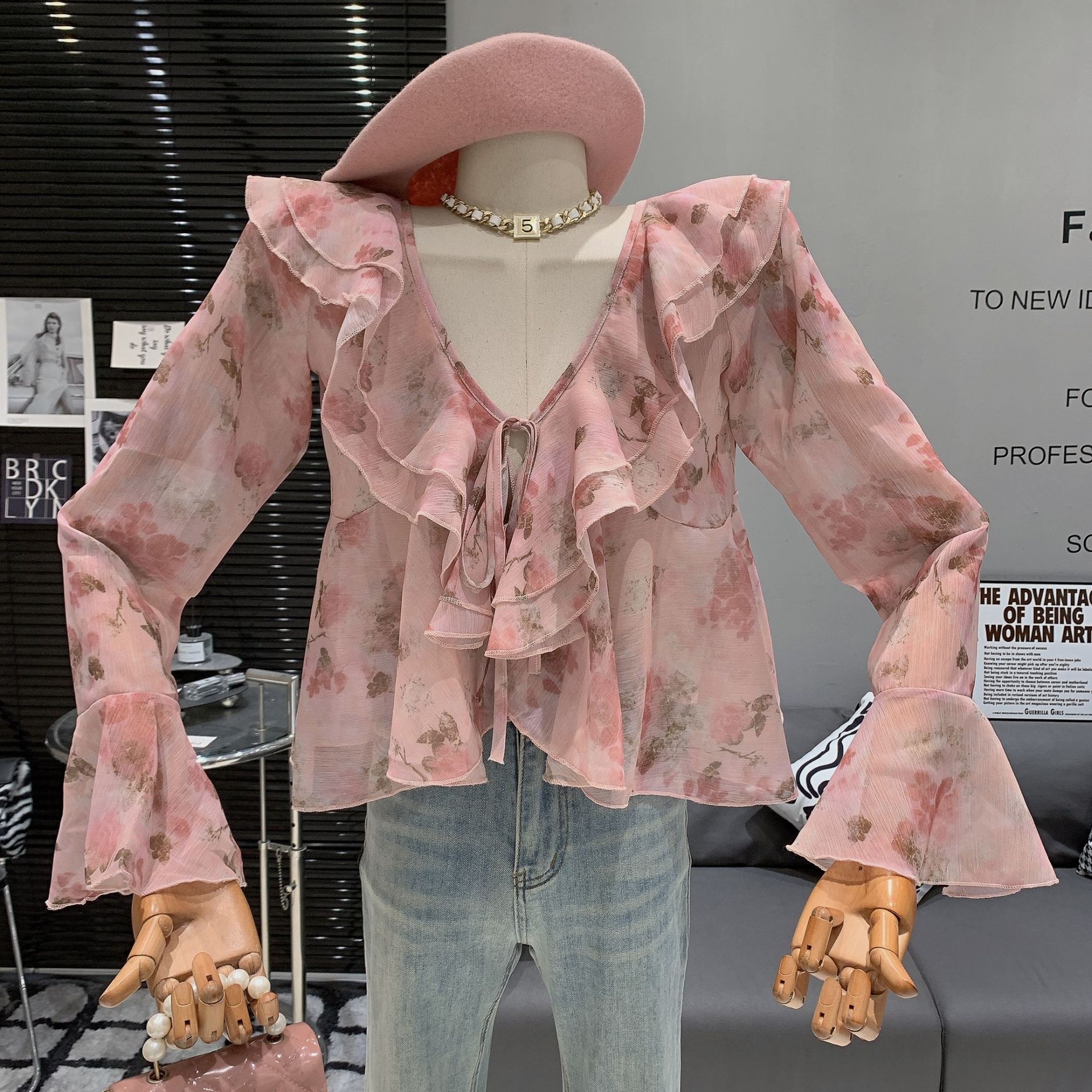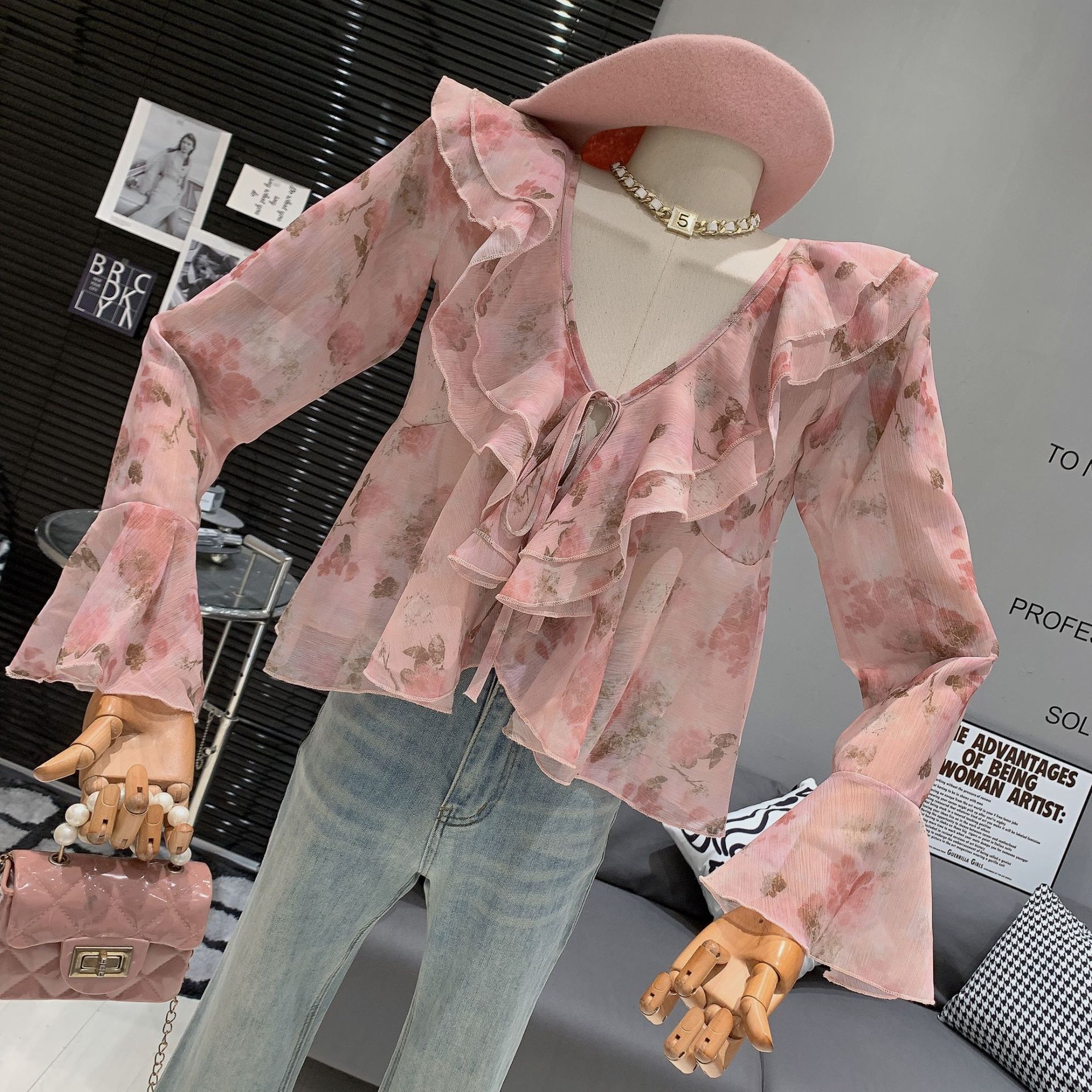 Blusa elegante y dulce de estilo francés, estilo suave, otoño 2024, nueva camisa de manga larga con cuello en V y volantes florales, combinable con todo.