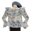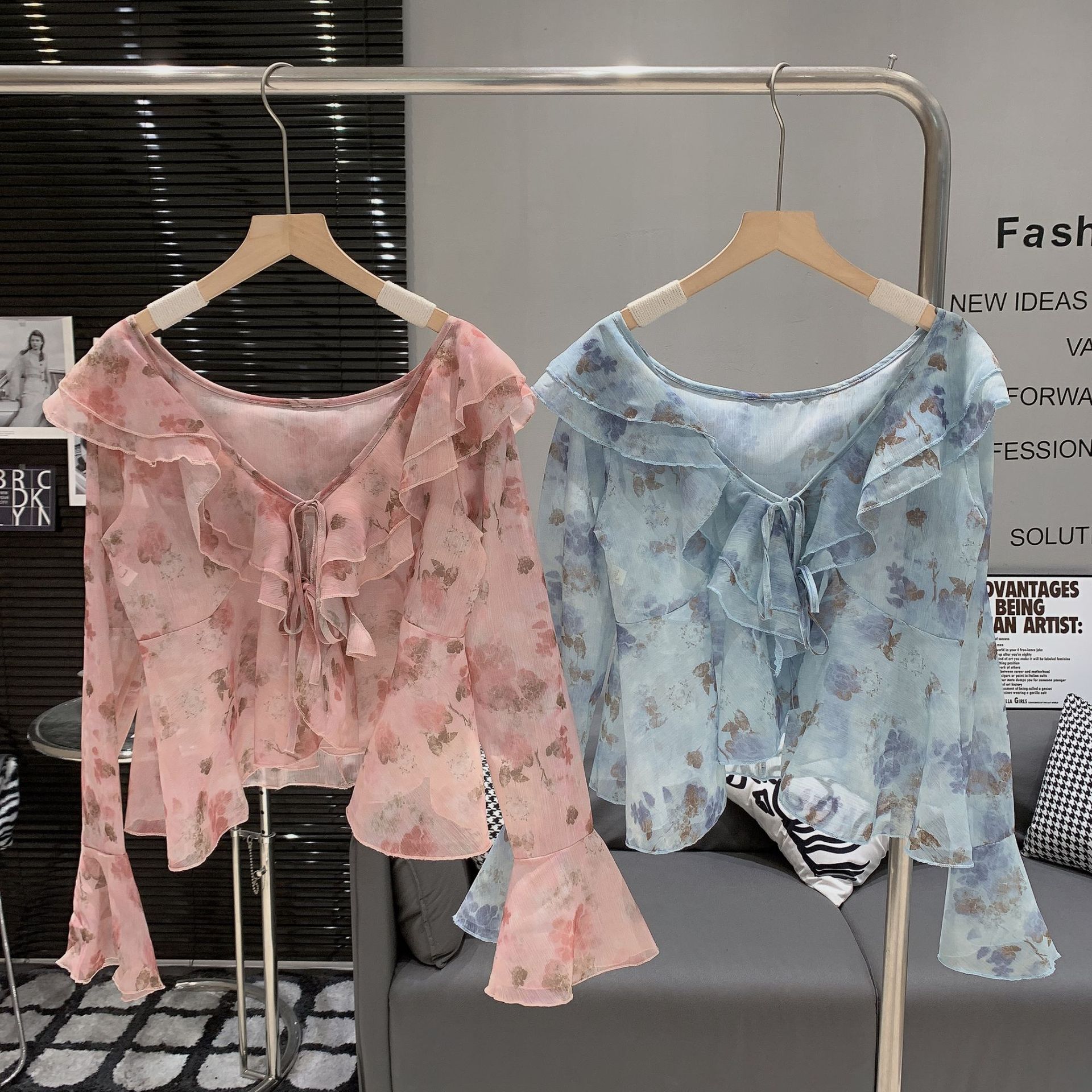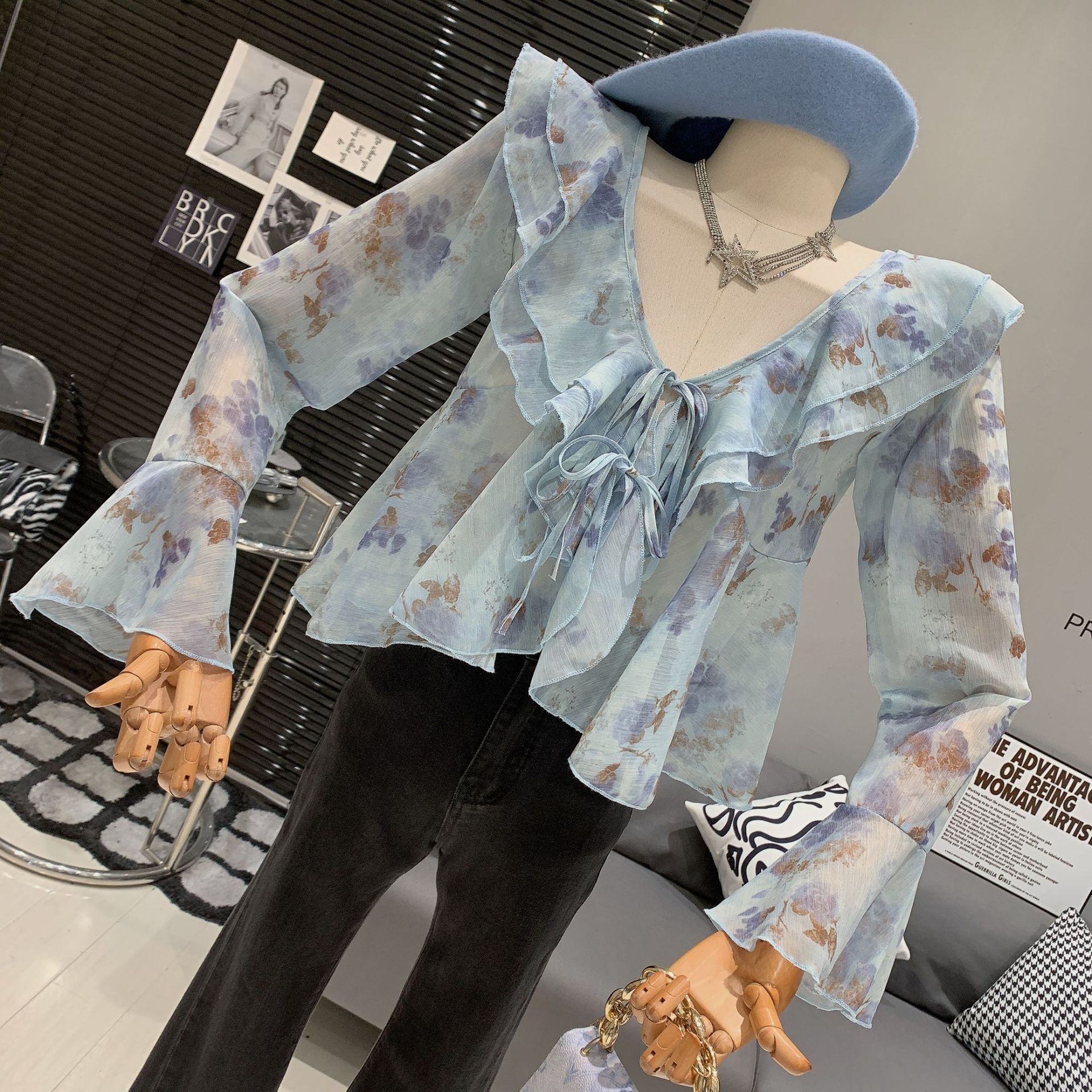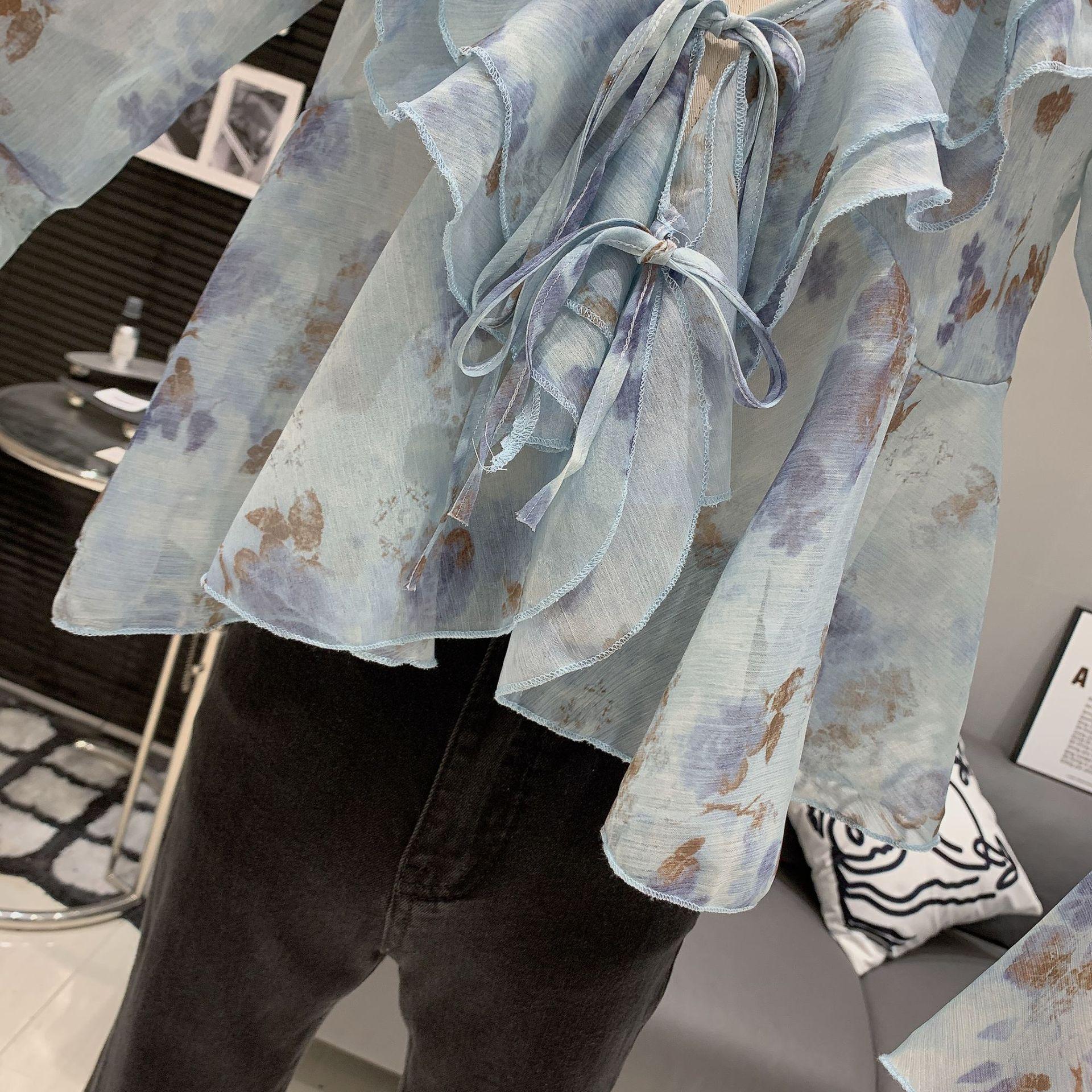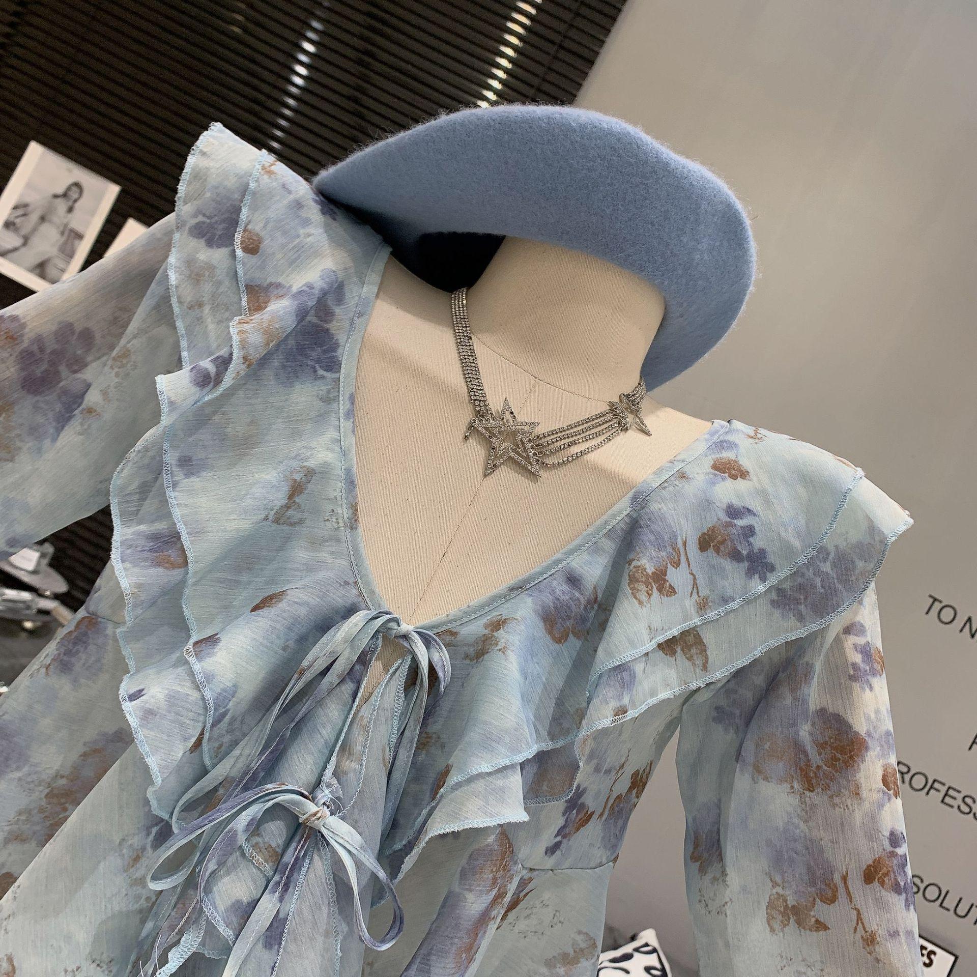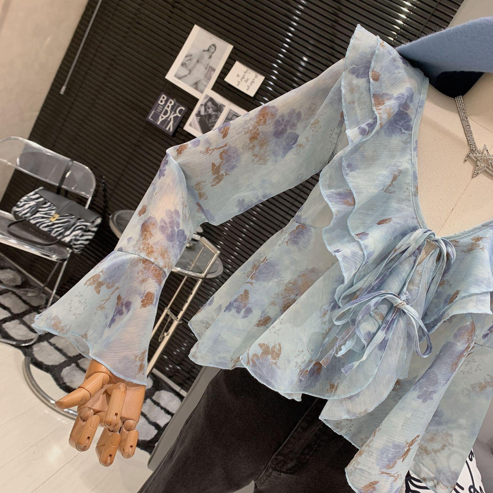 Blusa elegante y dulce de estilo francés, estilo suave, otoño 2024, nueva camisa de manga larga con cuello en V y volantes florales, combinable con todo.