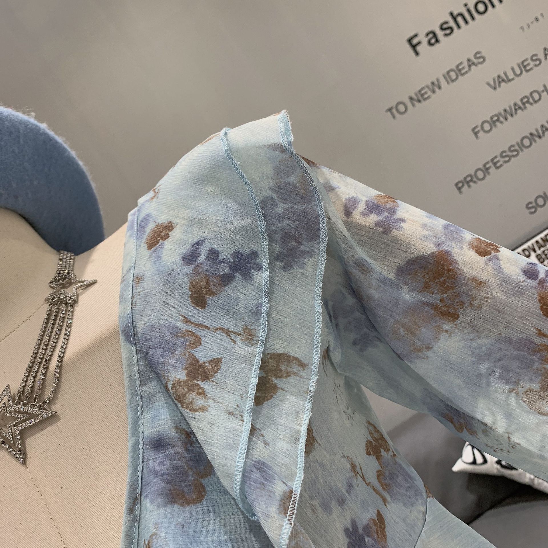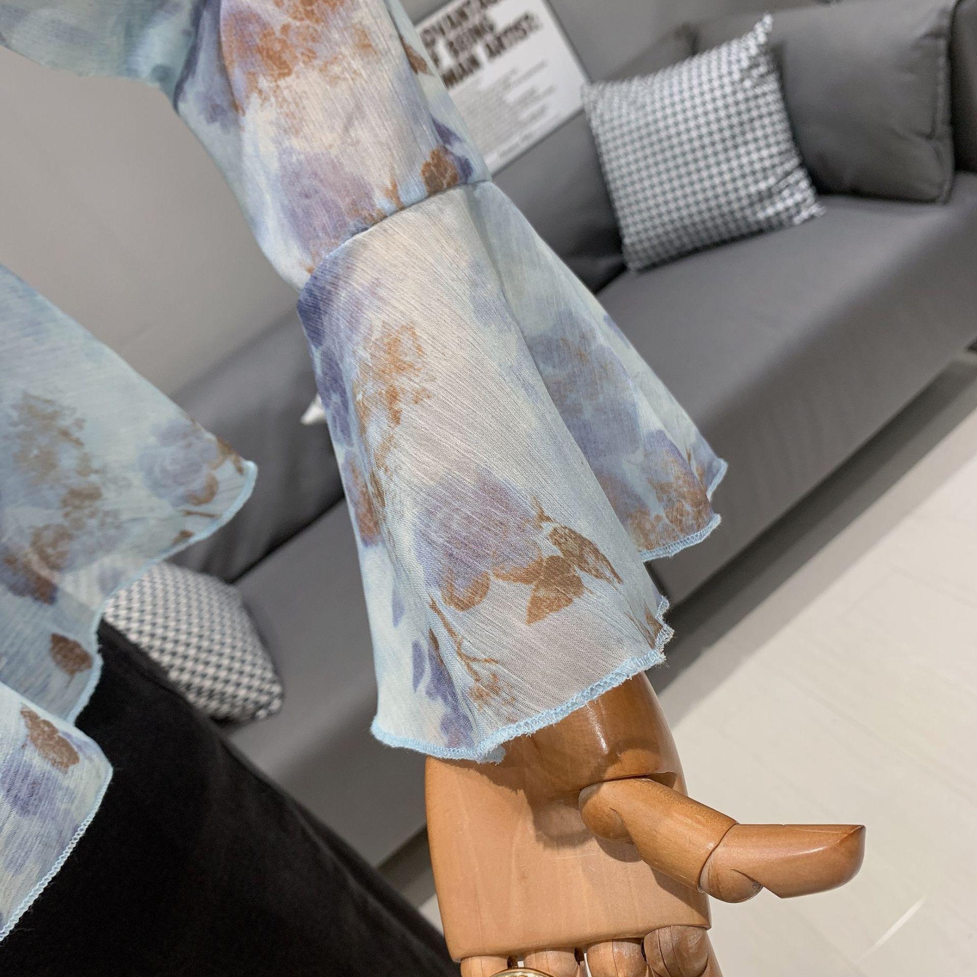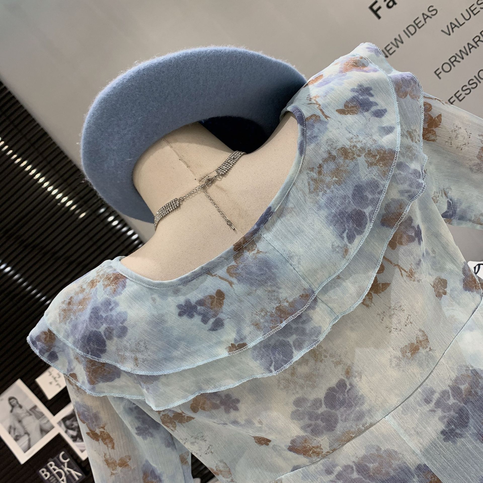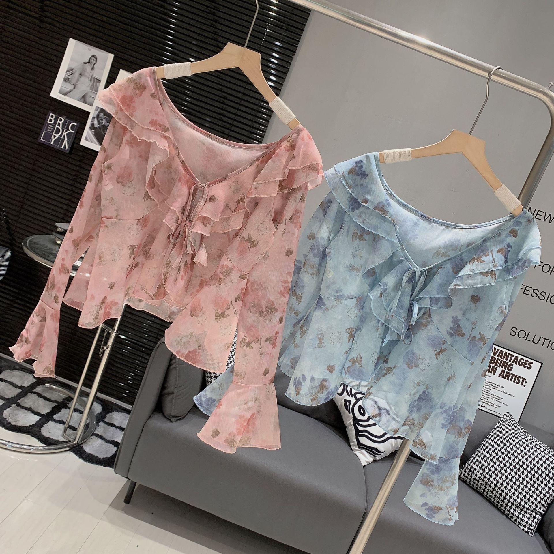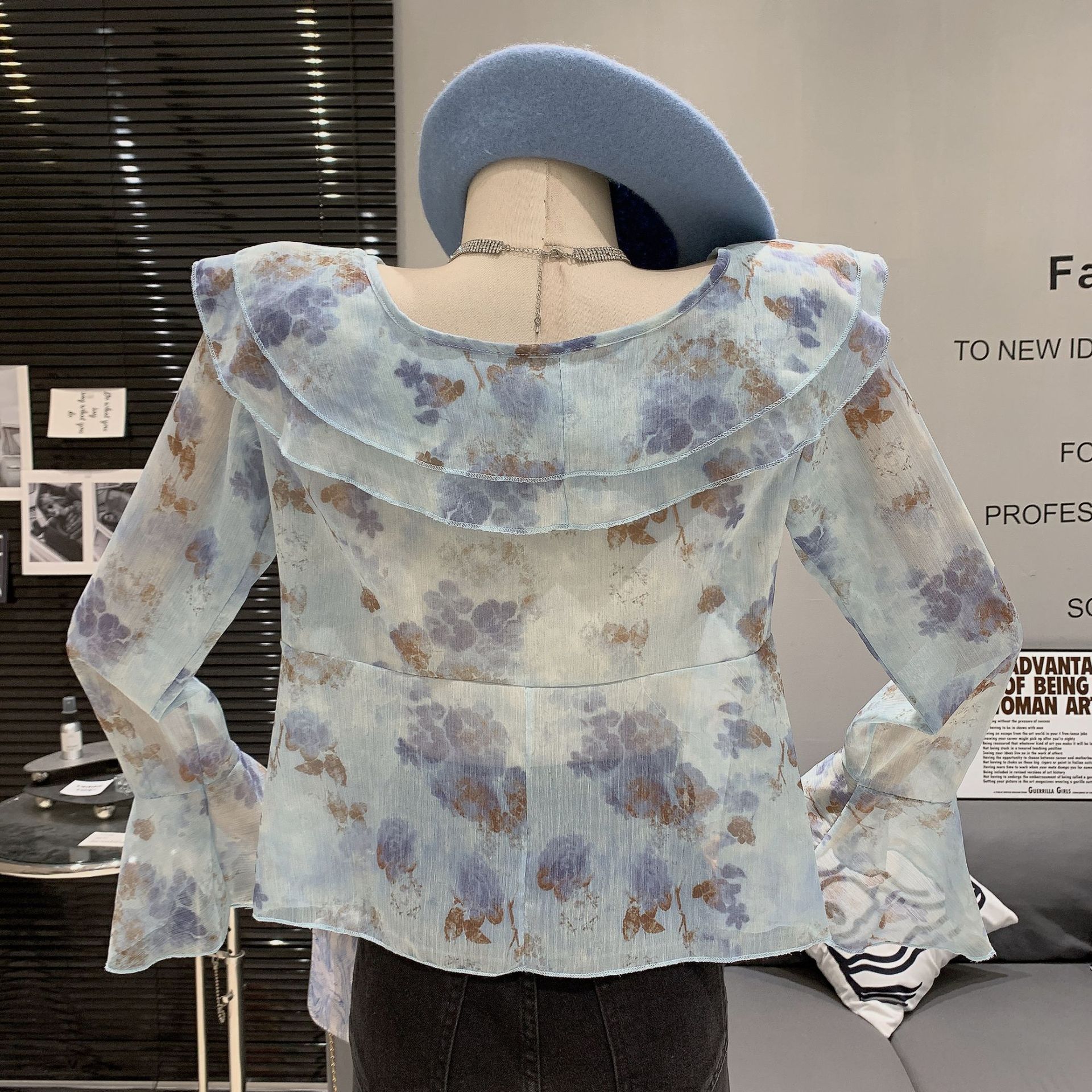 Blusa elegante y dulce de estilo francés, estilo suave, otoño 2024, nueva camisa de manga larga con cuello en V y volantes florales, combinable con todo.