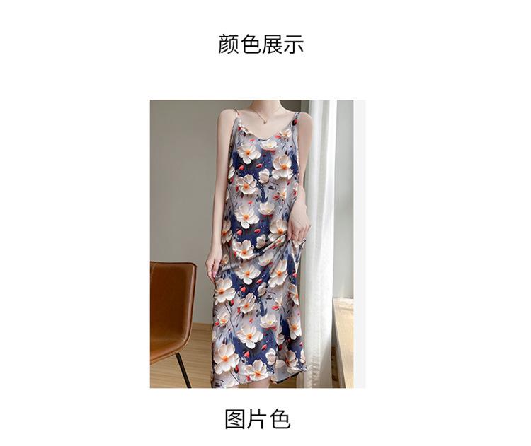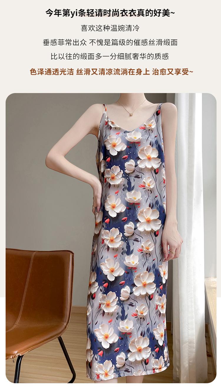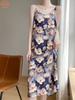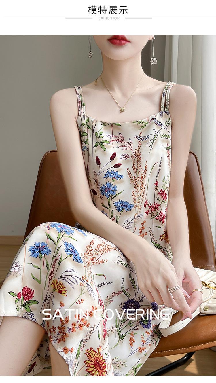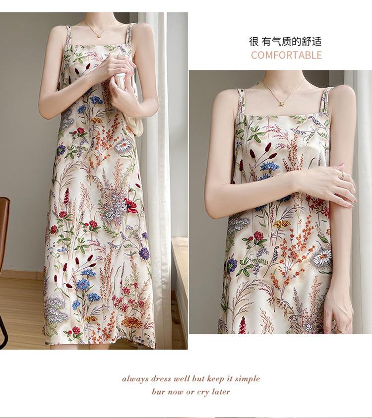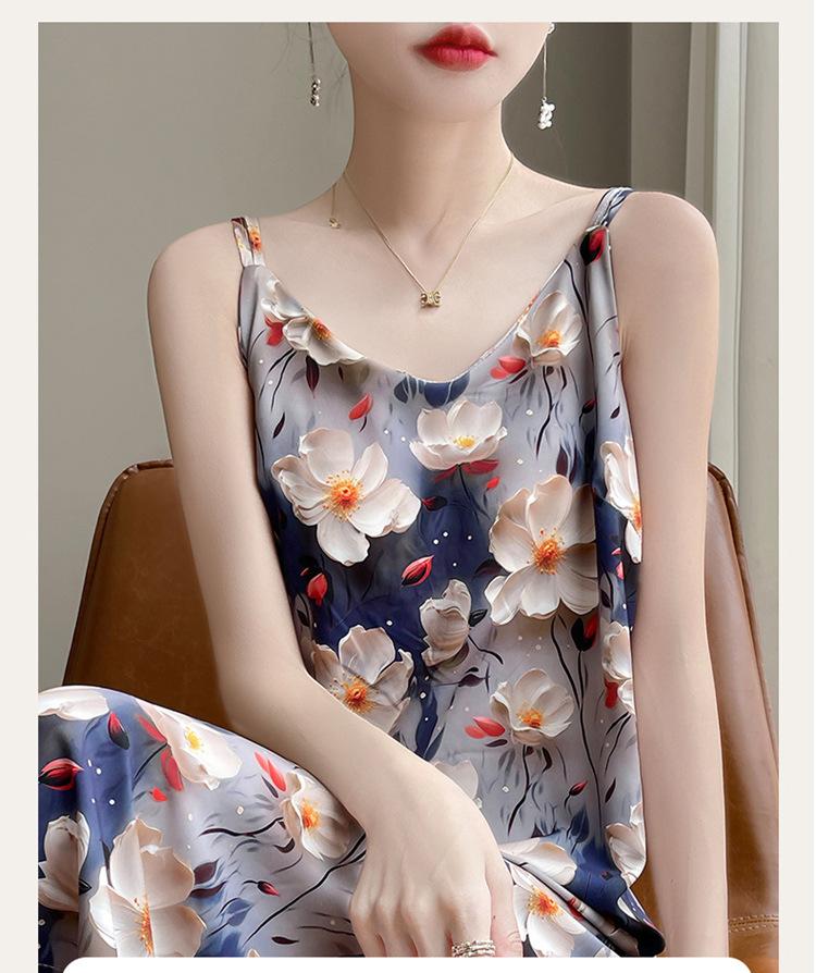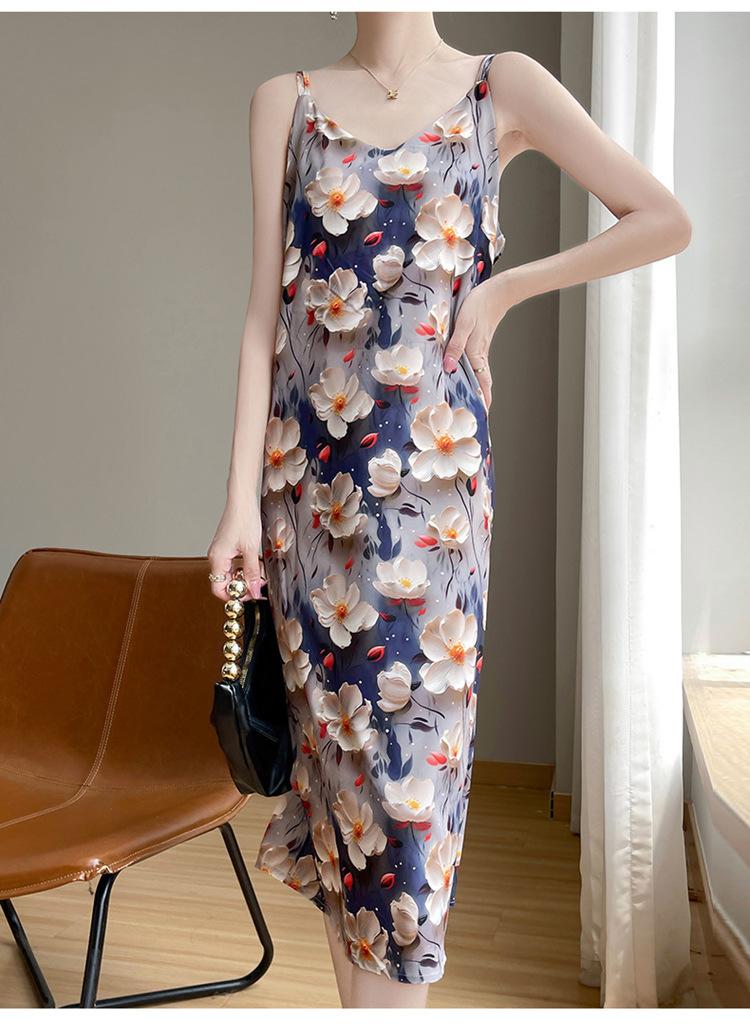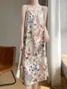 Vestido de tirantes de seda estilo francés para mujer 24 Verano Floral Cuello en V Vacaciones en la playa Línea A Midi Ácido Acético