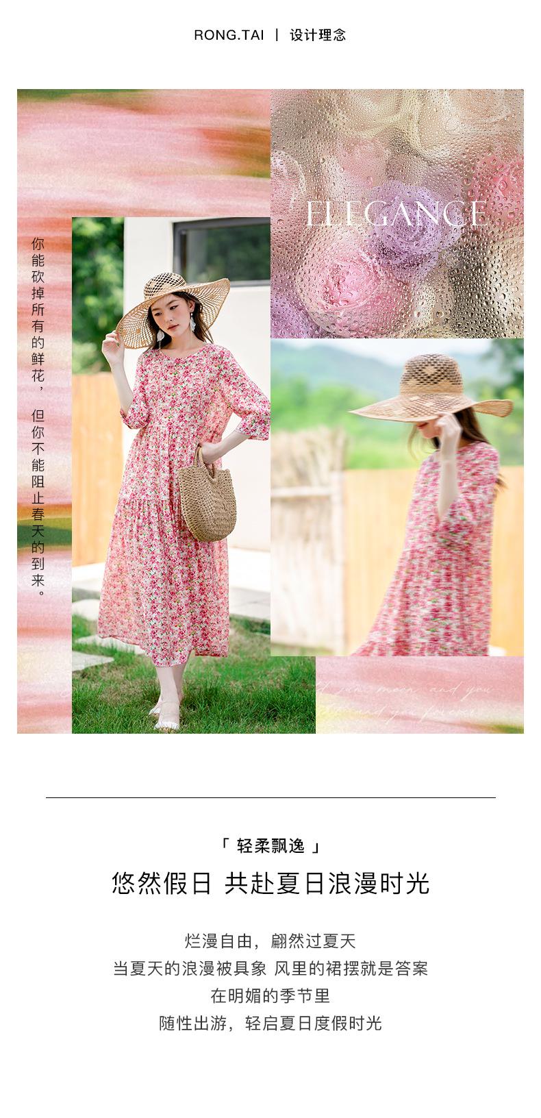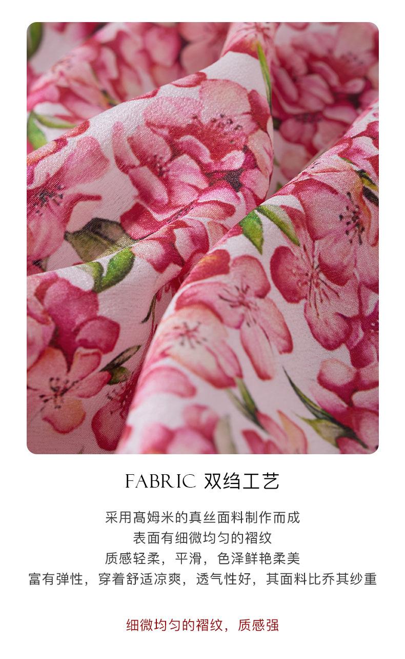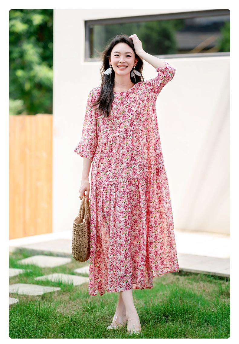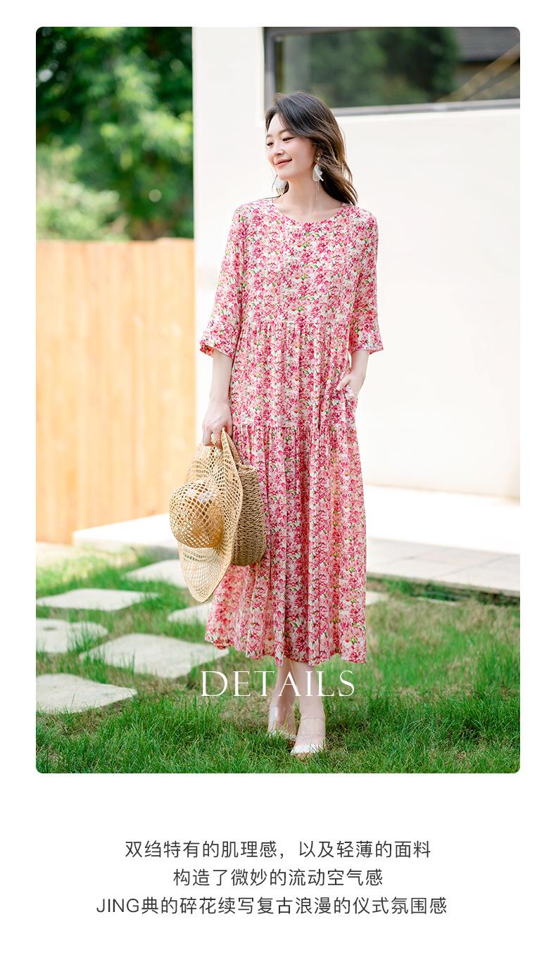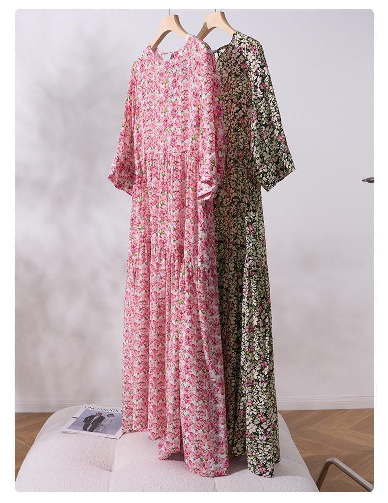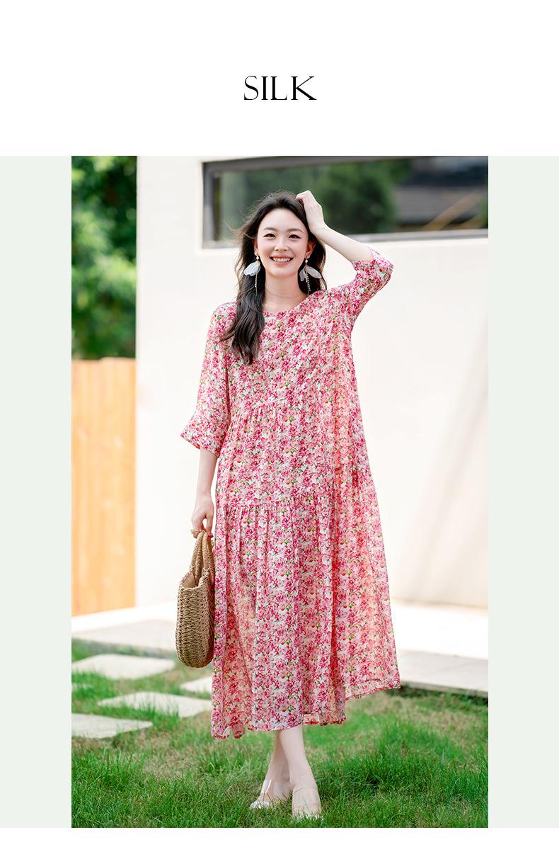 Rongtai Diseño Floral Espalda con Cordones Vestido de Seda de Morera de Seda de una Sola Capa para Mujer Falda Amplia Holgada Empalmada