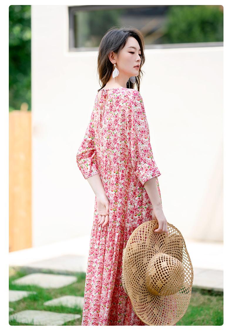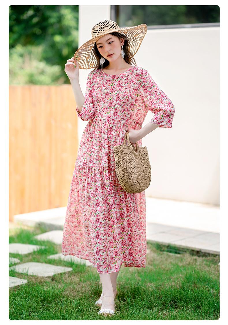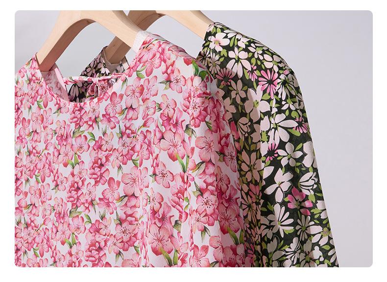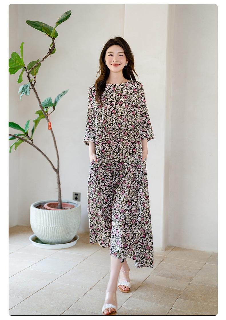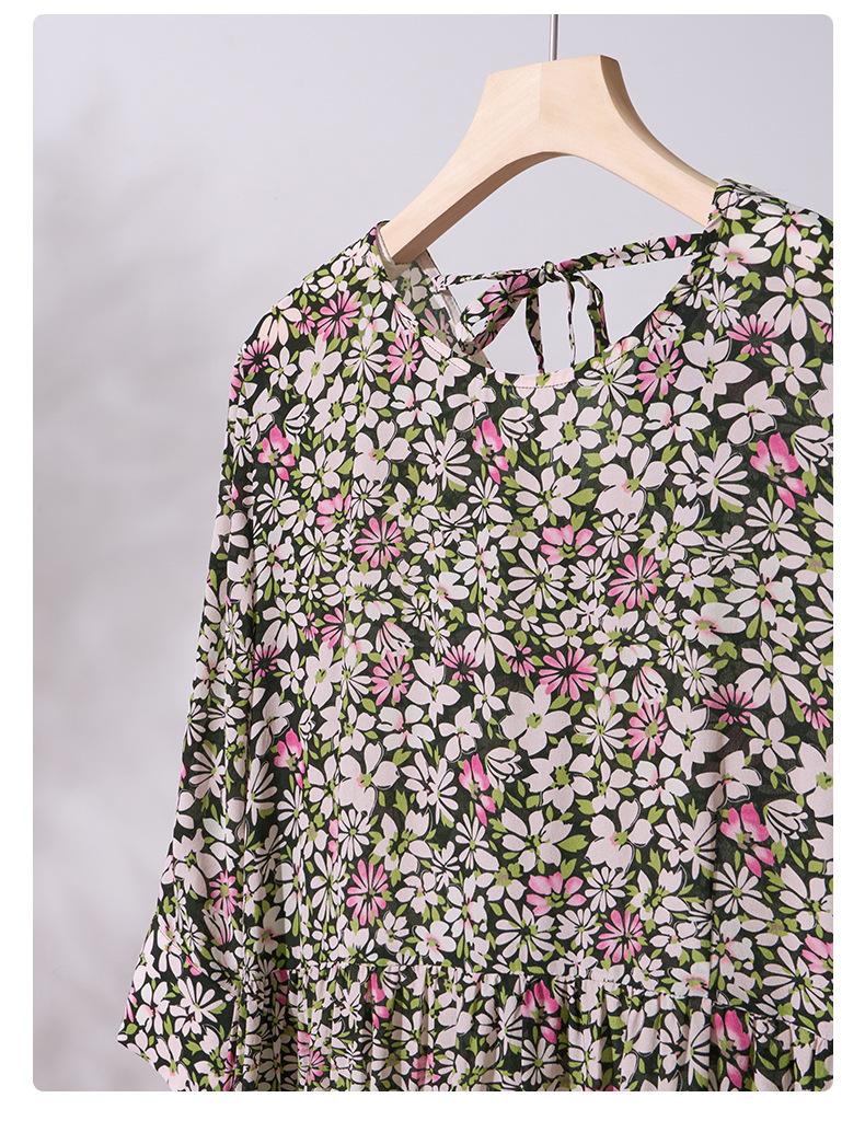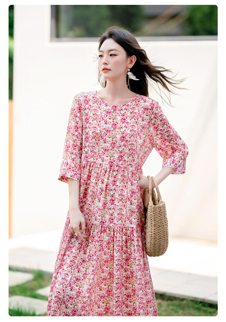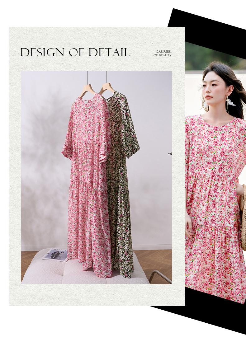 Rongtai Diseño Floral Espalda con Cordones Vestido de Seda de Morera de Seda de una Sola Capa para Mujer Falda Amplia Holgada Empalmada
