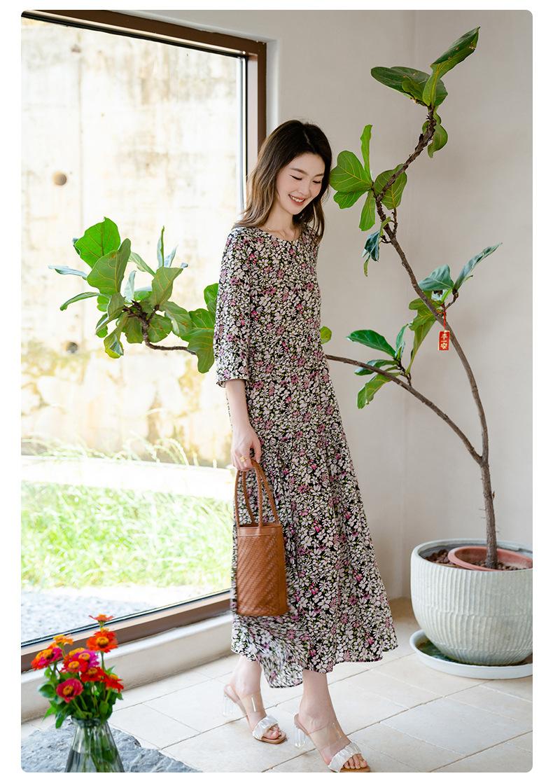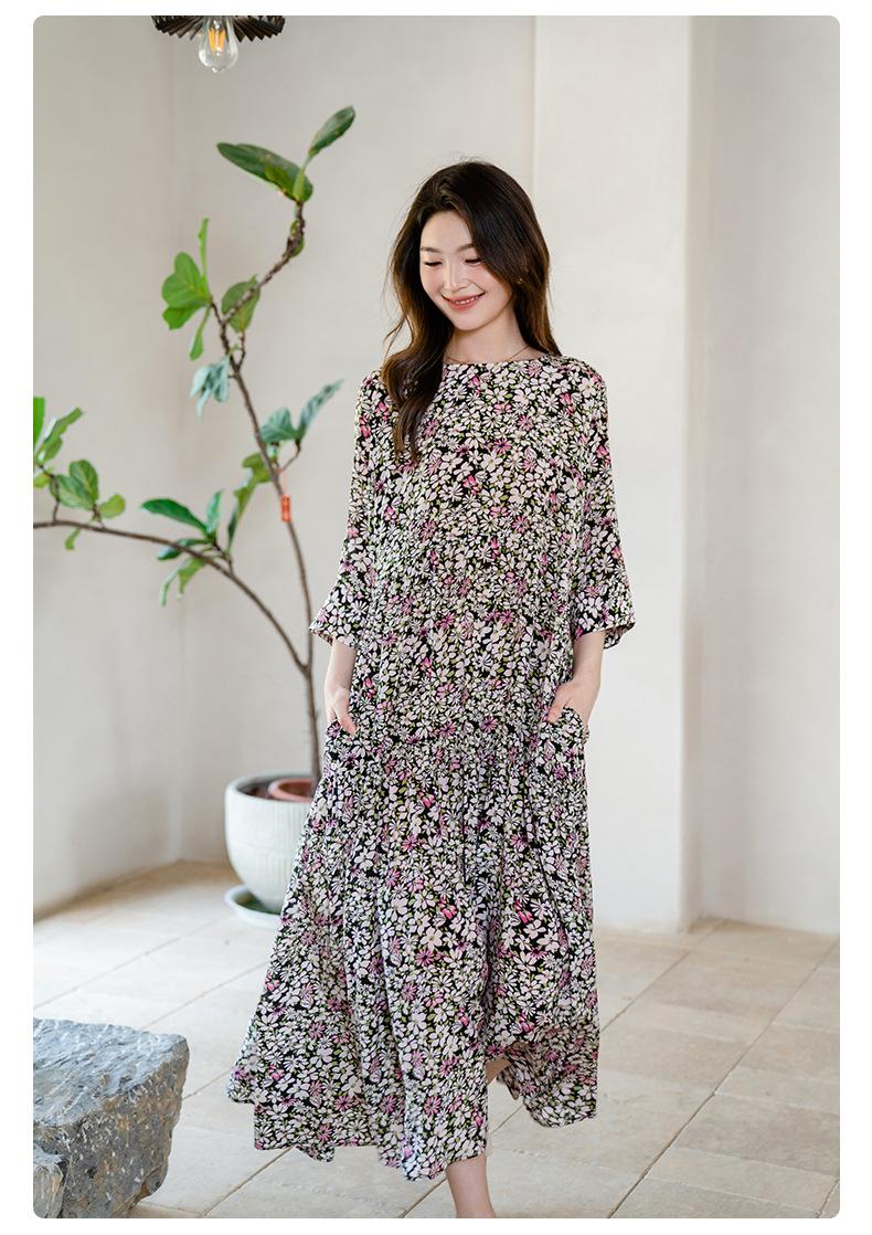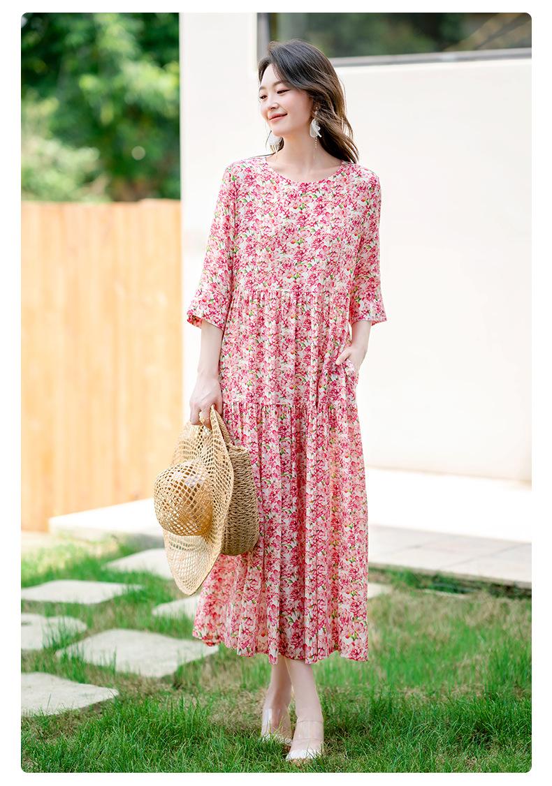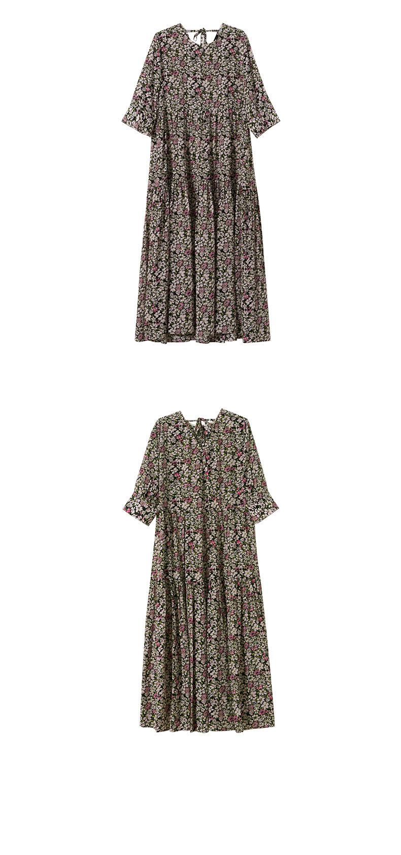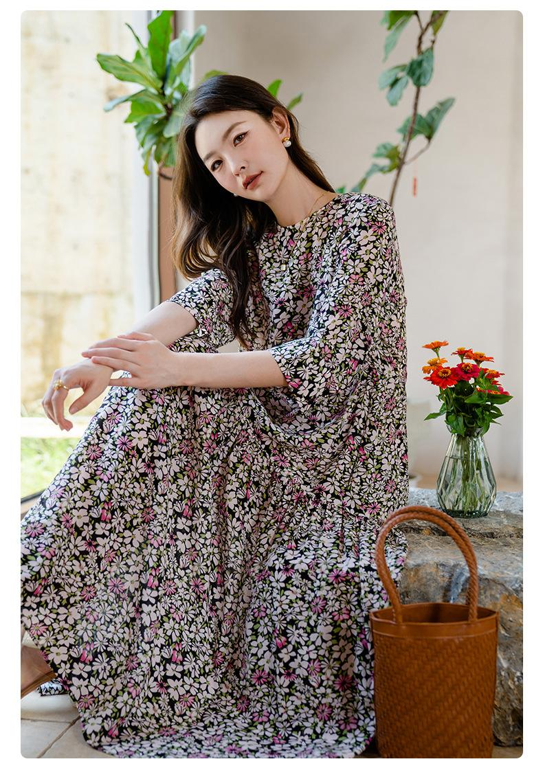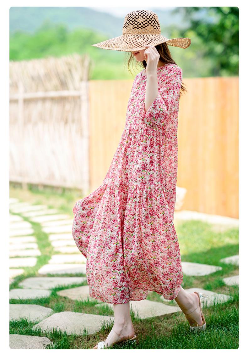 Rongtai Diseño Floral Espalda con Cordones Vestido de Seda de Morera de Seda de una Sola Capa para Mujer Falda Amplia Holgada Empalmada