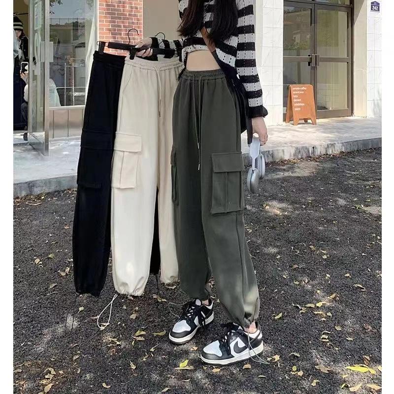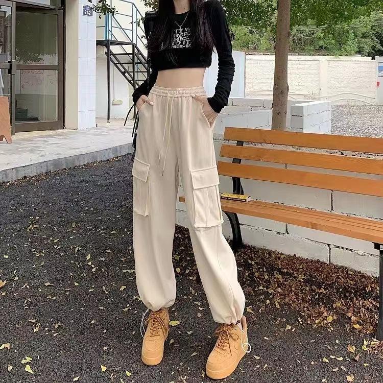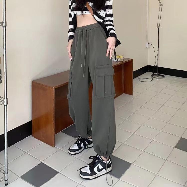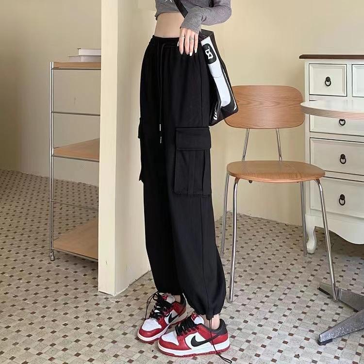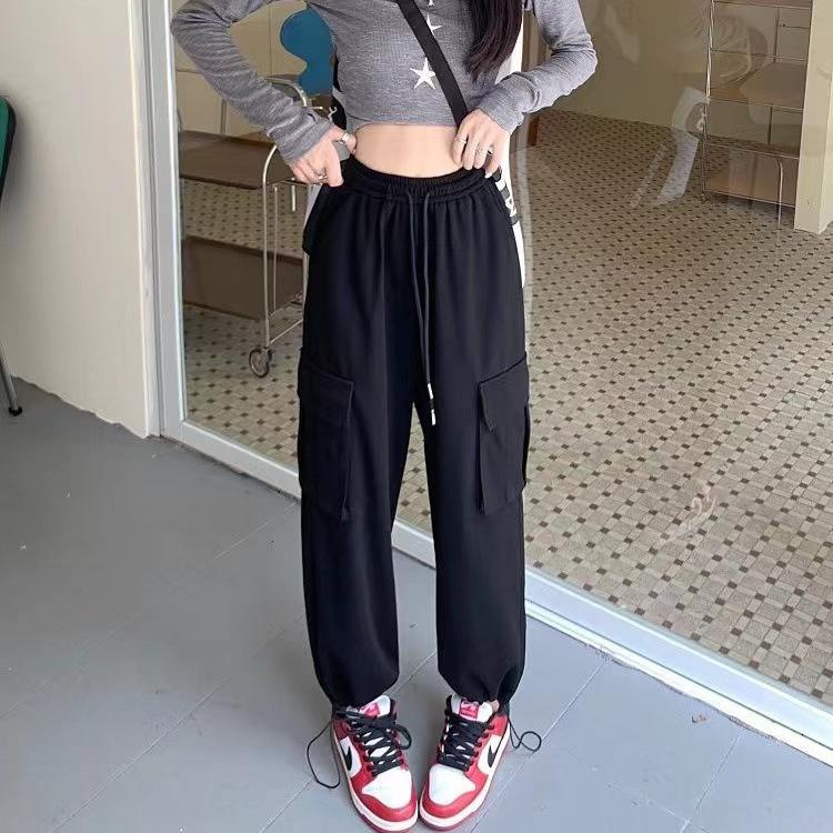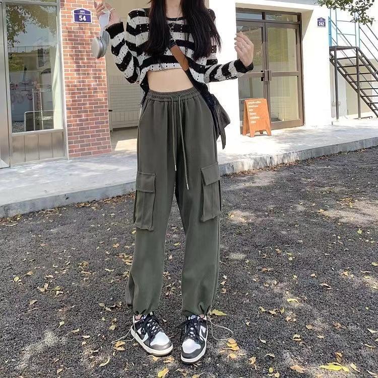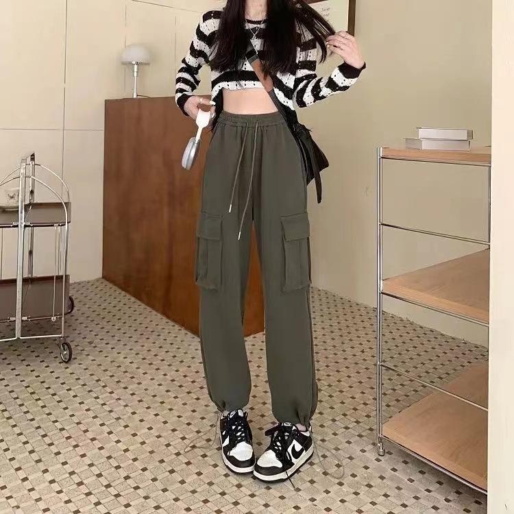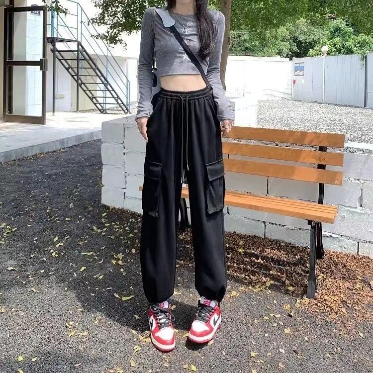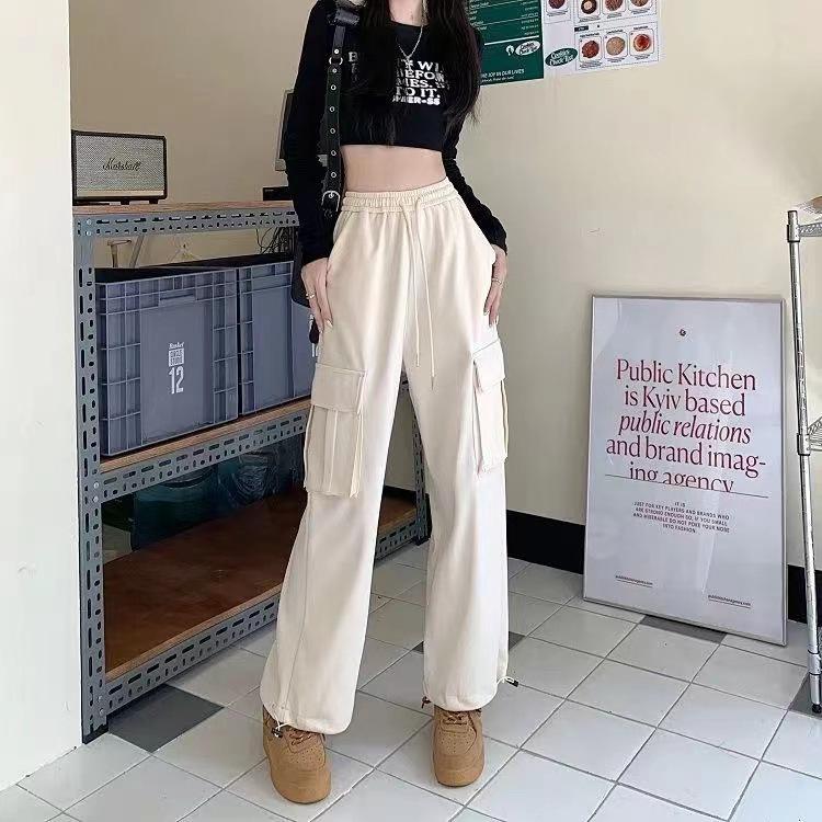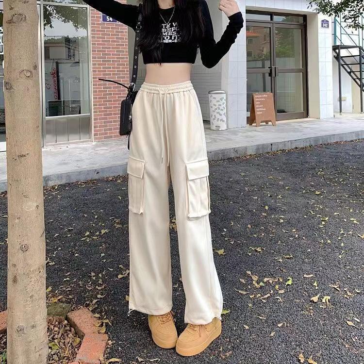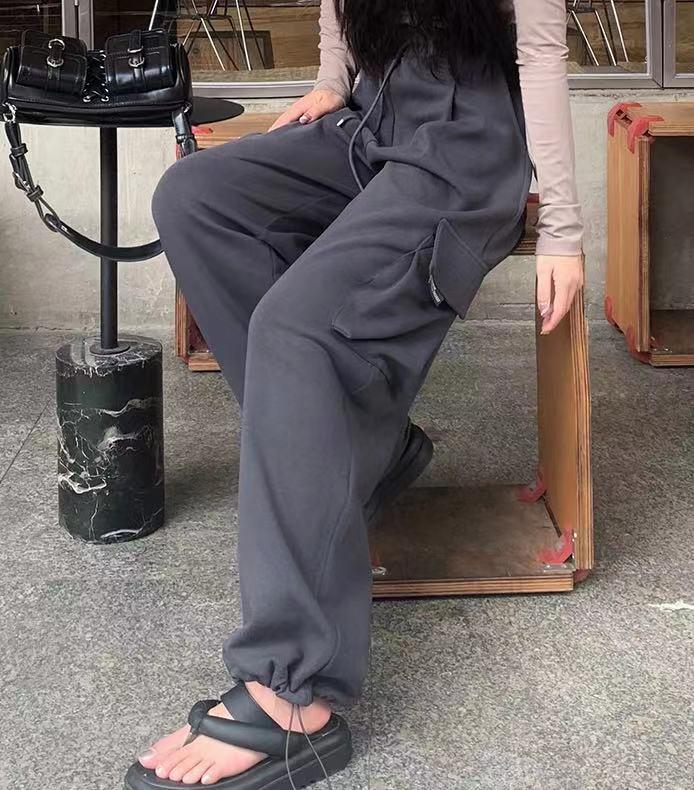 Primavera y Otoño Cintura Alta Holgados Aspecto Delgado Overol Americano Nuevo Estilo Sentido del Diseño Pantalones de Sudor Casuales Deportivos Combinan con Todo Pantalones de Pierna Ancha
