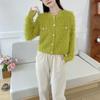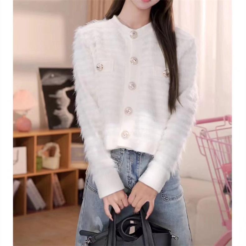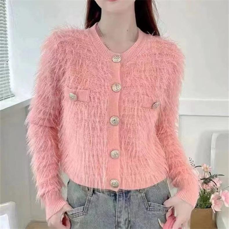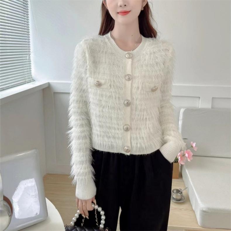 Cárdigan de punto con cuello de muñeca de encaje antiedad de estilo coreano dulce de otoño e invierno de 2024, abrigo de suéter de lana de mapache para mujer