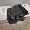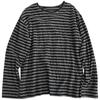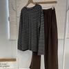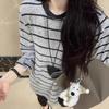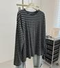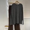 Camiseta de manga larga con cuello redondo y rayas negras y grises de estilo coreano para mujer, estilo holgado e informal, para otoño