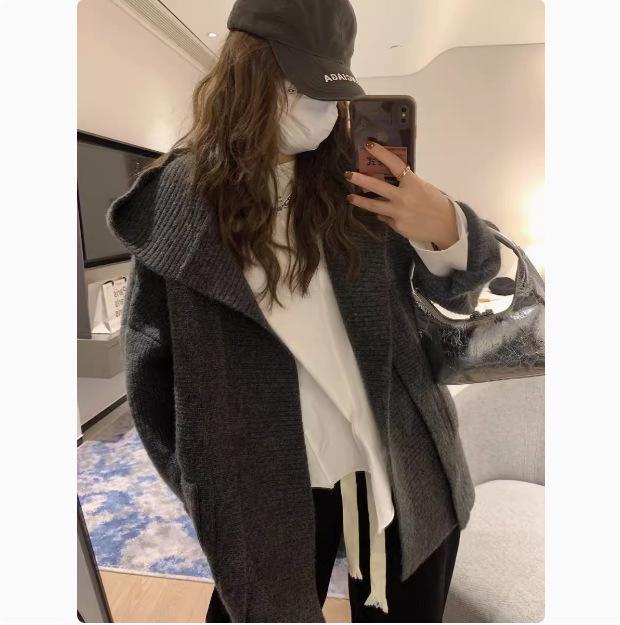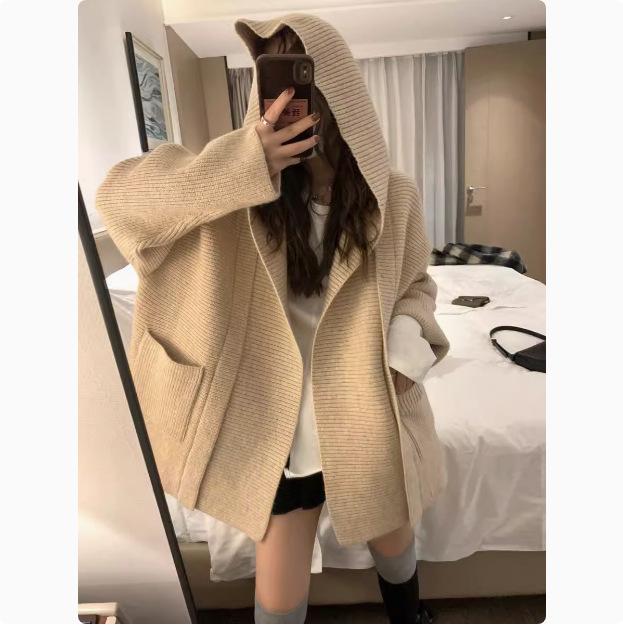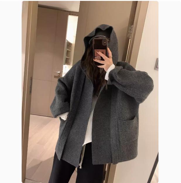 Cárdigan de punto grueso con capucha y bolsillo de talla grande al por mayor Otoño e Invierno Nuevo diseño de estilo coreano Suéter Abrigo de mujer
