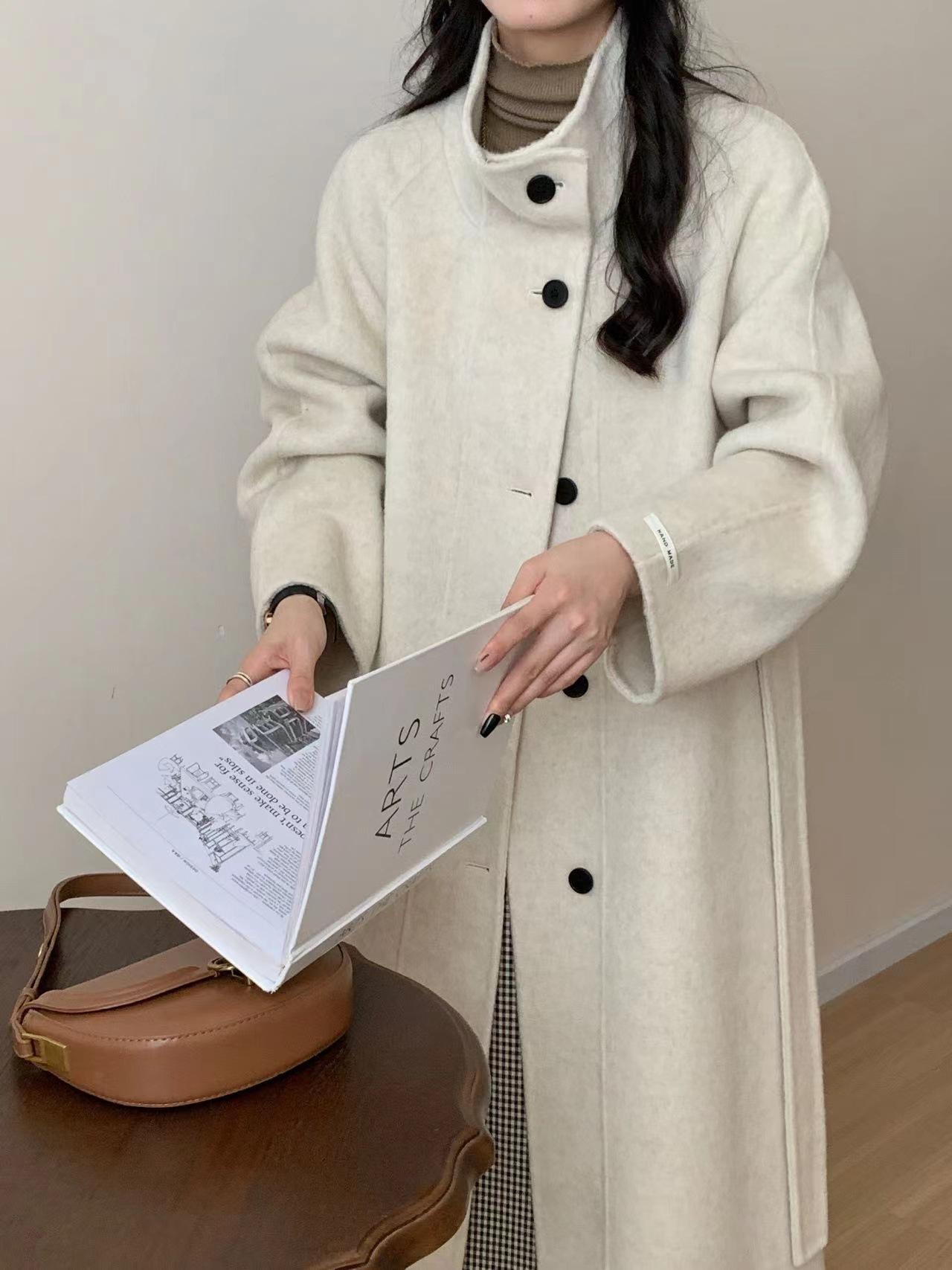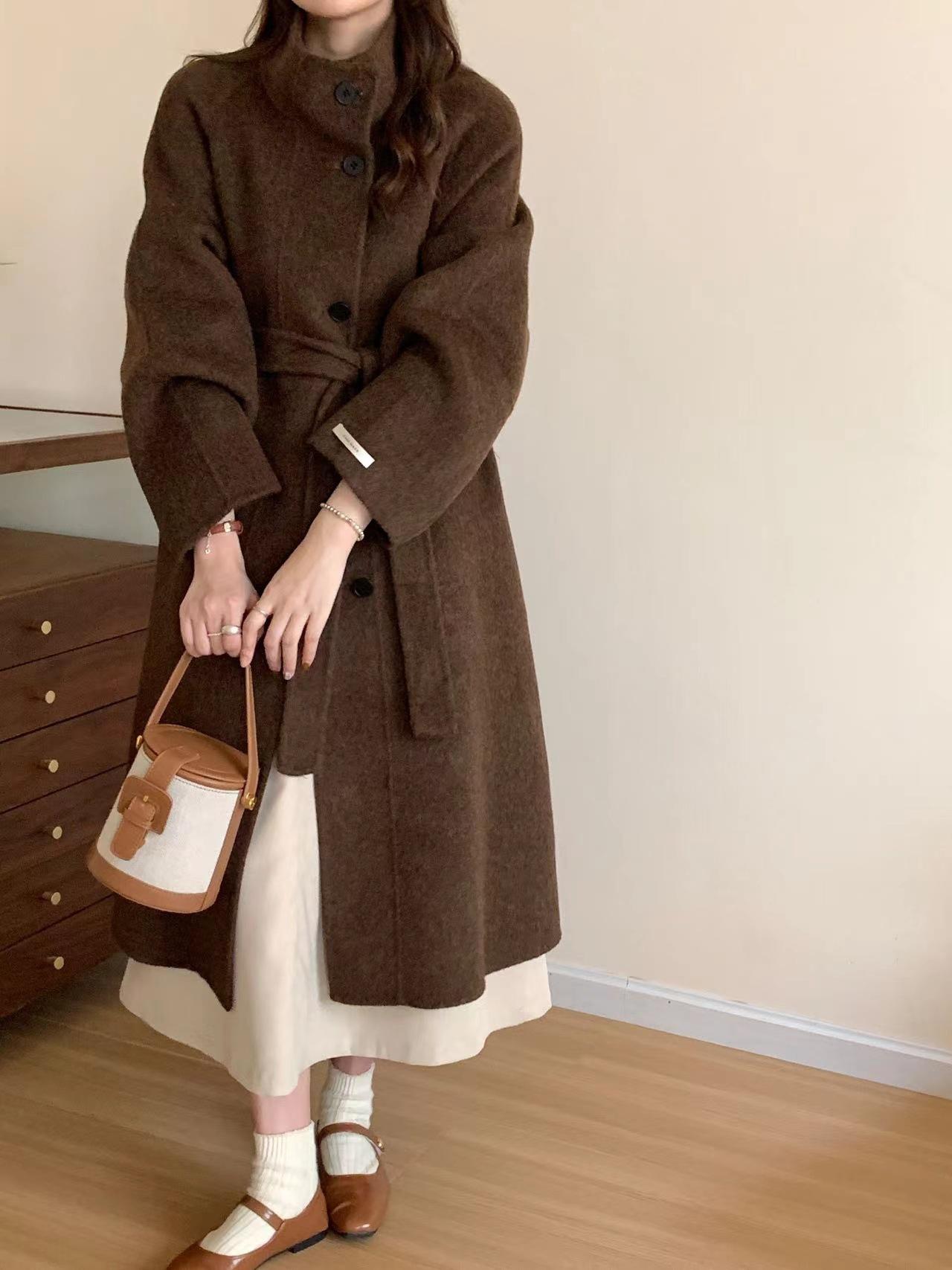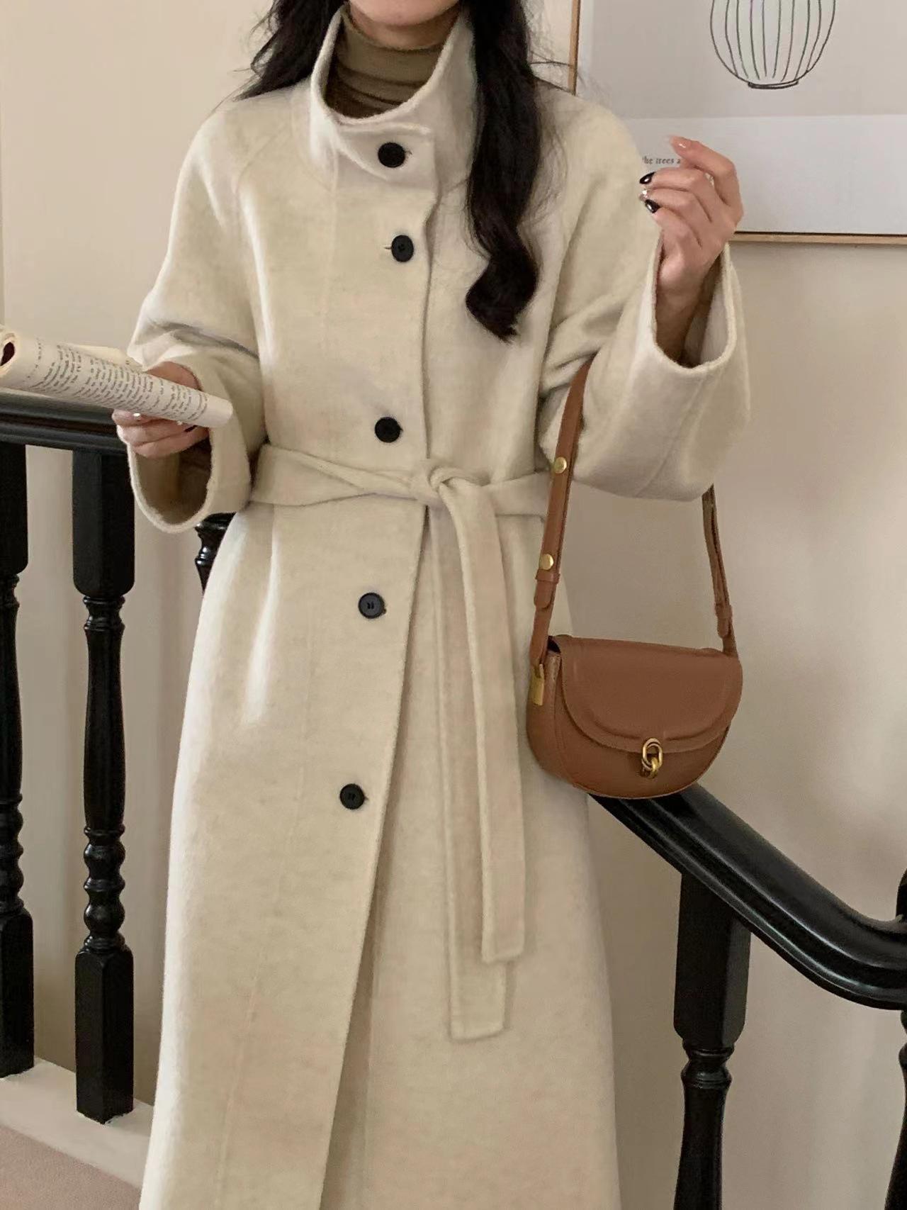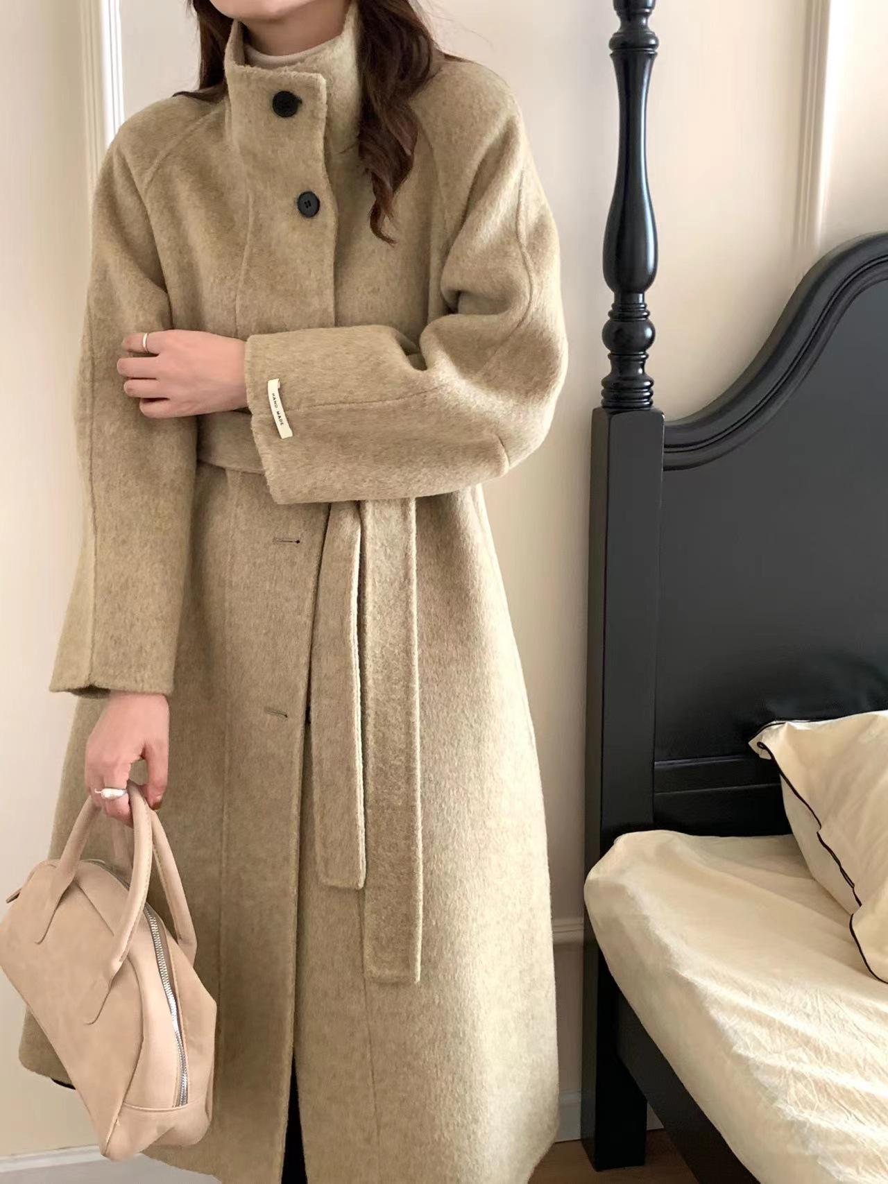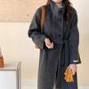 Han You Abrigo de Lana de Doble Vista con Cuello Mao, Abotonadura Sencilla y Cordones, Holgado, Coreano, de Lana, Otoño e Invierno, Nuevo Estilo
