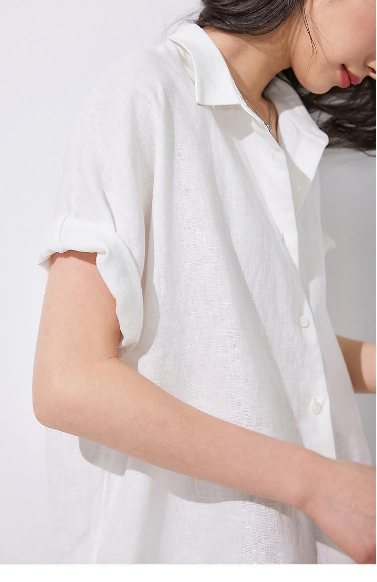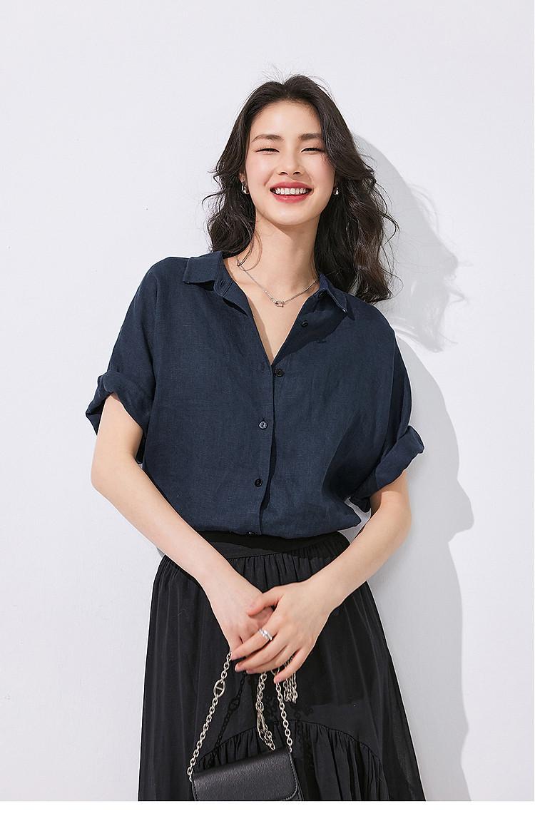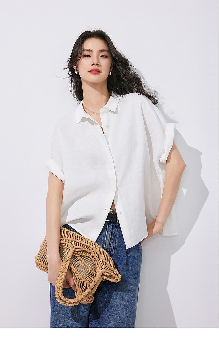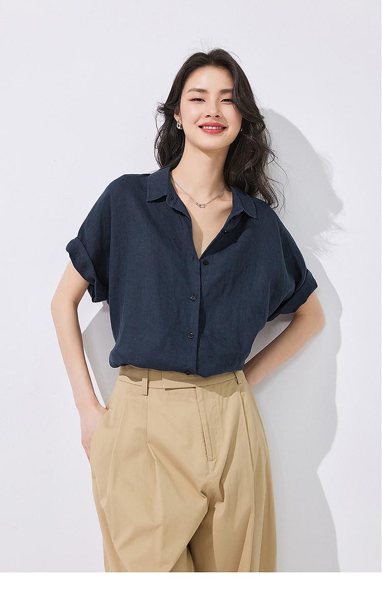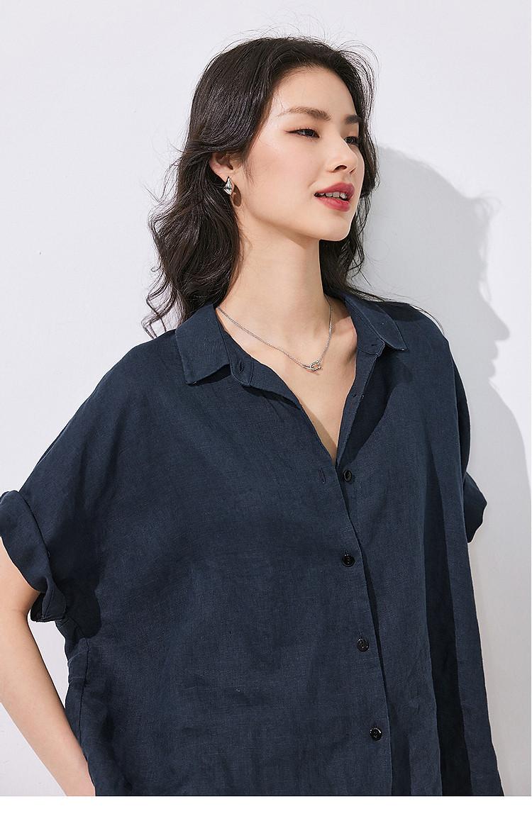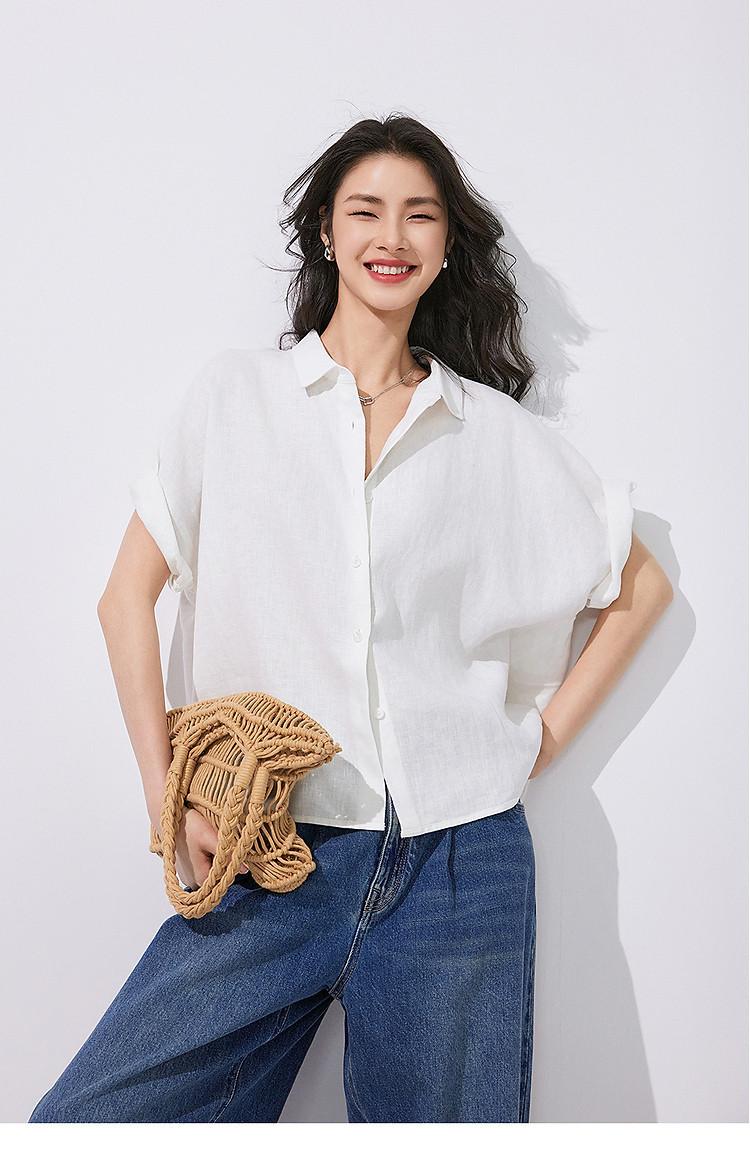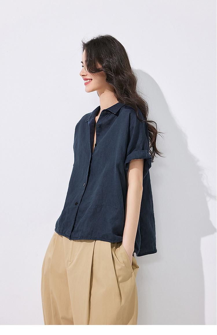 Camisa de manga corta para mujer, estilo caja, holgada, de primavera y verano, con solapa, de lino, transpirable y drapeada.