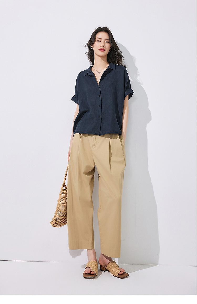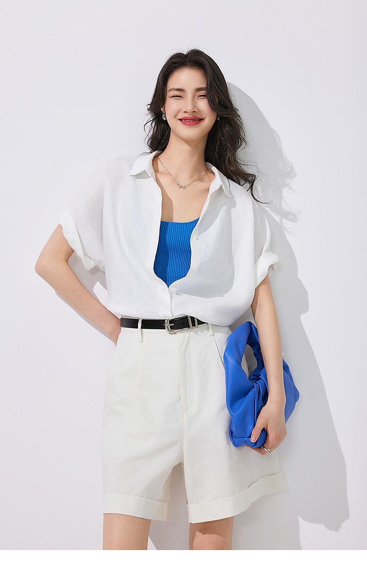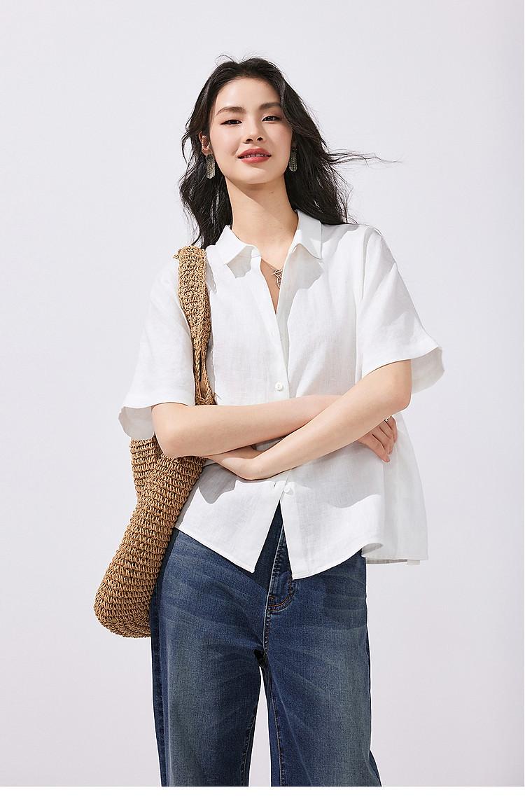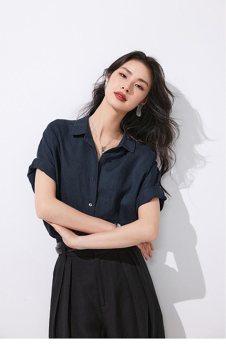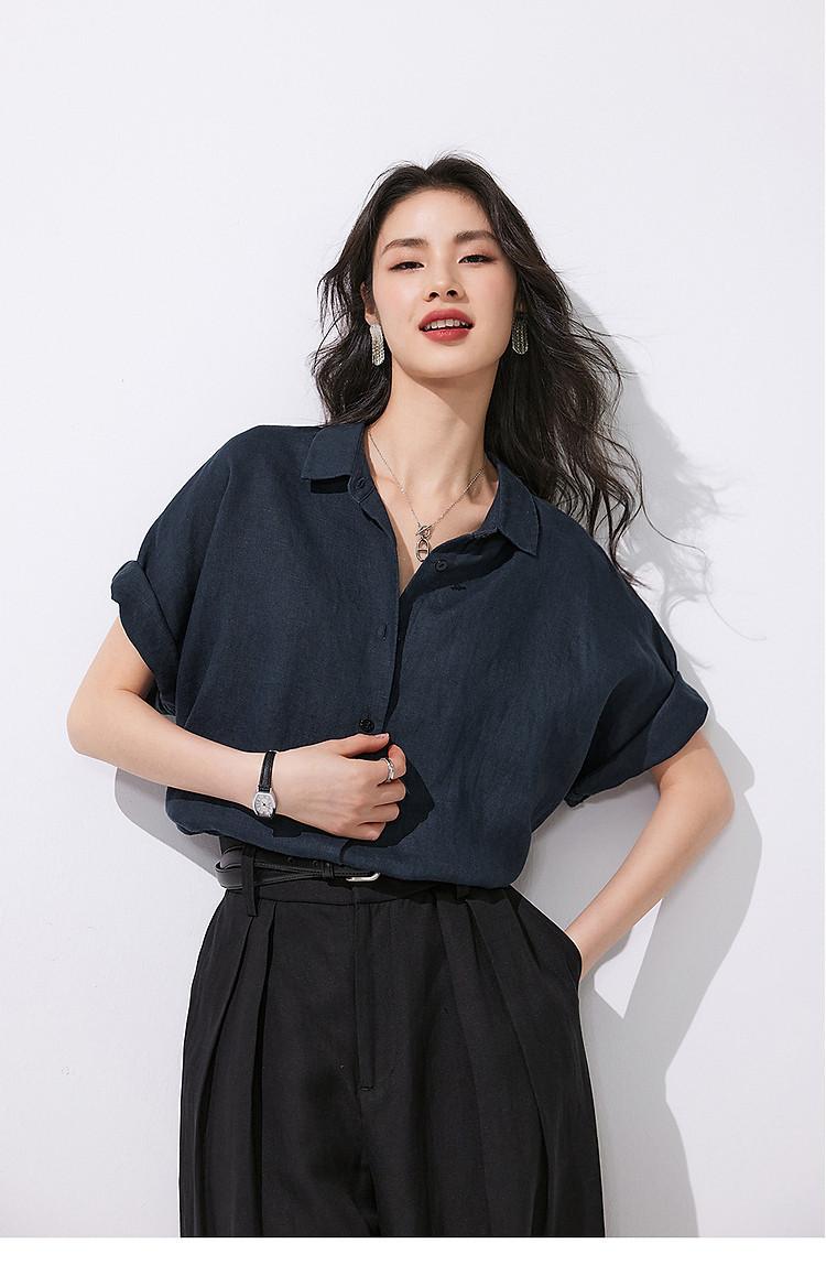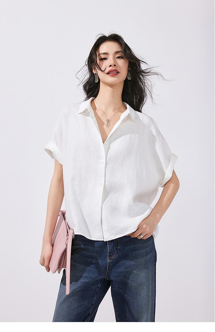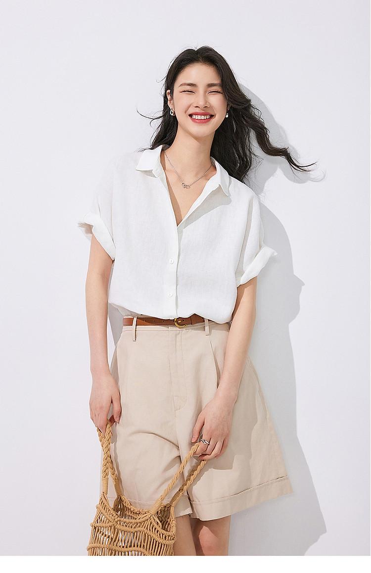 Camisa de manga corta para mujer, estilo caja, holgada, de primavera y verano, con solapa, de lino, transpirable y drapeada.
