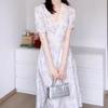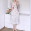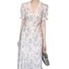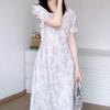 Vestido elegante francés con mangas abullonadas moradas, estilo suave y estampado, para el verano de 2024.