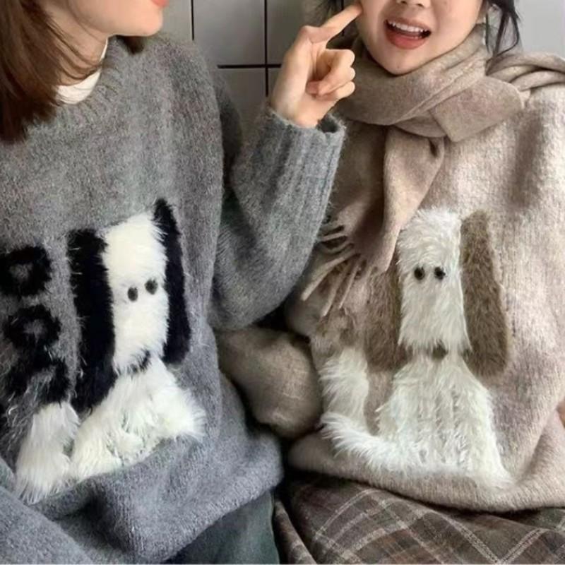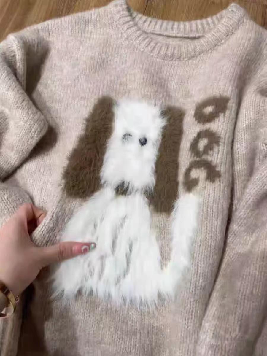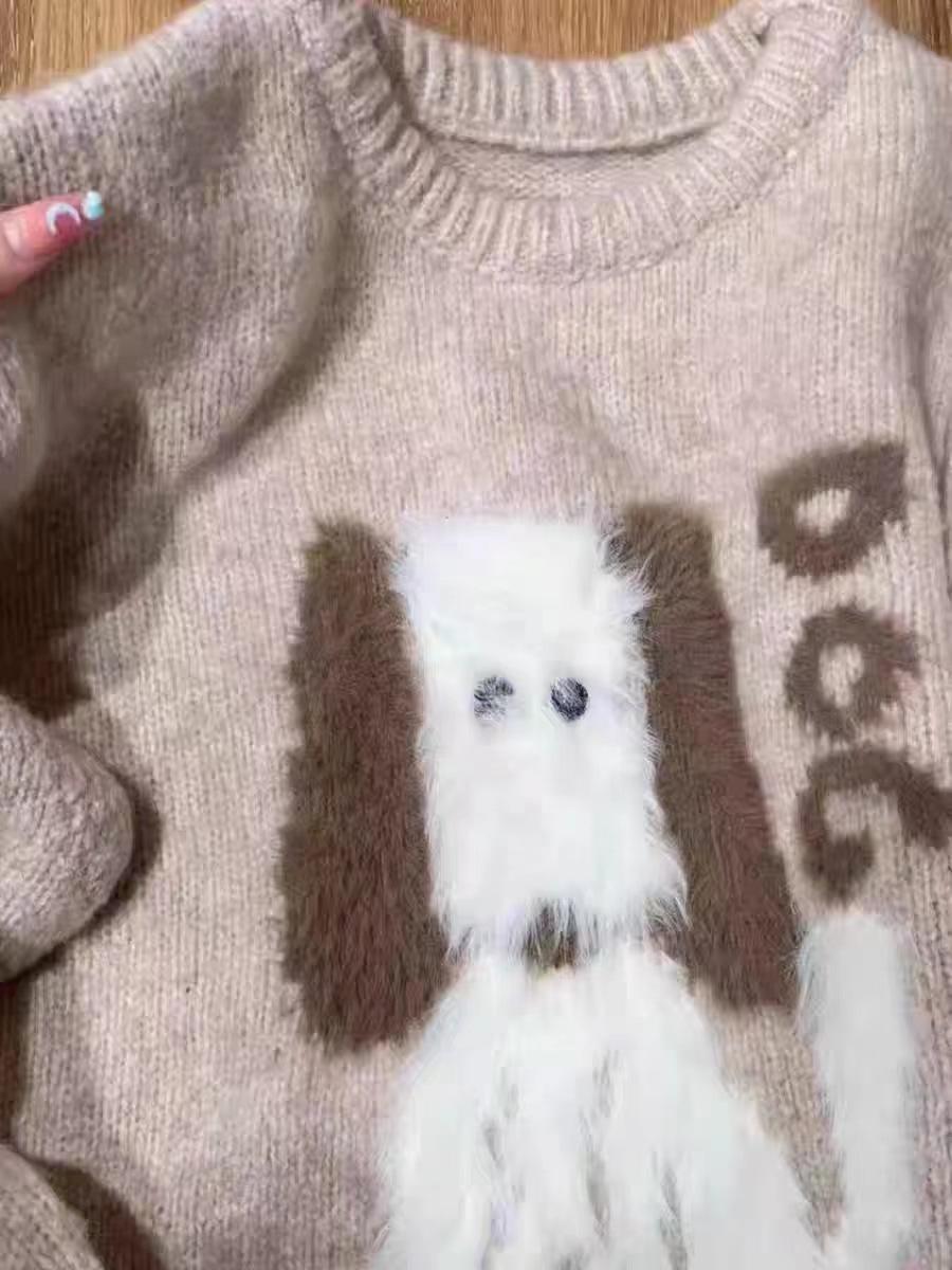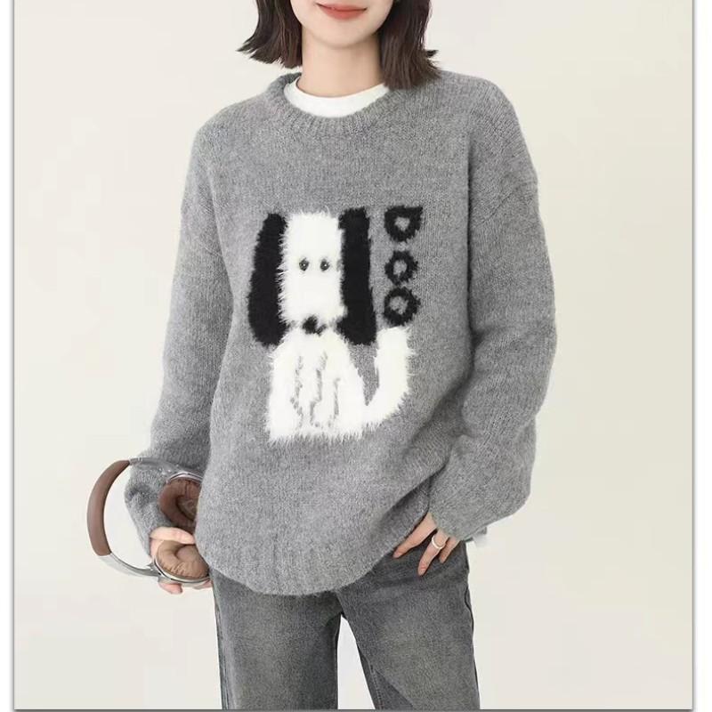 Suéter Tejido Jersey Cuello Redondo Moderno Holgado Top Perezoso Novedad Moderno Combinable Otoño e Invierno Suéter Holgado de Cachorro de Dibujos Animados para Mujer