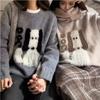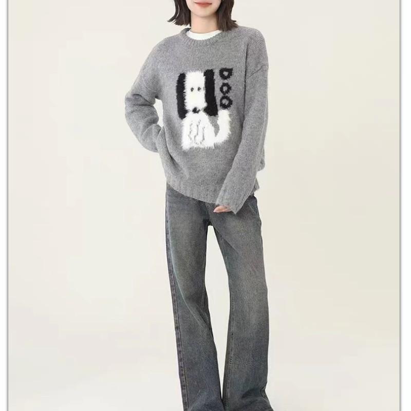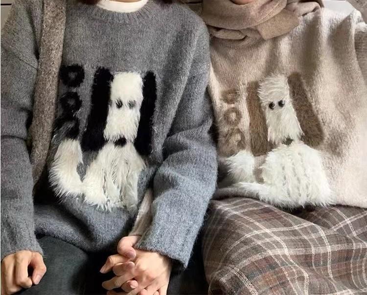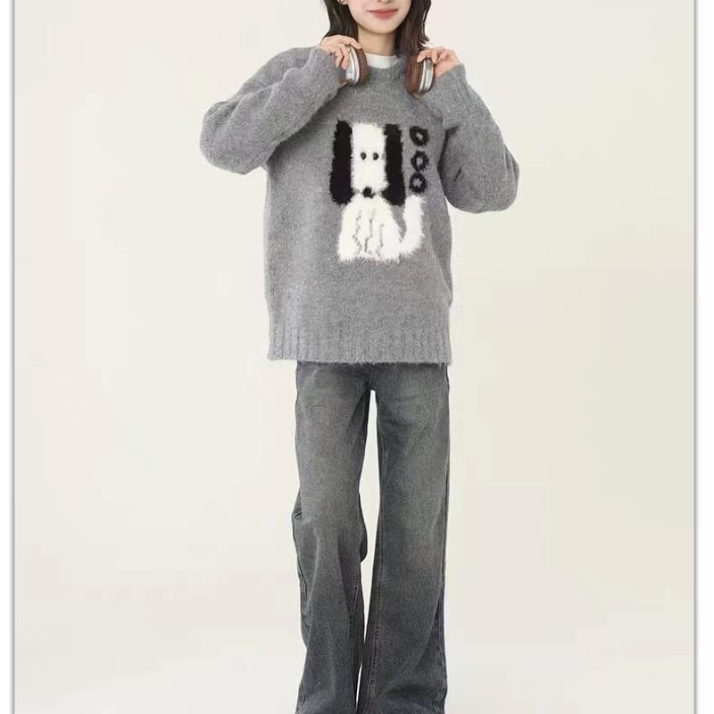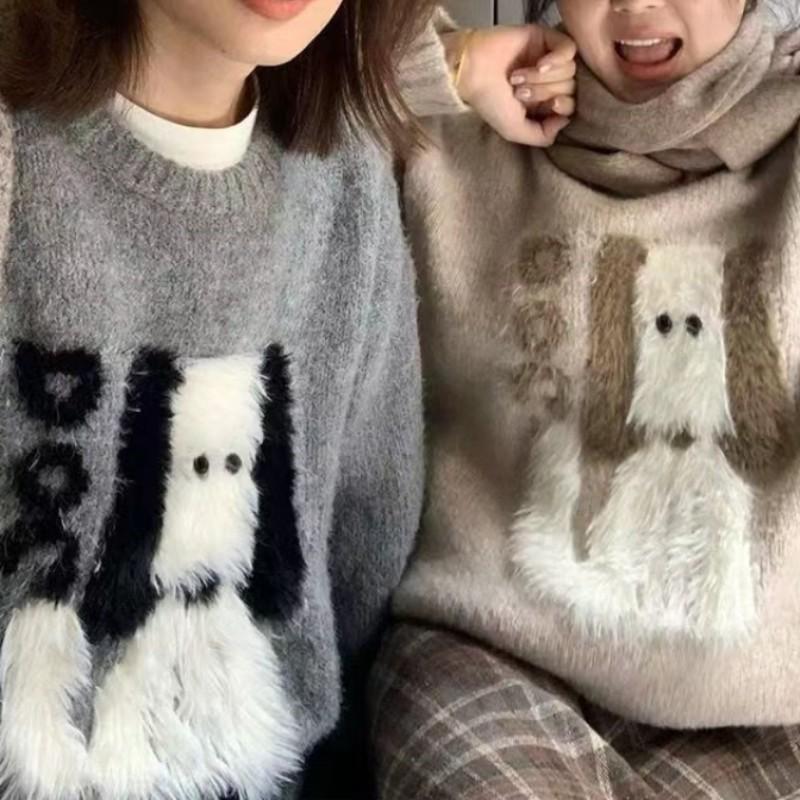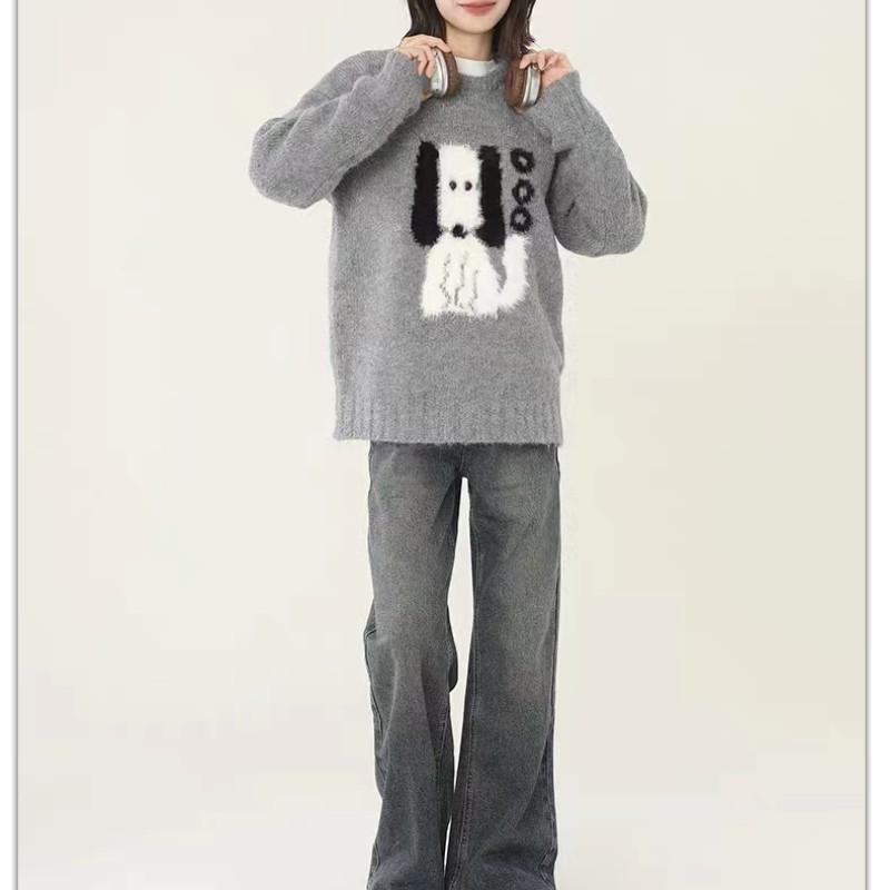 Suéter Tejido Jersey Cuello Redondo Moderno Holgado Top Perezoso Novedad Moderno Combinable Otoño e Invierno Suéter Holgado de Cachorro de Dibujos Animados para Mujer